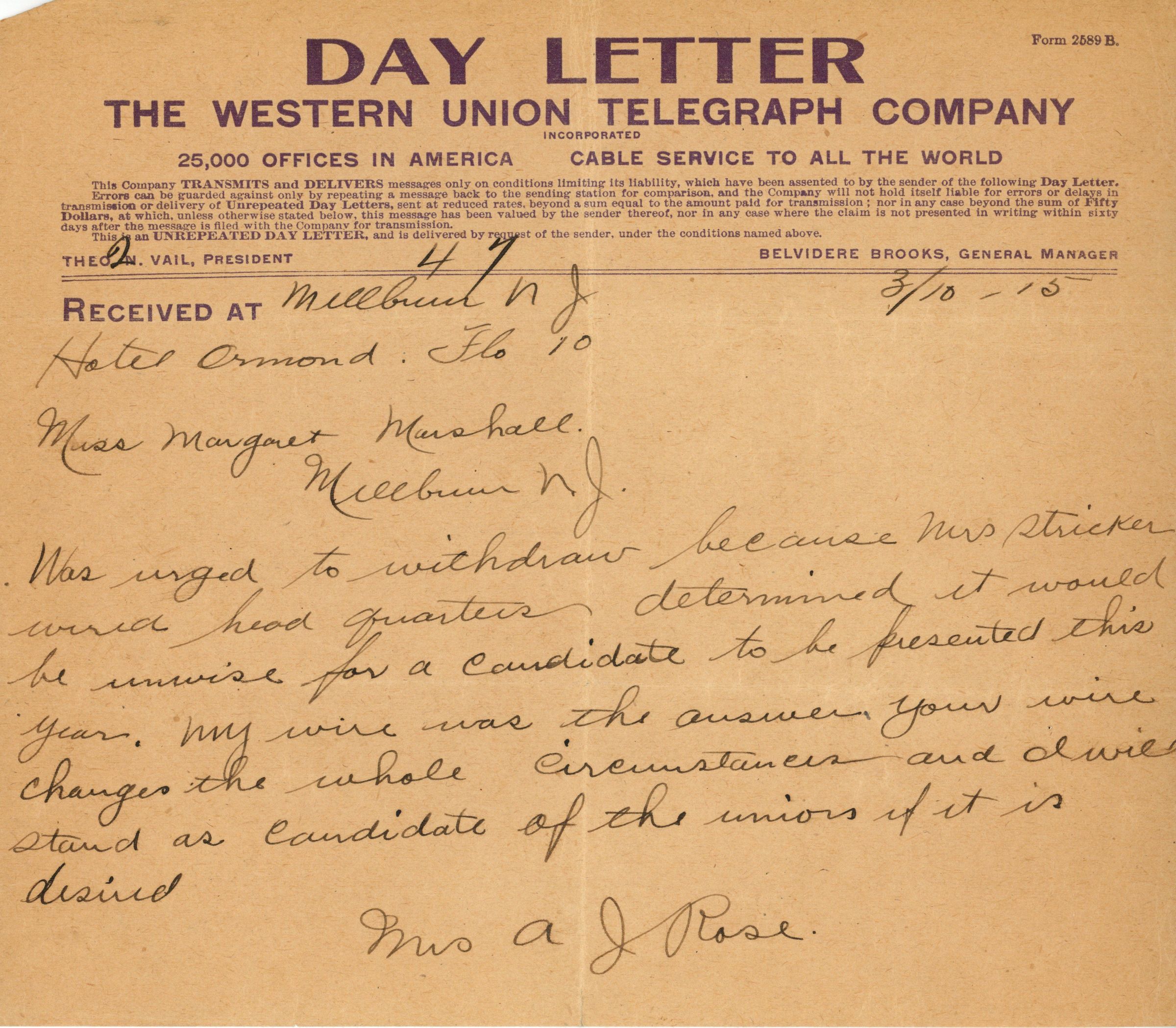 Telegraph messages between Margaret Marshall and Cornelia Bruere Rose on March 10, 1915 regarding Rose's withdrawal as a candidate for the Millburn Board of Education. Rose had been advised by the President of the organization, Marion Strickler to withdraw. The ensuing controversy led Strickler to resign her presidency.