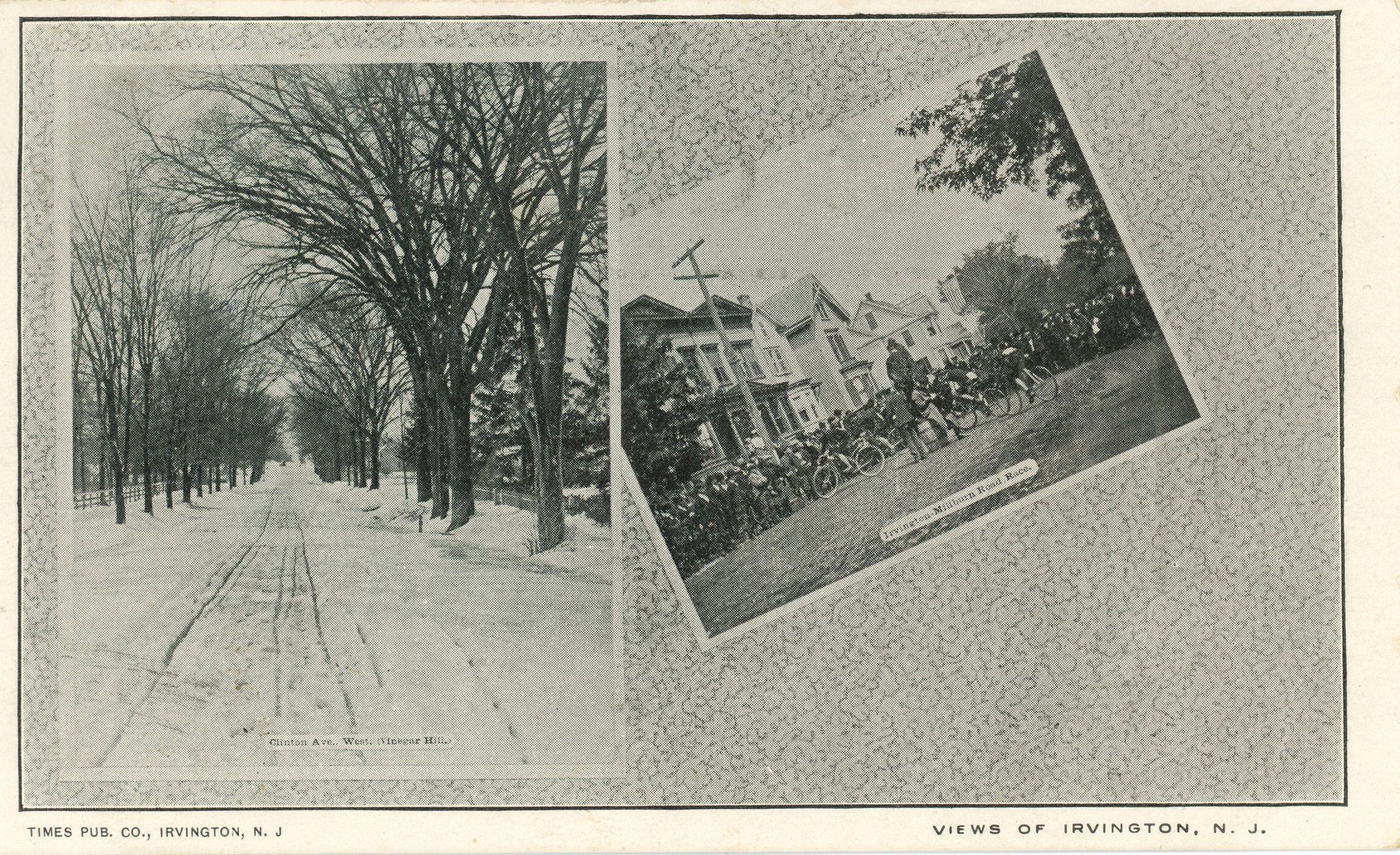 Postally unused B&W photographic postcard "Views of Irvington, N.J." featuring a photograph of the Irvington-Millburn Road Race and a view of Clinton Ave., West.