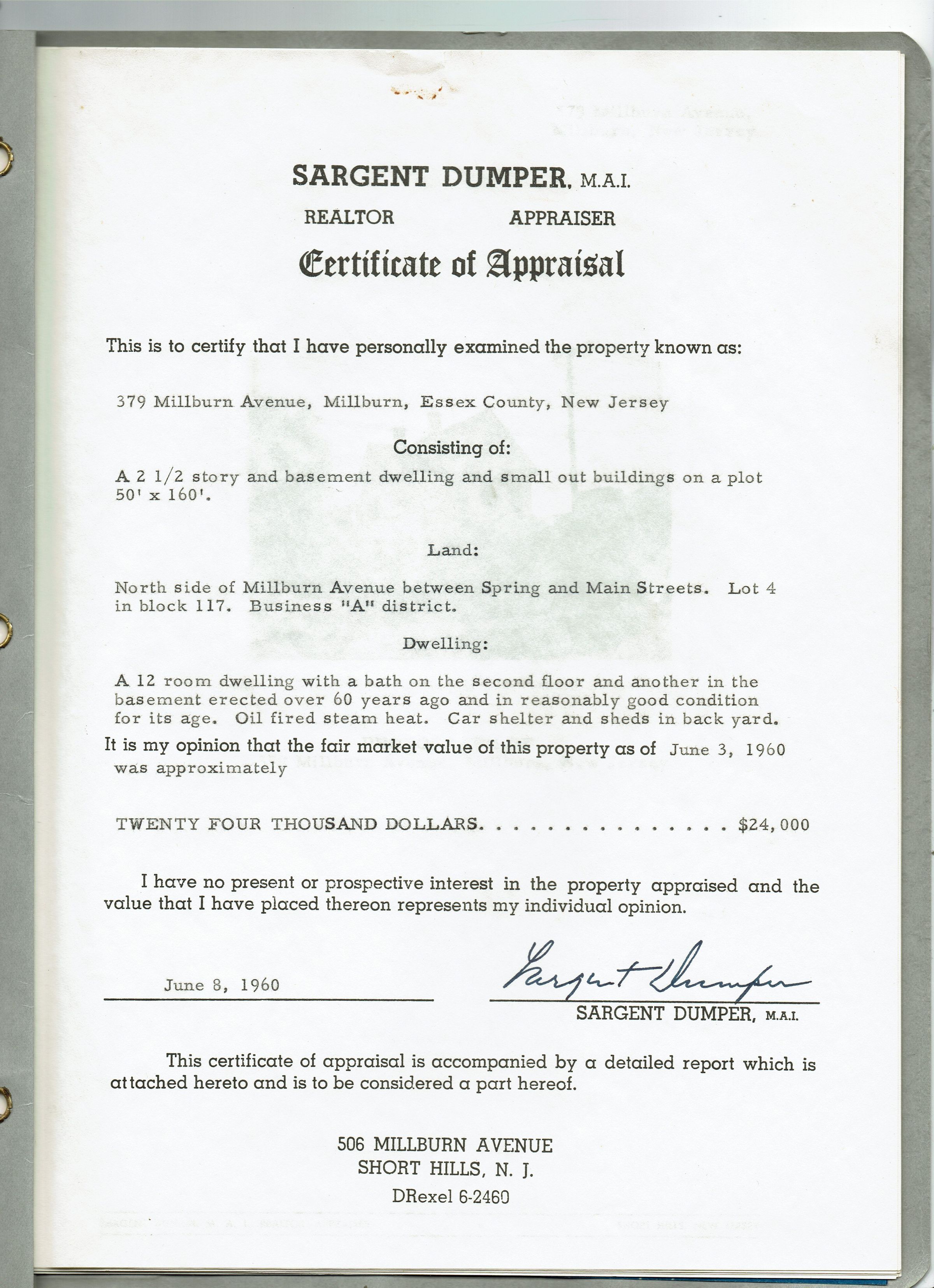Photograph of 379 Millburn Avenue, property and residence of the Partington family from 1897-1960. Photograph appears in the Certificate of Appraisal conducted by Sargent Dumper on June 8, 1960. The house was located between an Esso Station and Rimback's Storage on Millburn Avenue. See Title Abstract and Deed to this property in files. 9 pp. with 1 page blueprint of property.