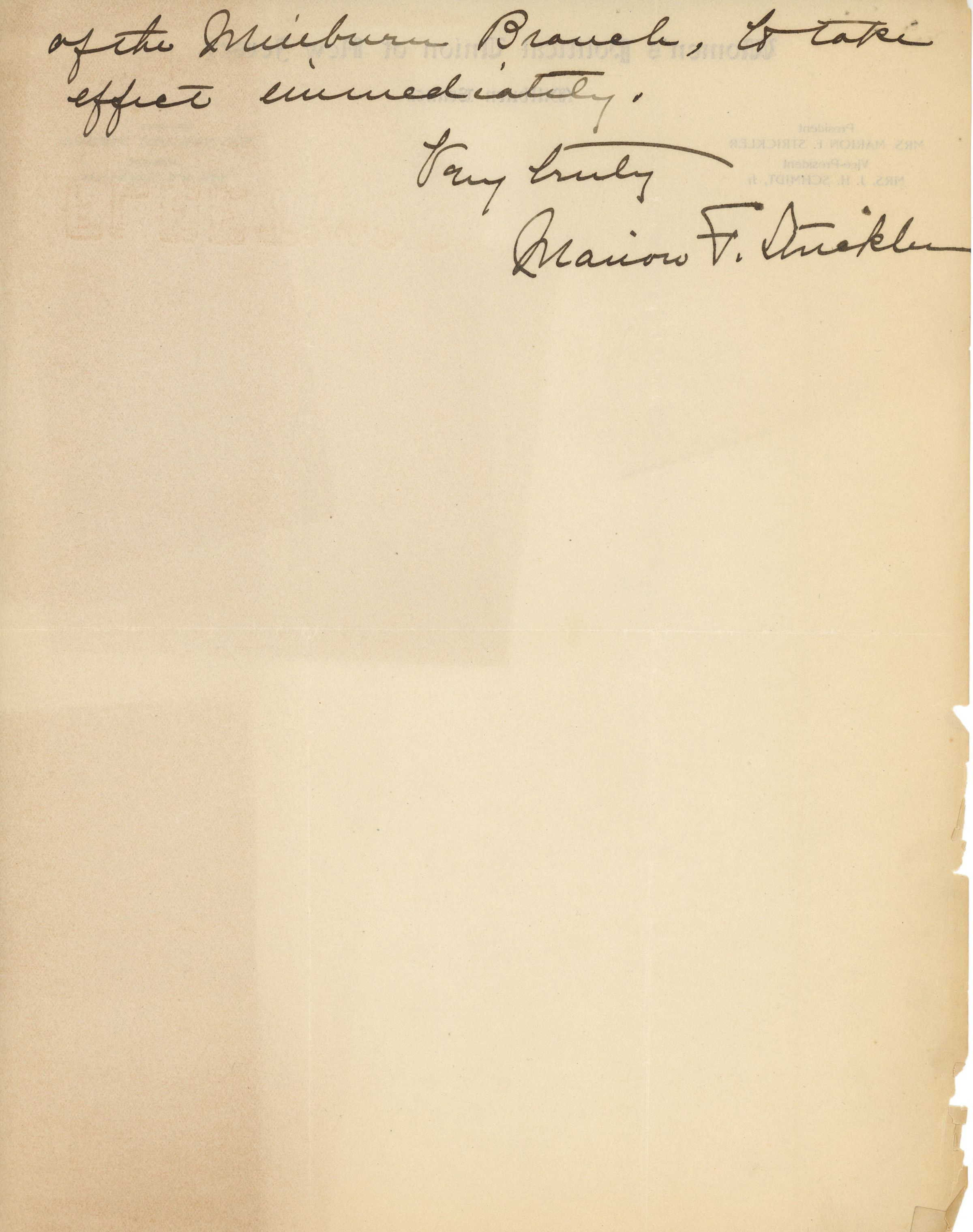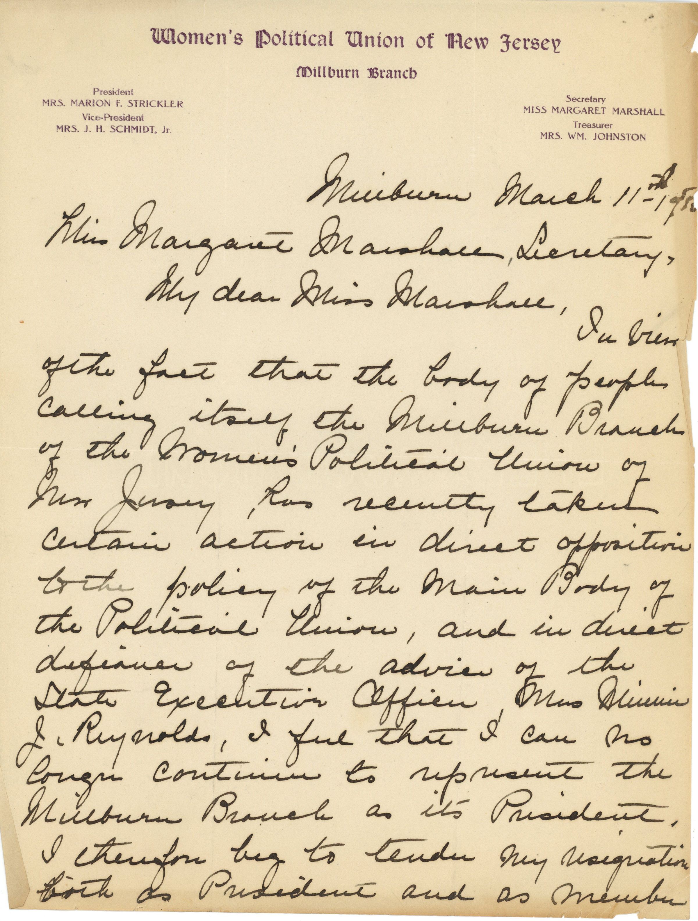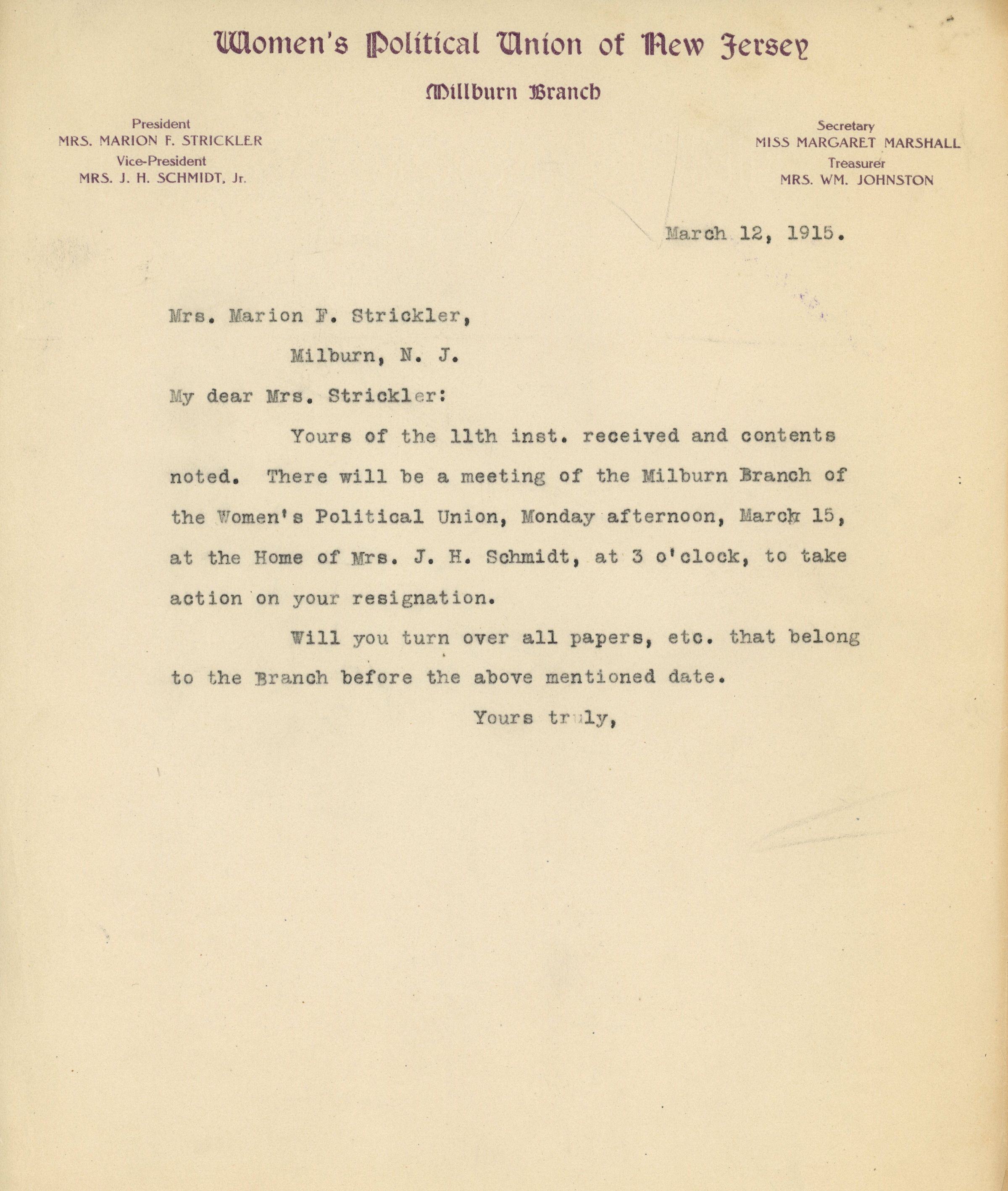 1. Handwritten two-page letter from Marion F. Strickler to Margaret Marshall dated Millburn, March 11, 1915 tendering her resignation as President of the Millburn Branch of the Women's Political Union of New Jersey.