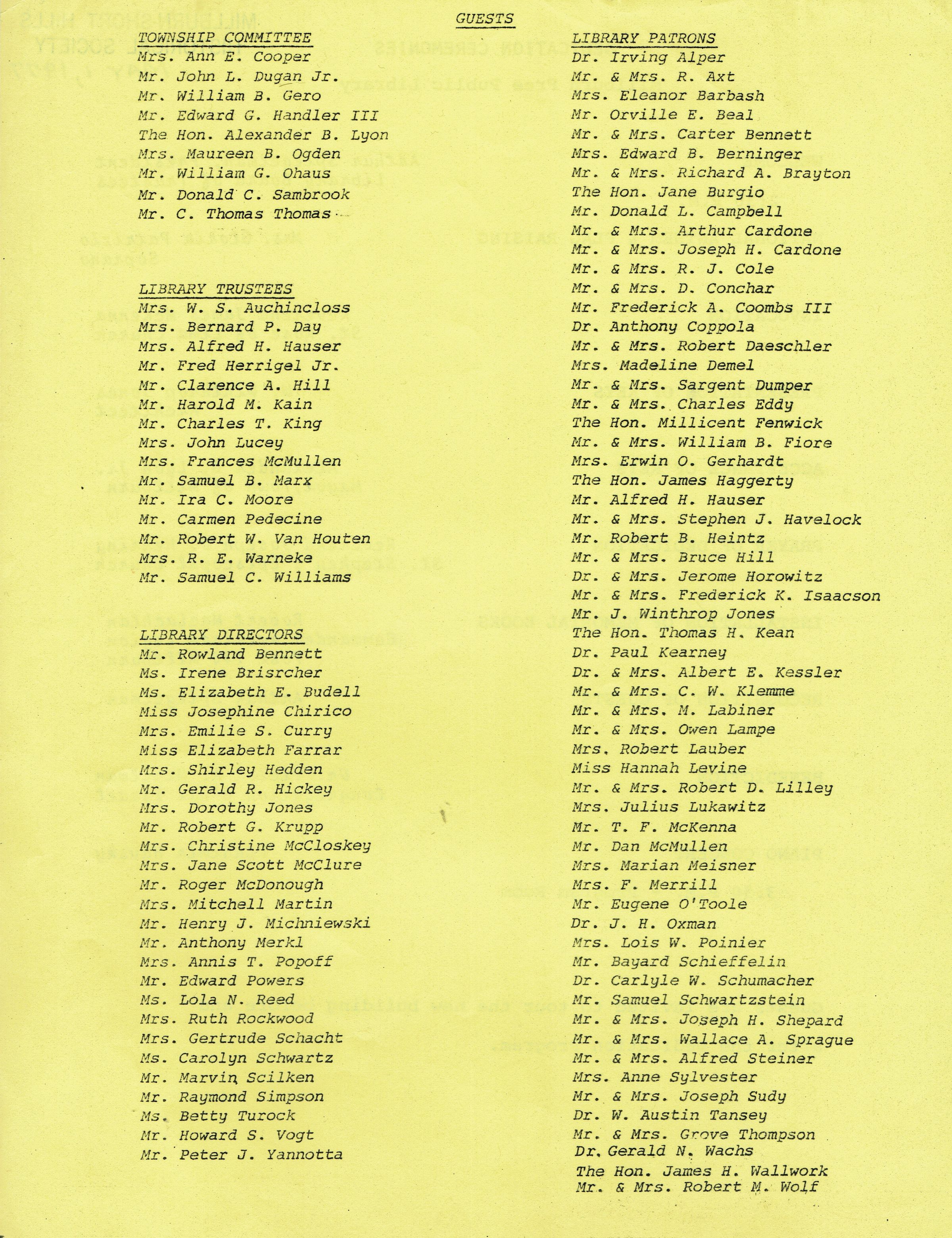Millburn Library Dedication Ceremony Program and Documents, 1977