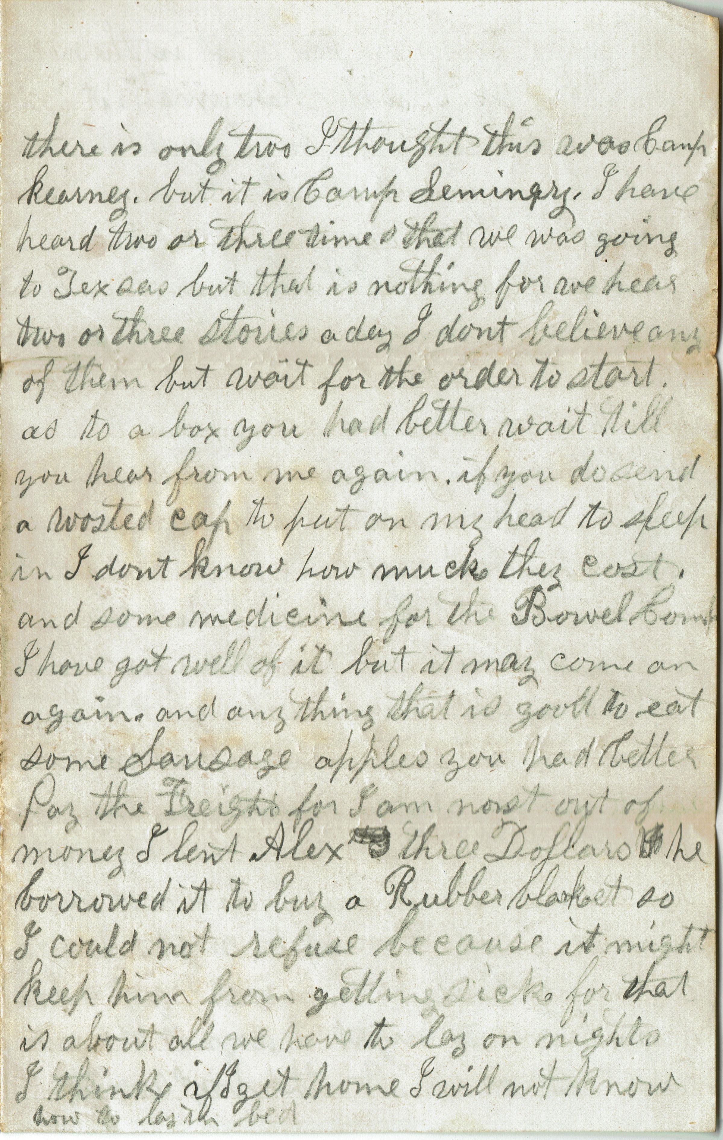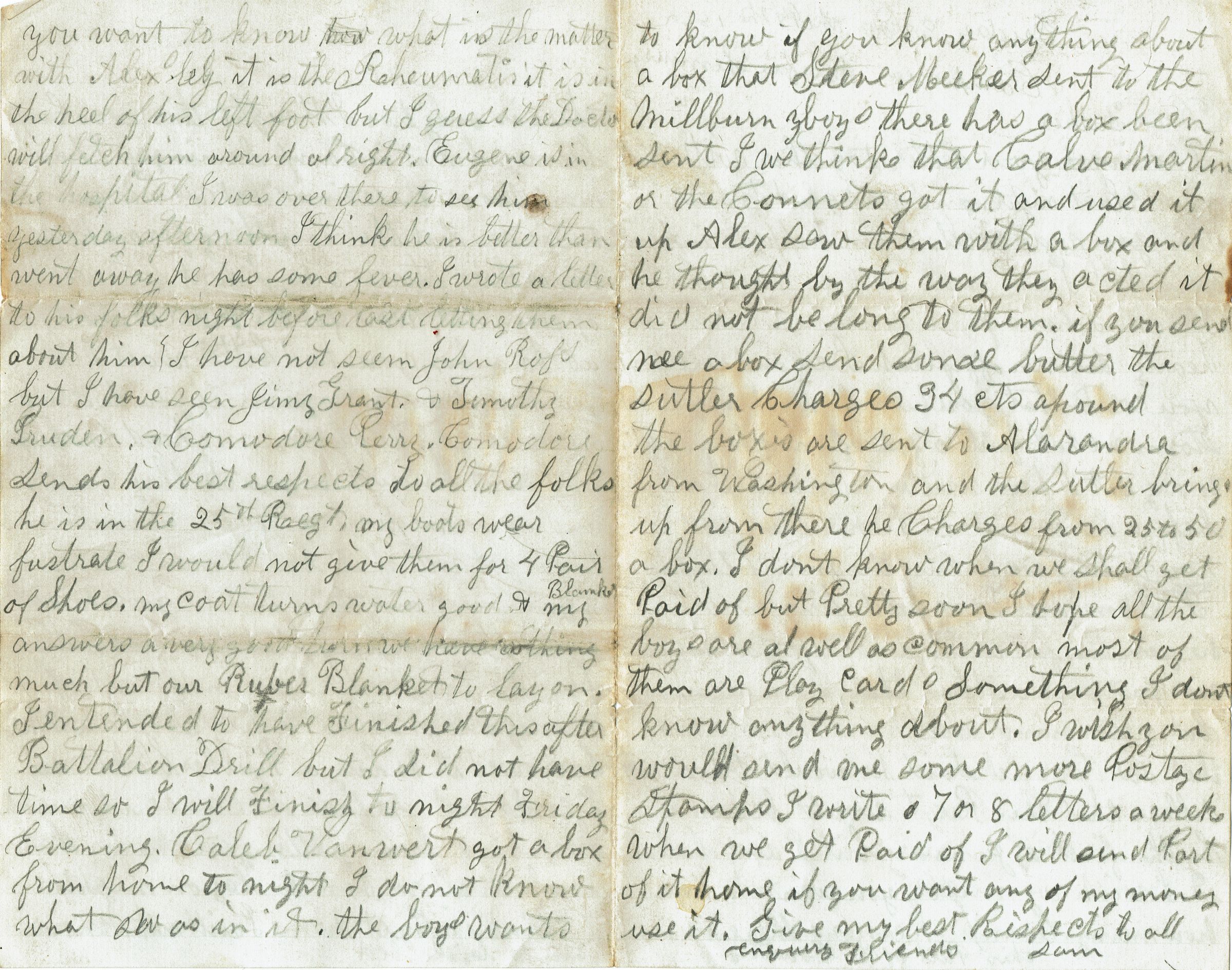 Letter from Samuel B. Parsil to his father dated November 14, 1862, while serving with the 27th NJ Infantry at Camp Casey near Fairfax Seminary, Virginia. Mentions lending Alex $3.00 to buy a rubber blanket, because it might help to keep him from getting sick. Mentions several people from home, including Caleb Van Wert.