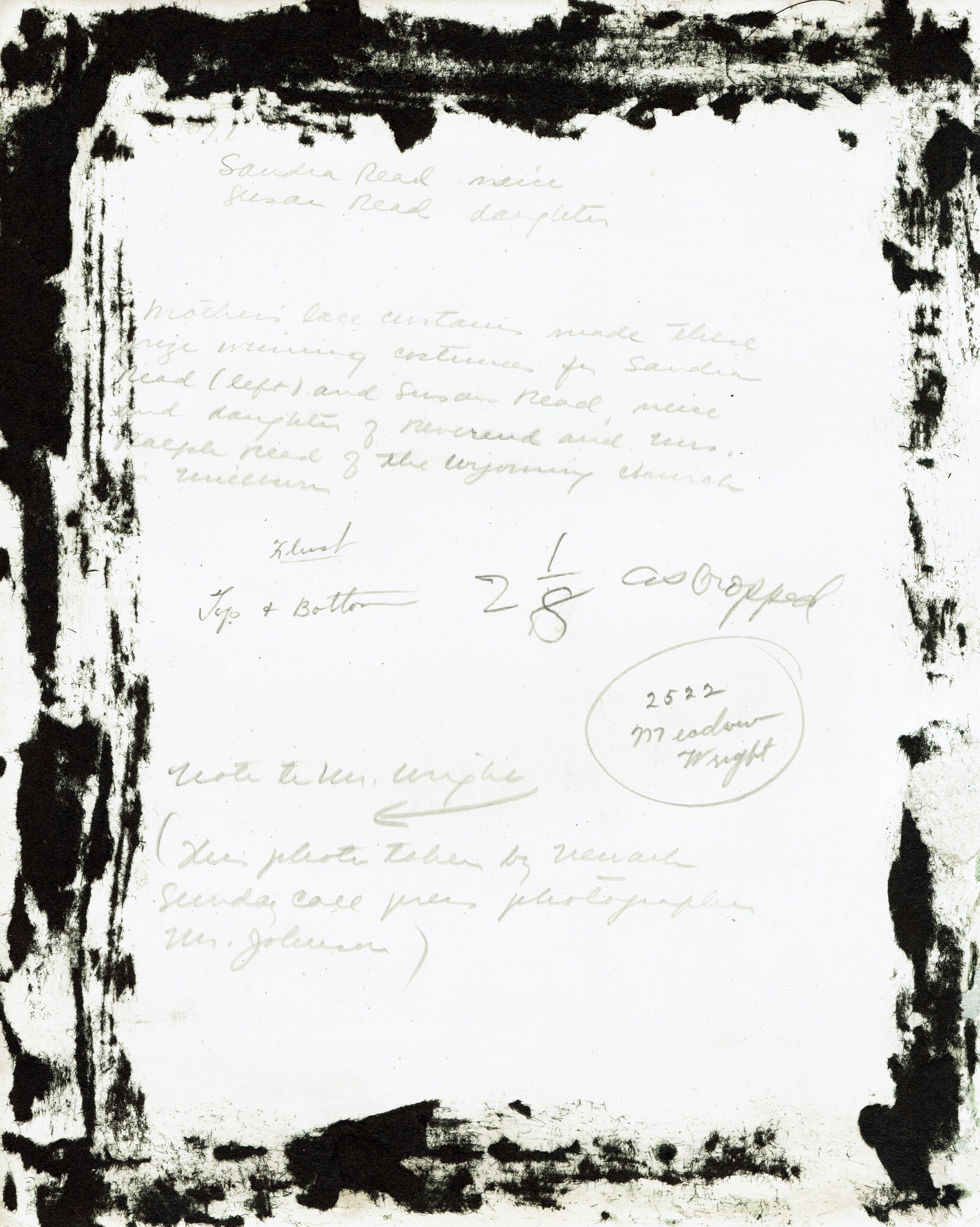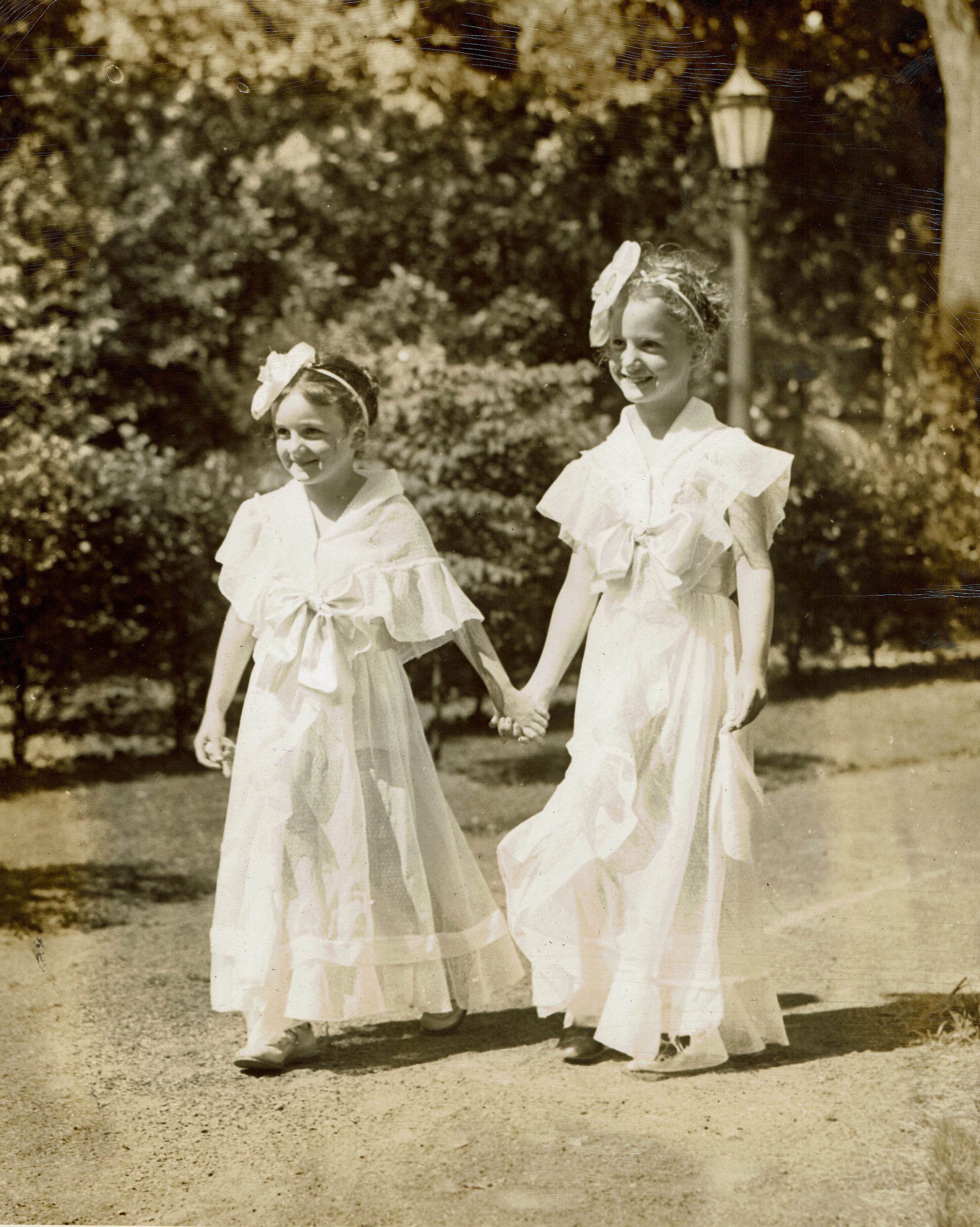 Press photograph of Sandra and Susan Read, winners of the June 3, 1944 Village Festival Costume Contest in Taylor Park. Caption on back of photograph reads, "Mother's lace curtains made these prize winning costumes for Sandra Read (left) and Susan Read, Niece and daughter of Reverend and Mrs. Ralph Read of the Wyoming Church, Millburn.