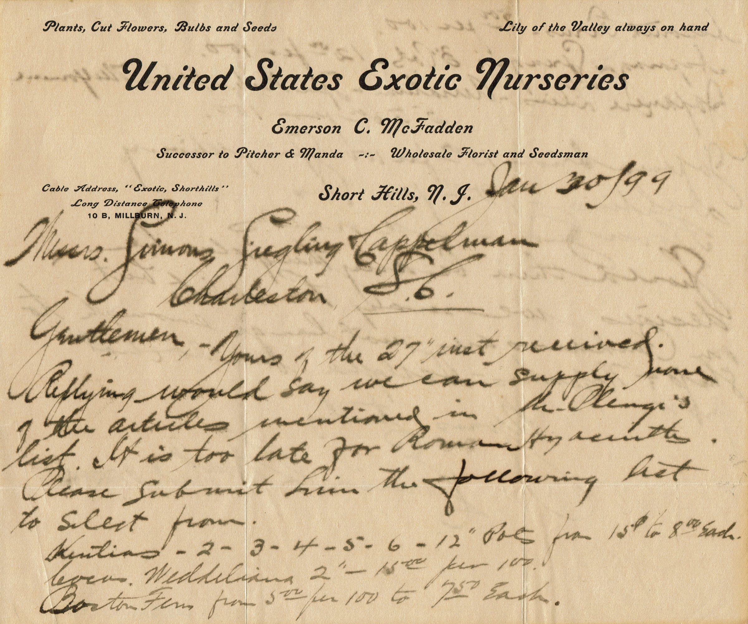 United States Exotic Nurseries invoice dated January 30, 1899 confirming supply of flowers to the Cappelman's in Charleston, South Carolina and signed by Emerson C. McFadden, Successor to Pitcher & Manda, Wholesale Forist and Seedsman, Short Hills, NJ.