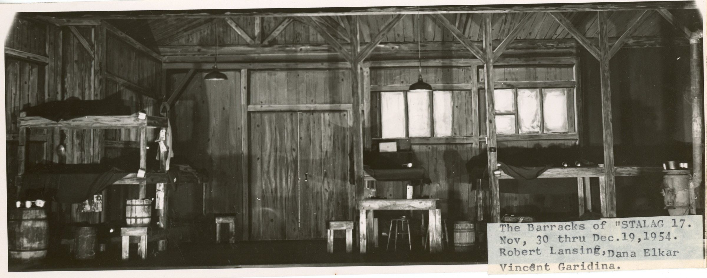 Press photograph of the Barracks in the Paper Mill Playhouse Production of "Stalag 17," November 30-December 19, 1954. The production starred Robert Lansing, Dana Elkar, and Vincent Gardina.
