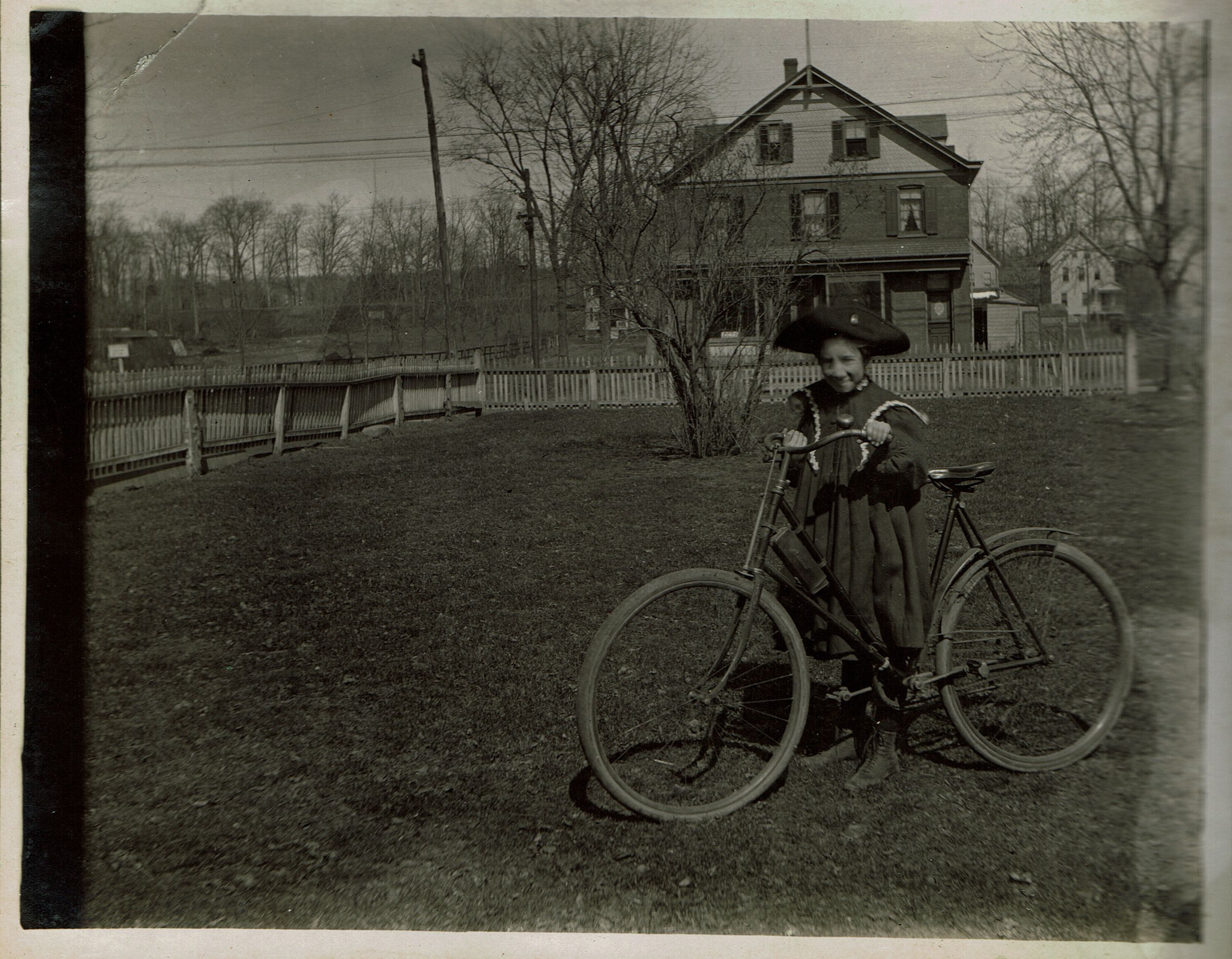 Marshall daughter (Marion or Margaret) standing in her fenced in yard on the corner of Taylor and Spring Streets. Photo is looking toward the railroad. Gentzel's store (second location at 387 Millburn Avenue) can be seen in the background. Album photographs date from c. 1908. Page 37, bottom image.