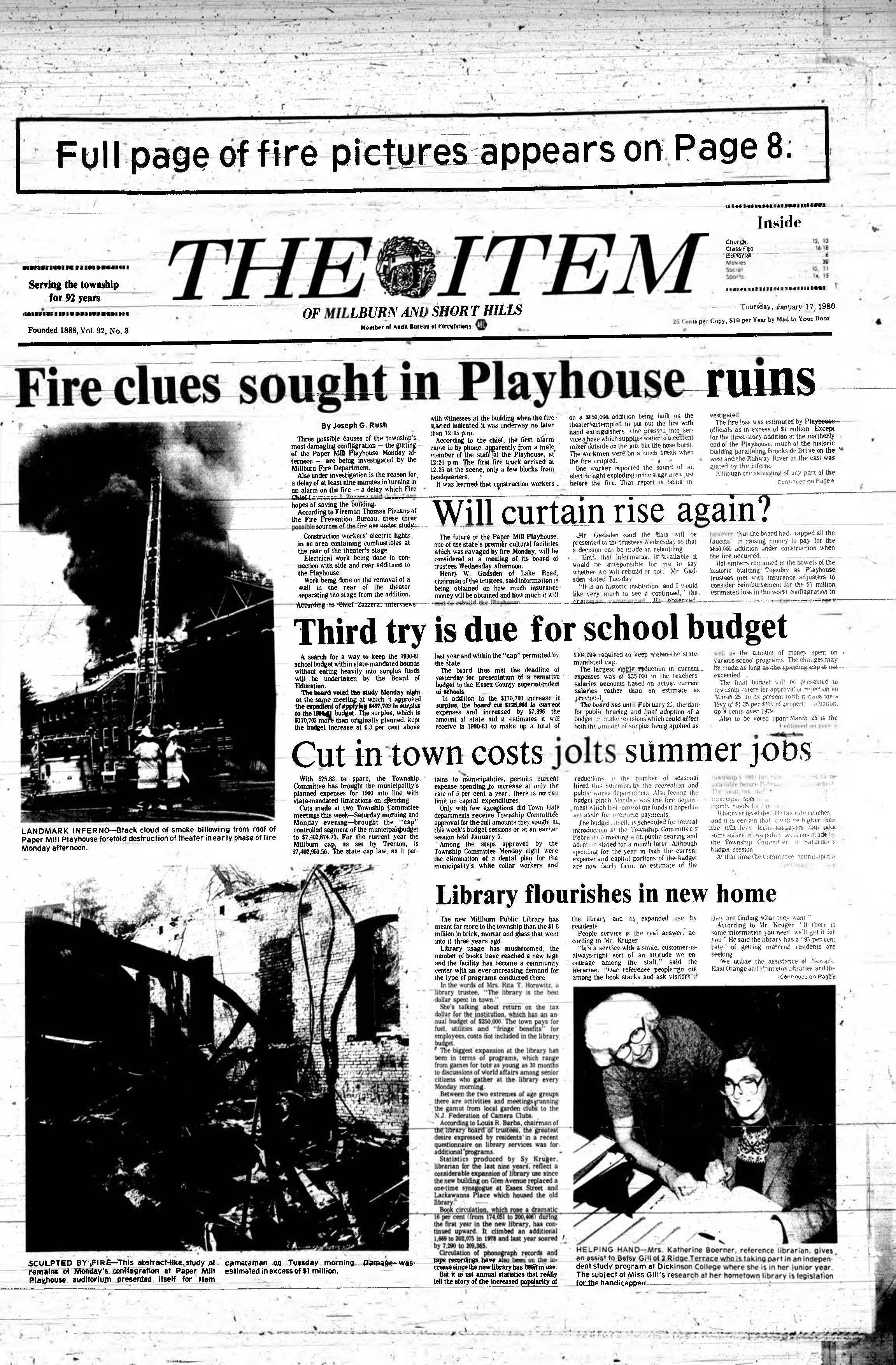 Articles on the 1980 Fire at the Paper Mill Playhouse in the Short Hills-Millburn Independent Press and The Item. Independent Press (January 16, 1980) 2 pages, extensively illustrated with B&W photographs. The Item (January 17, 1980) 3 pages, extensively illustrated with B&W photographs.