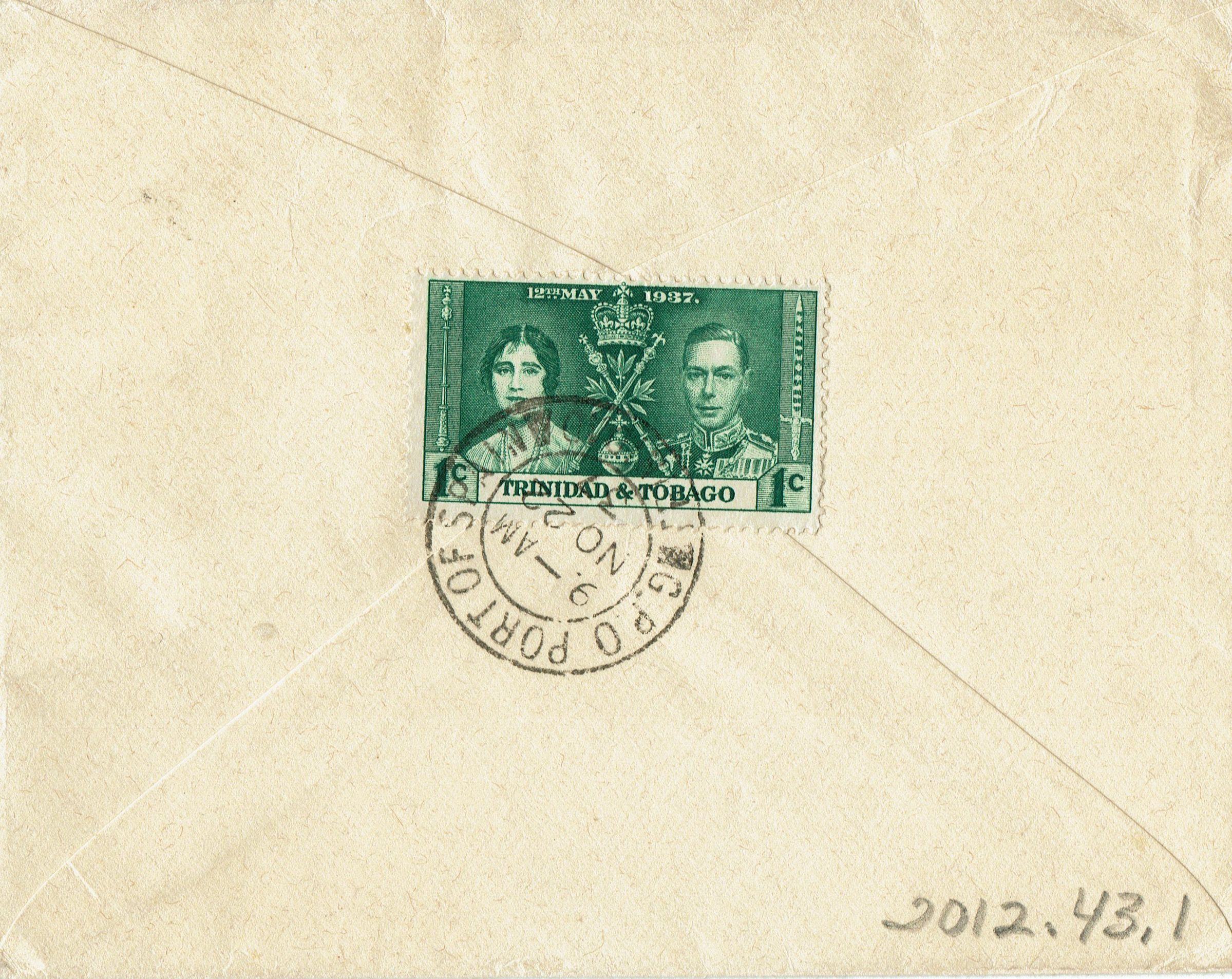 Envelope sent from Trinidad & Tobago to Mr. and Mrs. W. Kirk at Hobart avenue, Short Hills. Postmark is November 22.