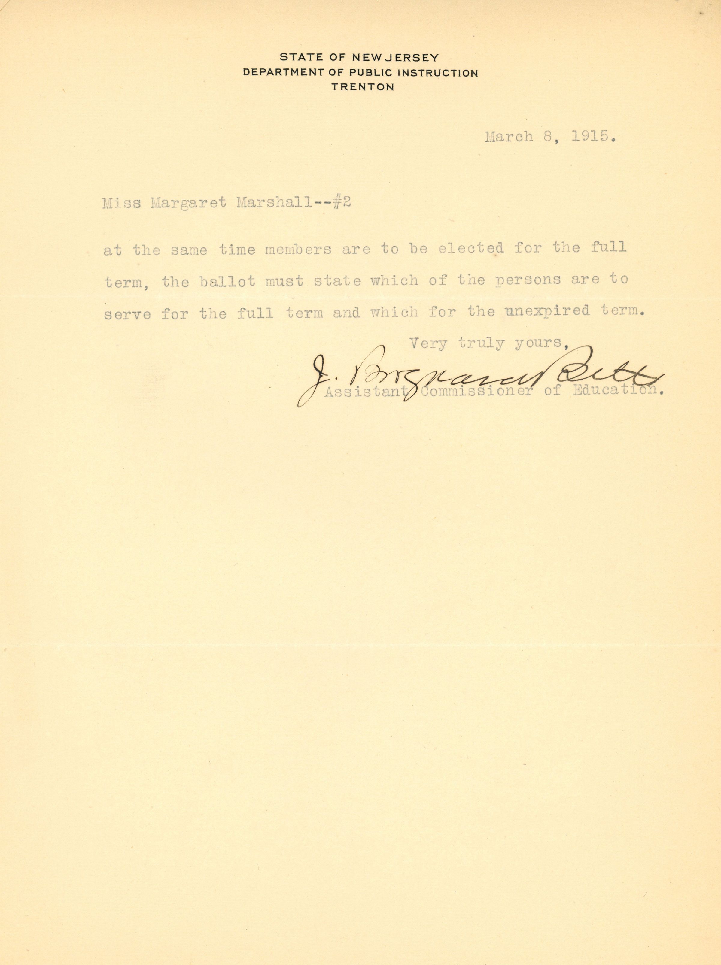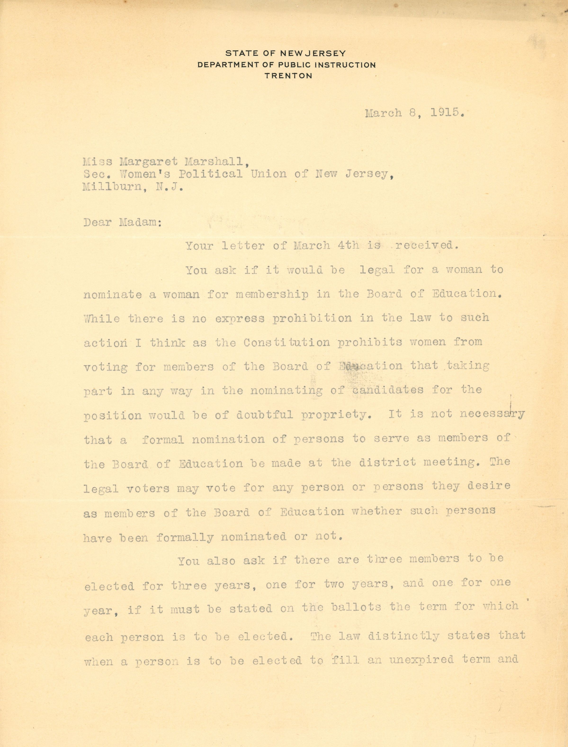 2. Two-page typed response form the New Jersey Assistant Commissioner of Education to Margaret Marshall regarding women's rights to nominate a woman for membership on the Board of Education. Marshall was informed that "as the Constitution prohibits women from voting for members of the Board of Education, taking part in any way in the nominating of candidates for the position would be of doubtful propriety."