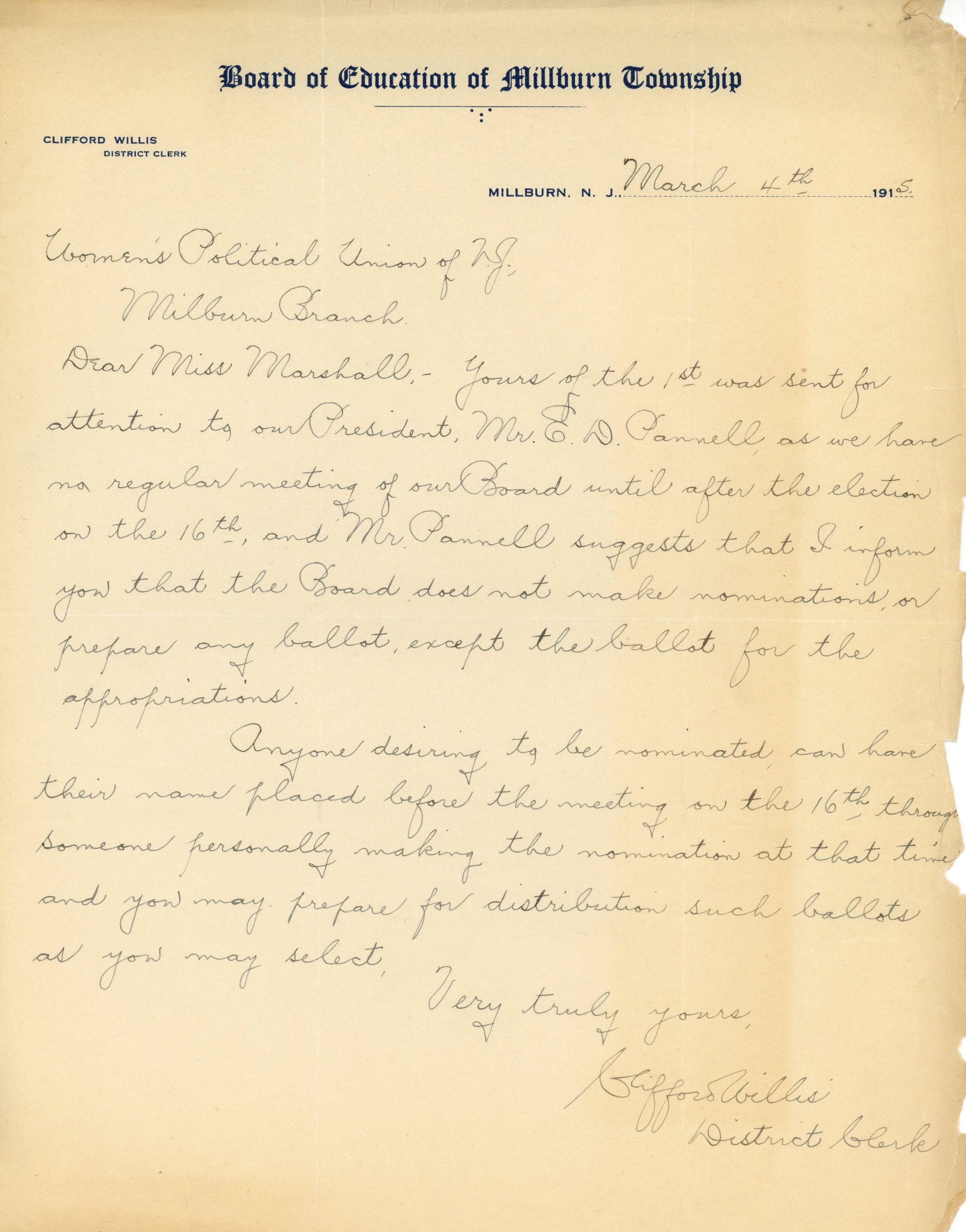Two letters regarding women's rights to nominate a female candidate for Board of Education and the nomination process. 1. Handwritten letter from Clifford Willis, District Clerk of the Millburn Township Board of Education addressed March 4, 1915 and addressed to Margaret Marshall is a response to Marshalls letter of March 1, 1915 to E.D. Pannell, President of the Board of Education. Willis responds that the Board does not make nominations or prepare any ballot, except the ballot for appropriations and anyone may have their name placed on the ballot before the next meeting on March 16.