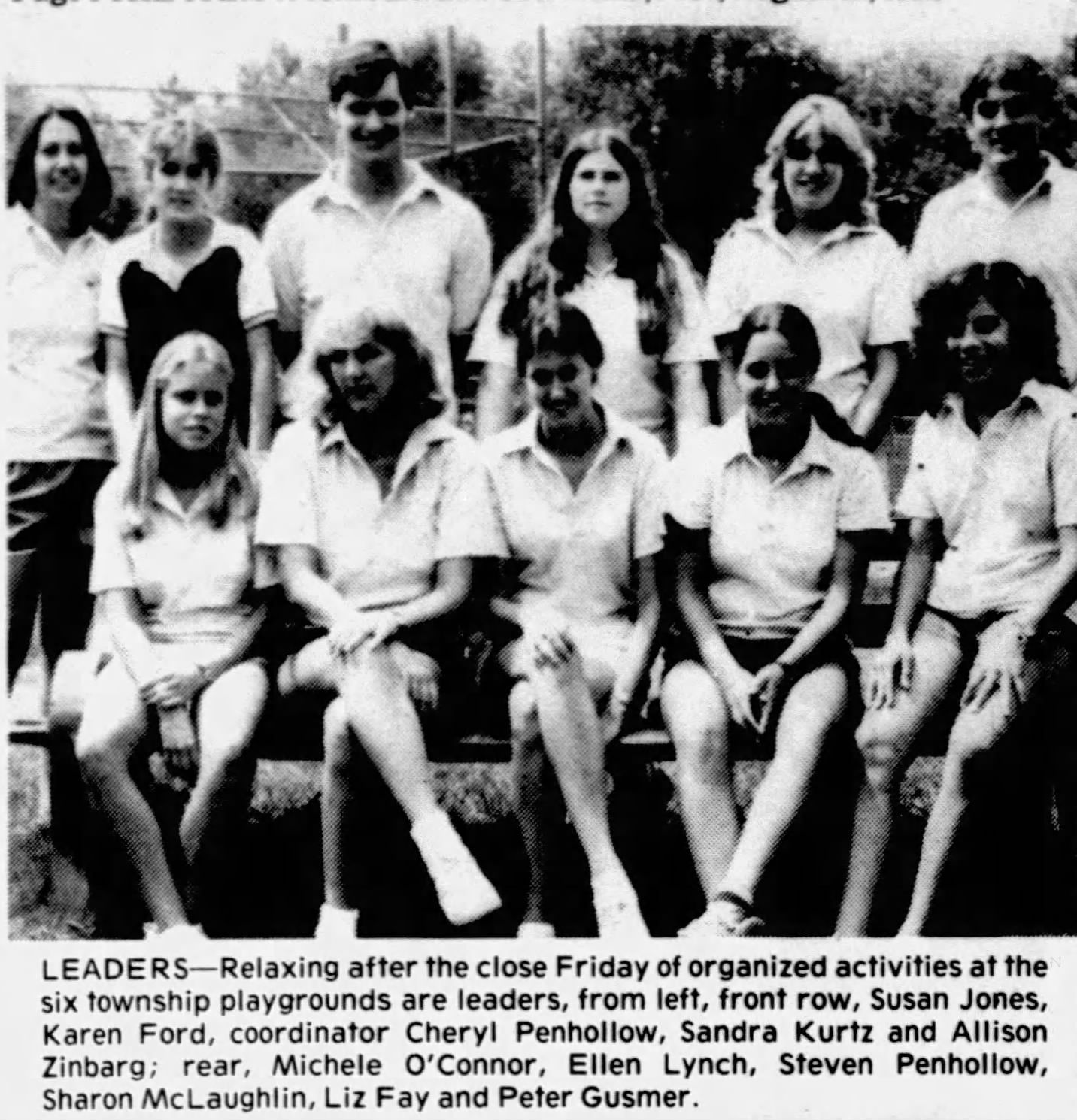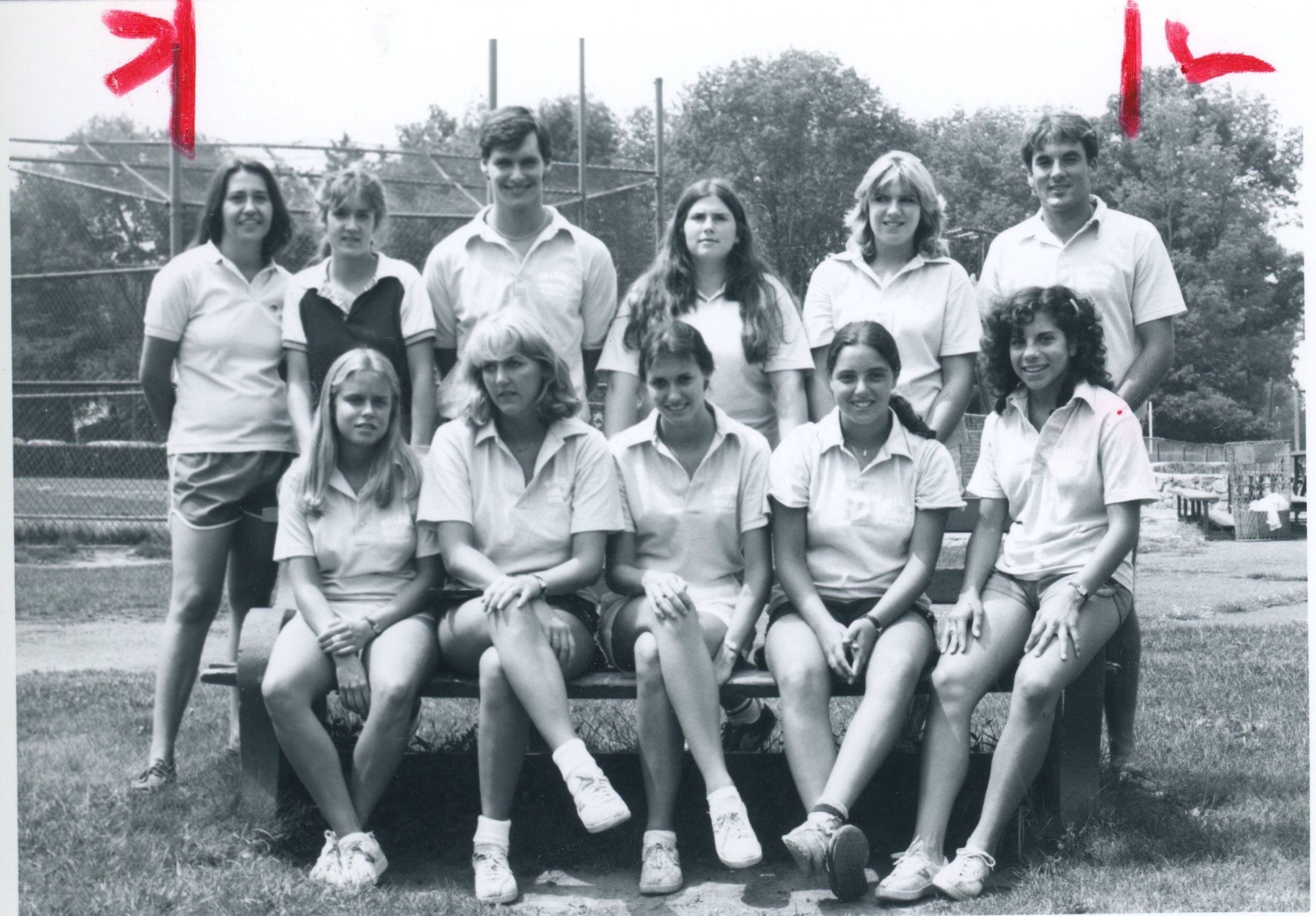 Photograph of the Millburn Department of Recreation Playground Leaders from summer 1982. Pictured in the photograph are: (left to right) Front Row-Susan Jones, Karen Ford, Cheryl Penhollow, Sandra Kurtz, Allison Zinbarg; Rear-Michele O'Connor, Ellen Lynch, Steven Penhollow, Sharon McLaughlin, Liz Fay and Peter Gusmer.