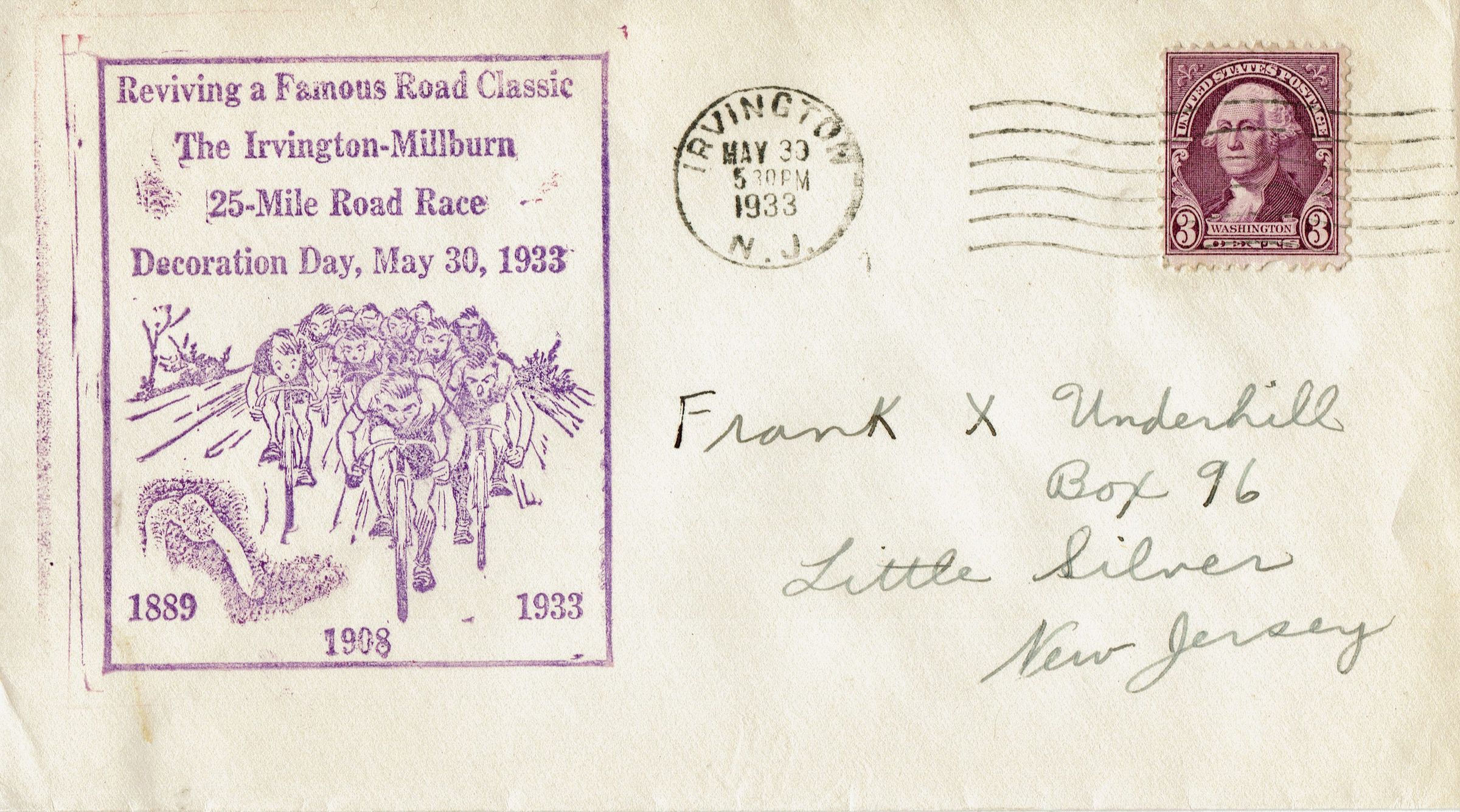First Day Cover for Irvington-Millburn 25-Mile Road Race Decoration Day, May 30, 1933.