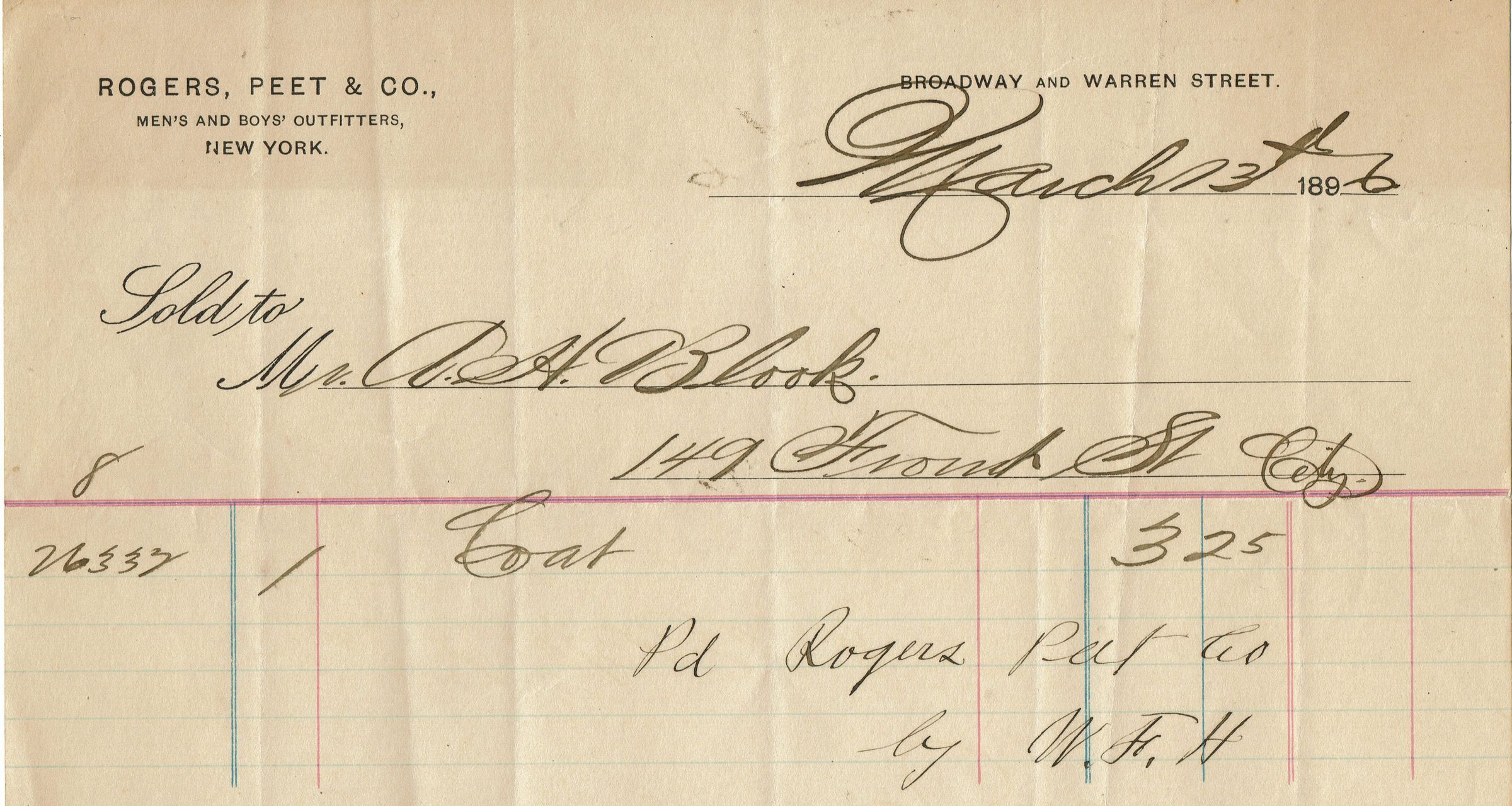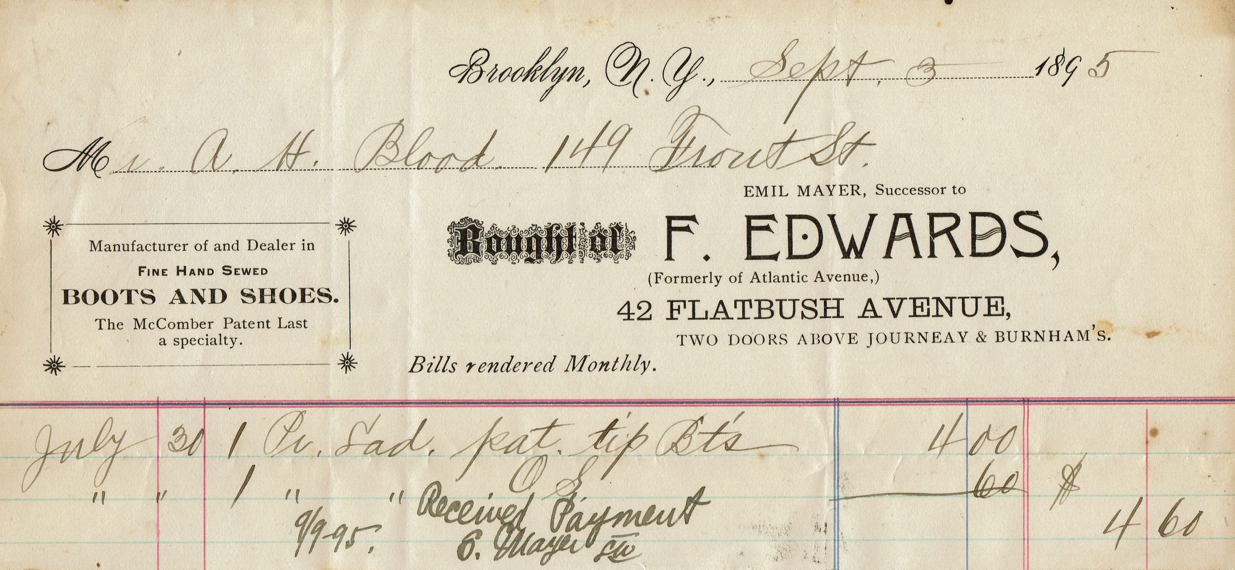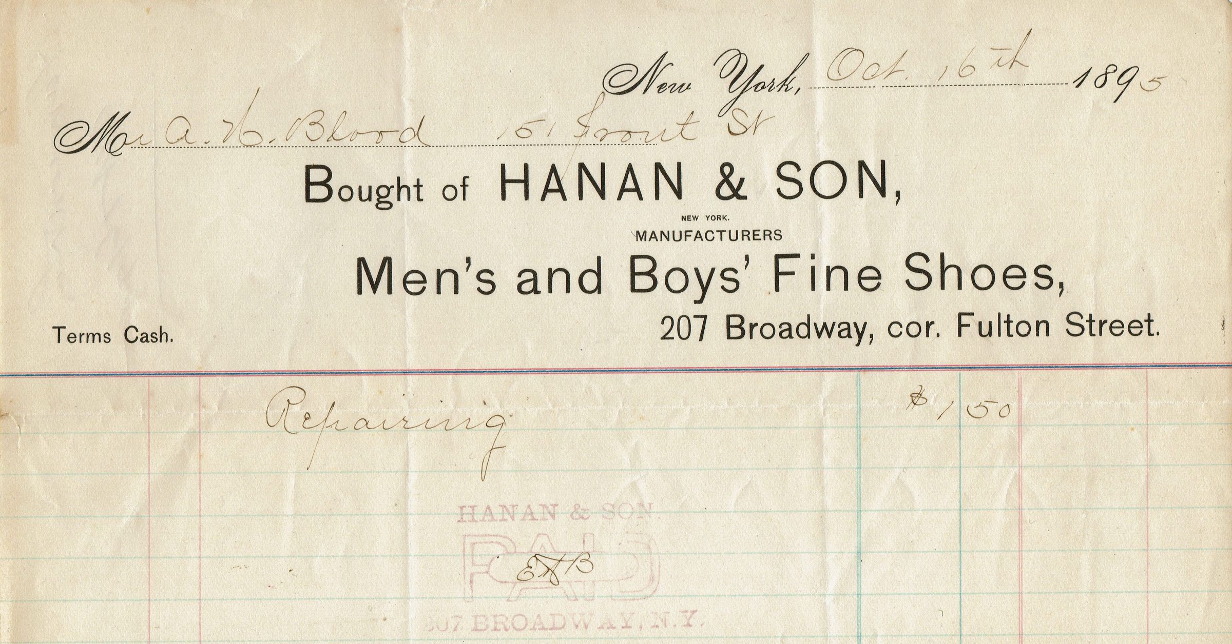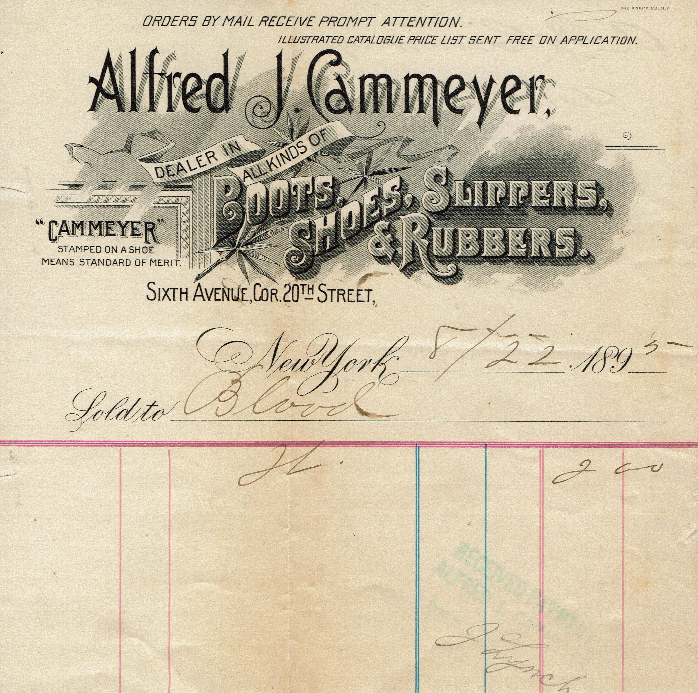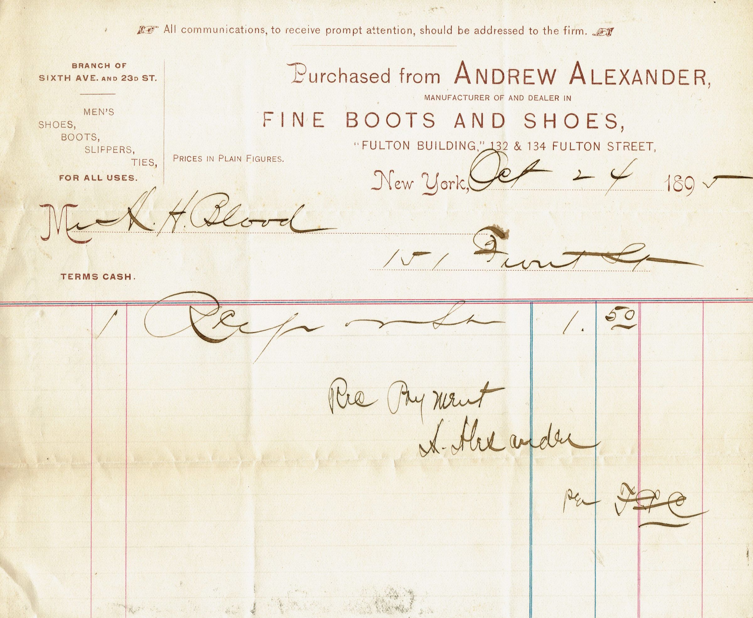 10 receipts for shoes, shoe repair and clothing for Alfred H. Blood from non-Millburn retailers dating from 1894-6. Retailers were: Alfred J. Cammeyer, 6th Avenue at 20th Street, New York (2 receipts), Hanan & Son's Men's and Boy's Shoes, 207 Broadway at the Corner of Fulton Street, New York (3 receipts), Andrew Alexander, Fulton Building at 132 & 134 Fulton Street, New York (1 receipt), F. Edwards, 42 Flatbush Avenue, Brooklyn (1 receipt), John H. Parker, 103 Bedford Street, Boston (1 receipt with note addressed to A.H. Blood, 149 & 151 Front Street), O. Kaiser (1 receipt for suit pressing), Rogers, Peet & Co, New York (1 receipt for a Coat).