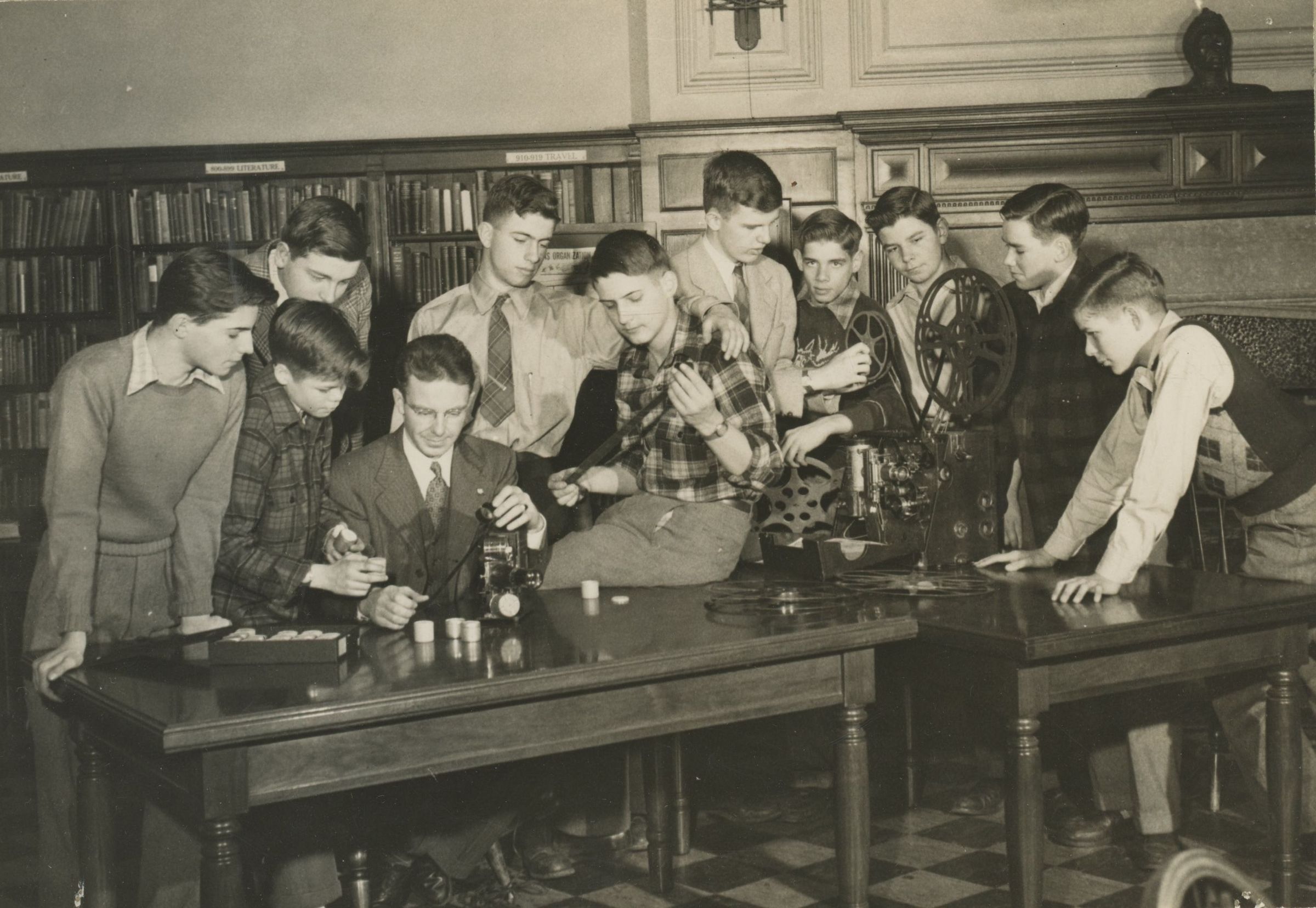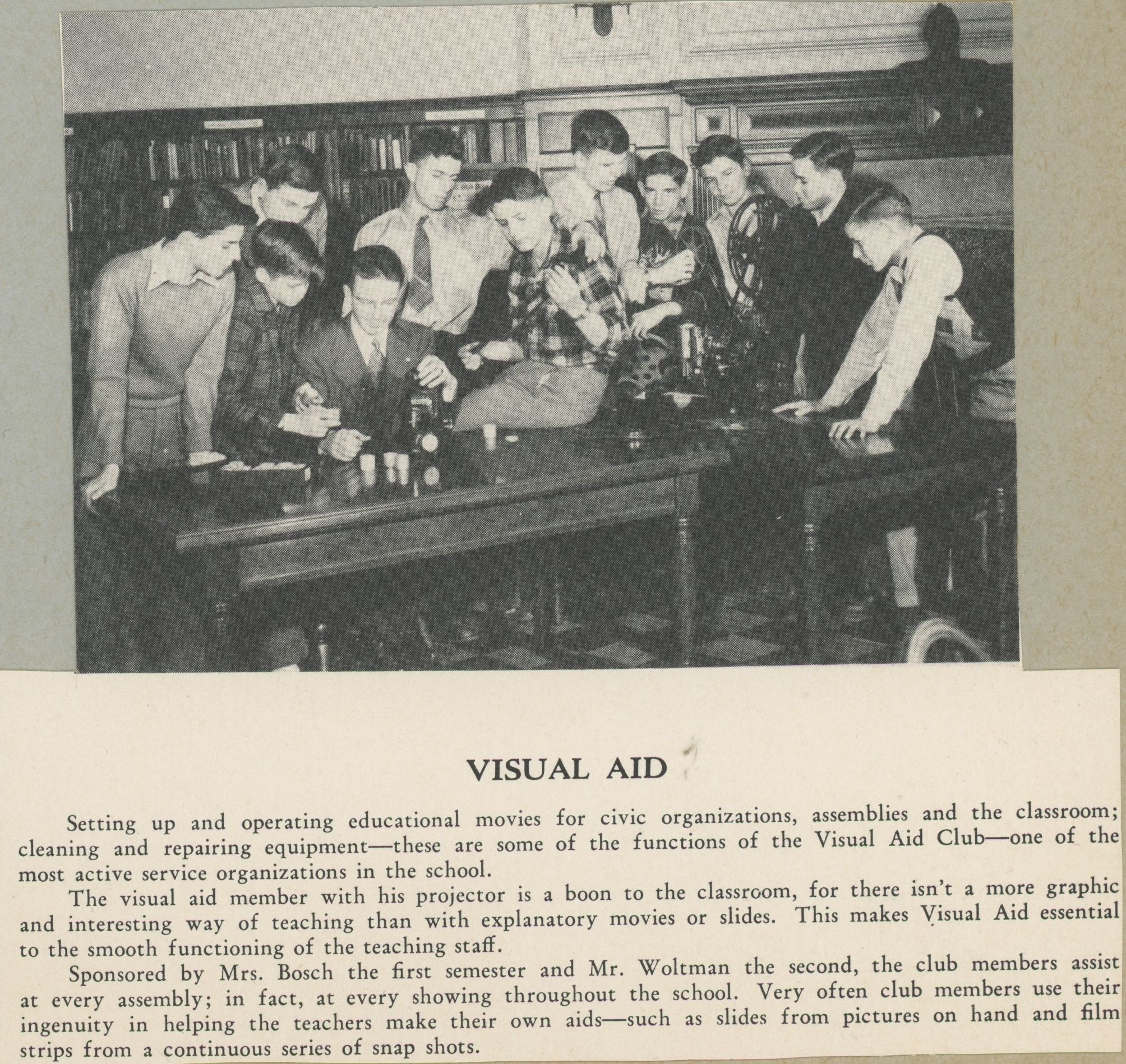Photograph of the 1946 Millburn High School Visual Aid club from the Visual Aid-Audio Visual Club Scrapbook. The photograph was reproduced in a publication, mostly The Miller school newspaper with a caption describing the duties of the club, which was sponsored by Mrs. Bosch the first semester and then taken over by Mr. Woltman for the second semester. Harvey J. Woltman joined the Millburn School staff as a social sciences and history teacher in 1934 and retired in 1970. During that period, he became a driving force behind the development of Millburn School System's the audio visual department.