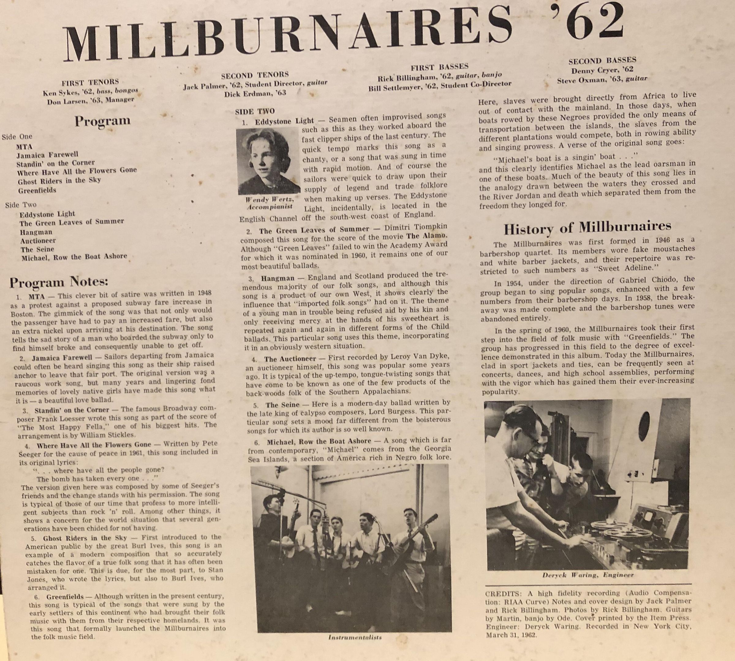 Millburnaires Record Album, 1962