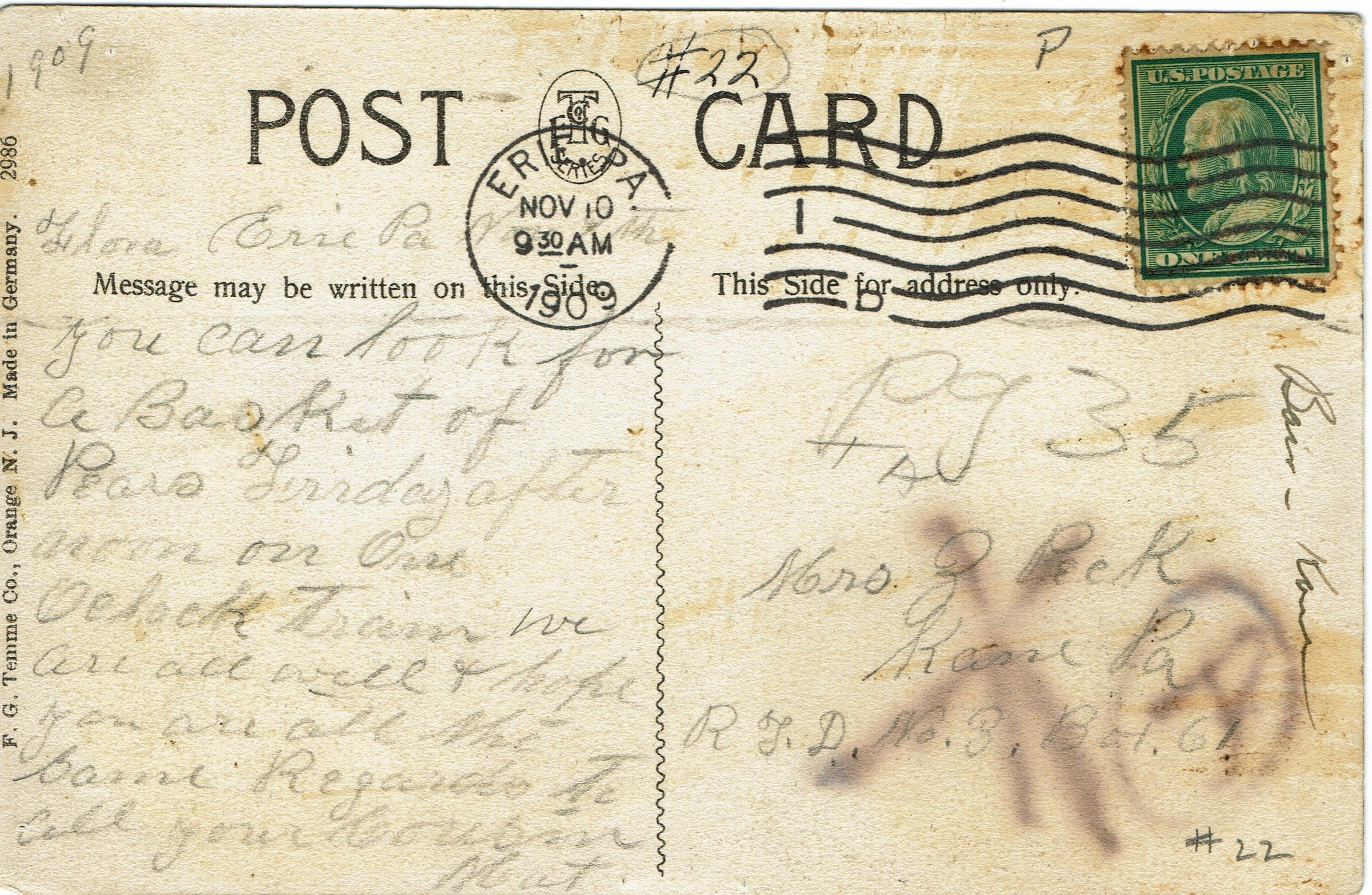 Postcard featuring B&W photographs from the 1909 Semi-Centennial Celebration in Millburn. Postmarked Erie, PA, November 10, 1909, 9:30 AM. Postcard is addressed to Mrs. Z. Peck, Kane, PA.