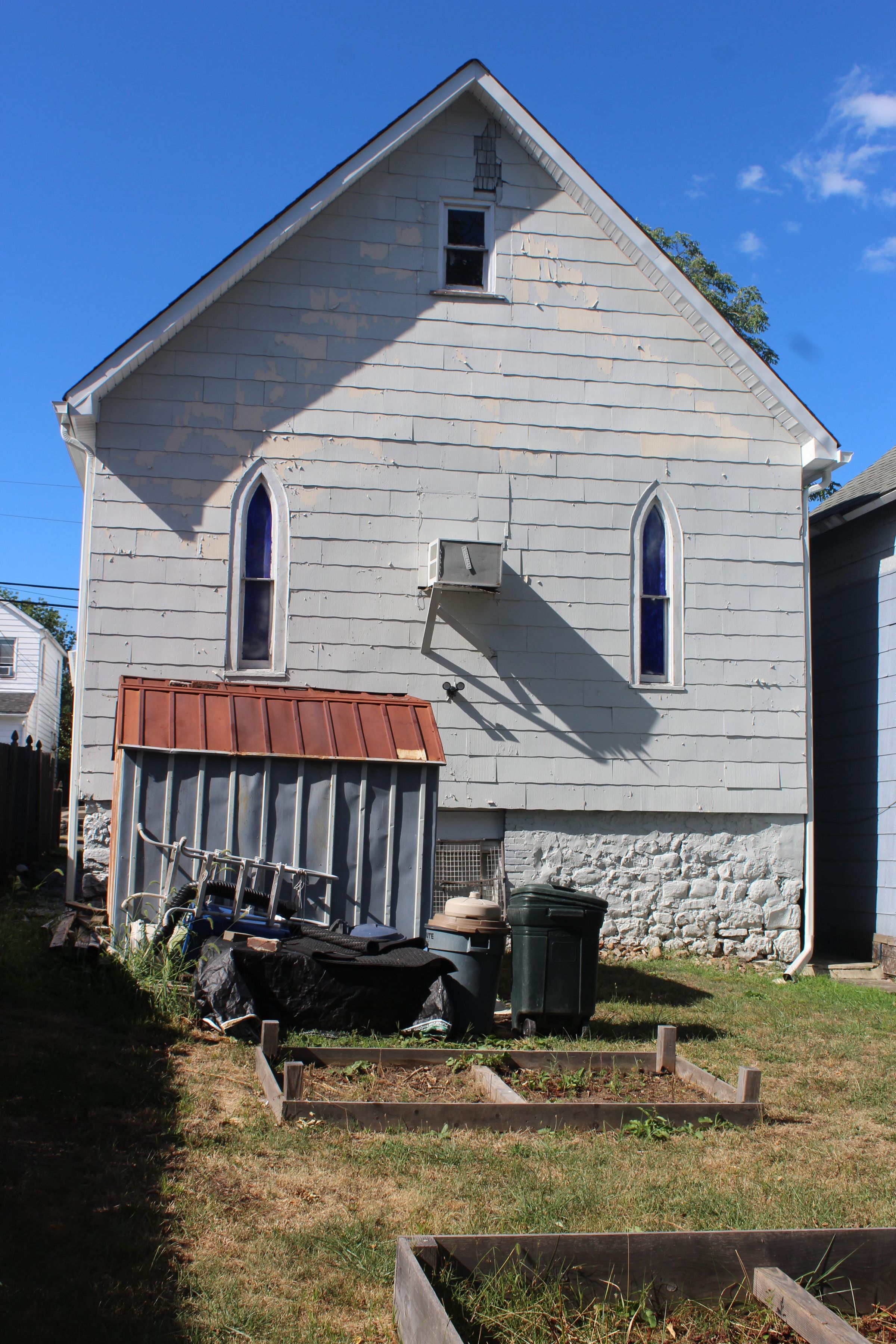 The building is in the American Vernacular Style, influenced by American Gothic. The church has a shingled exterior, a pair of lancet windows in the facade and four narrow windows with triangular tops on each side.