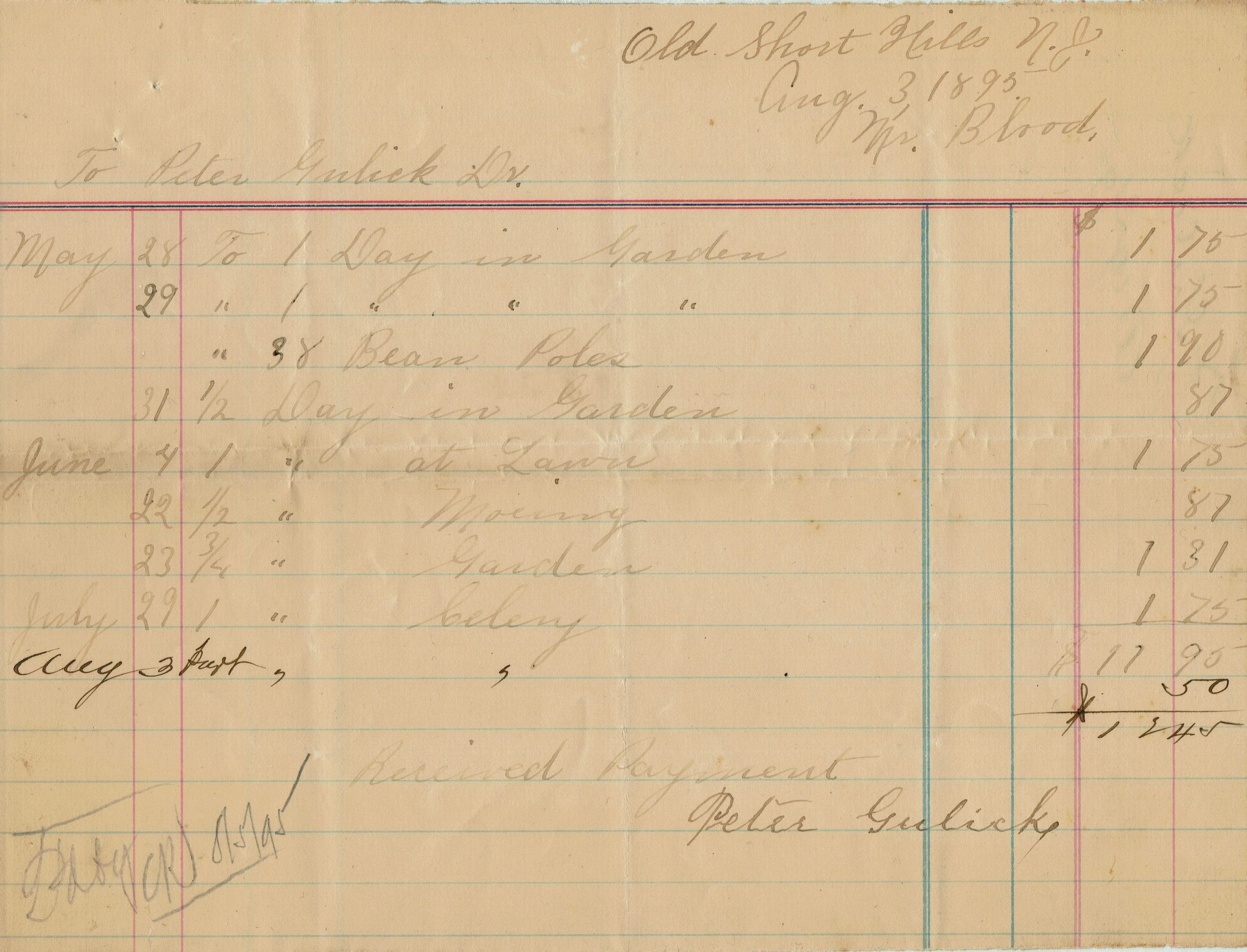 Handwritten receipt dated August 3, 1895 to Mr. Blood in Old Short Hills, N.J. for gardening services performed by Peter Gulick from May to August, 1895. Total amount of the bill was $12.45.