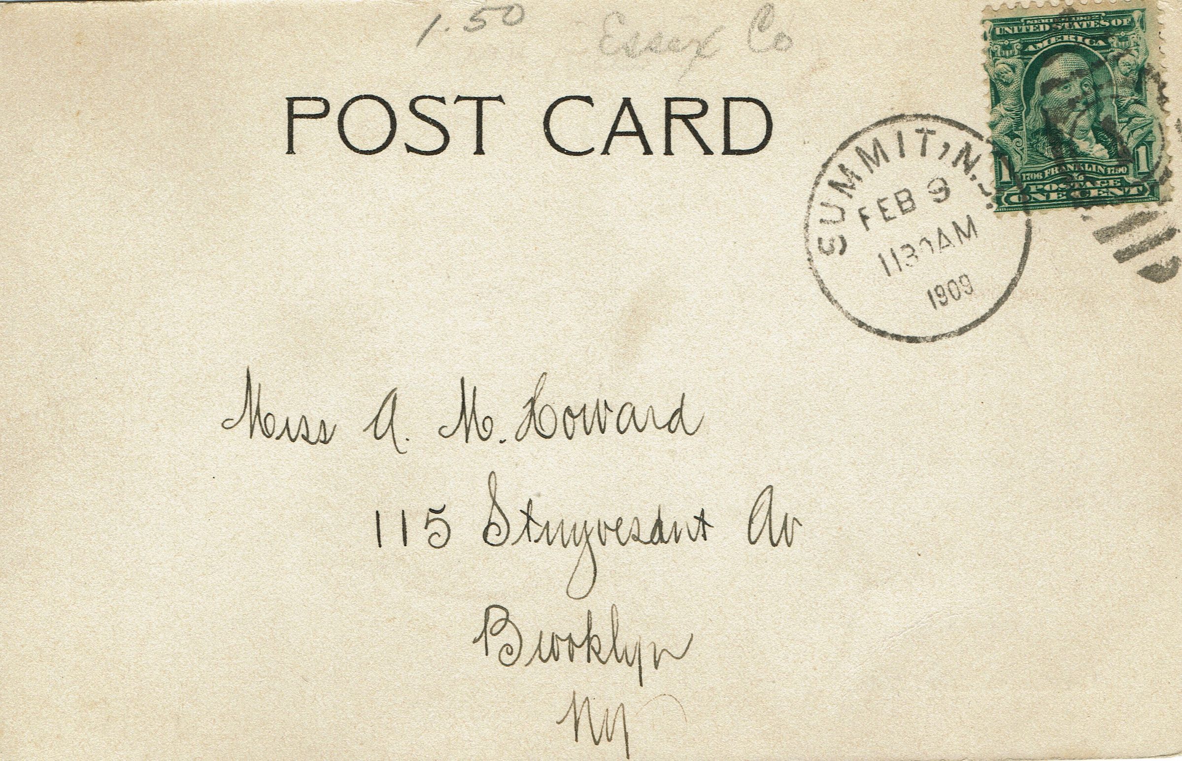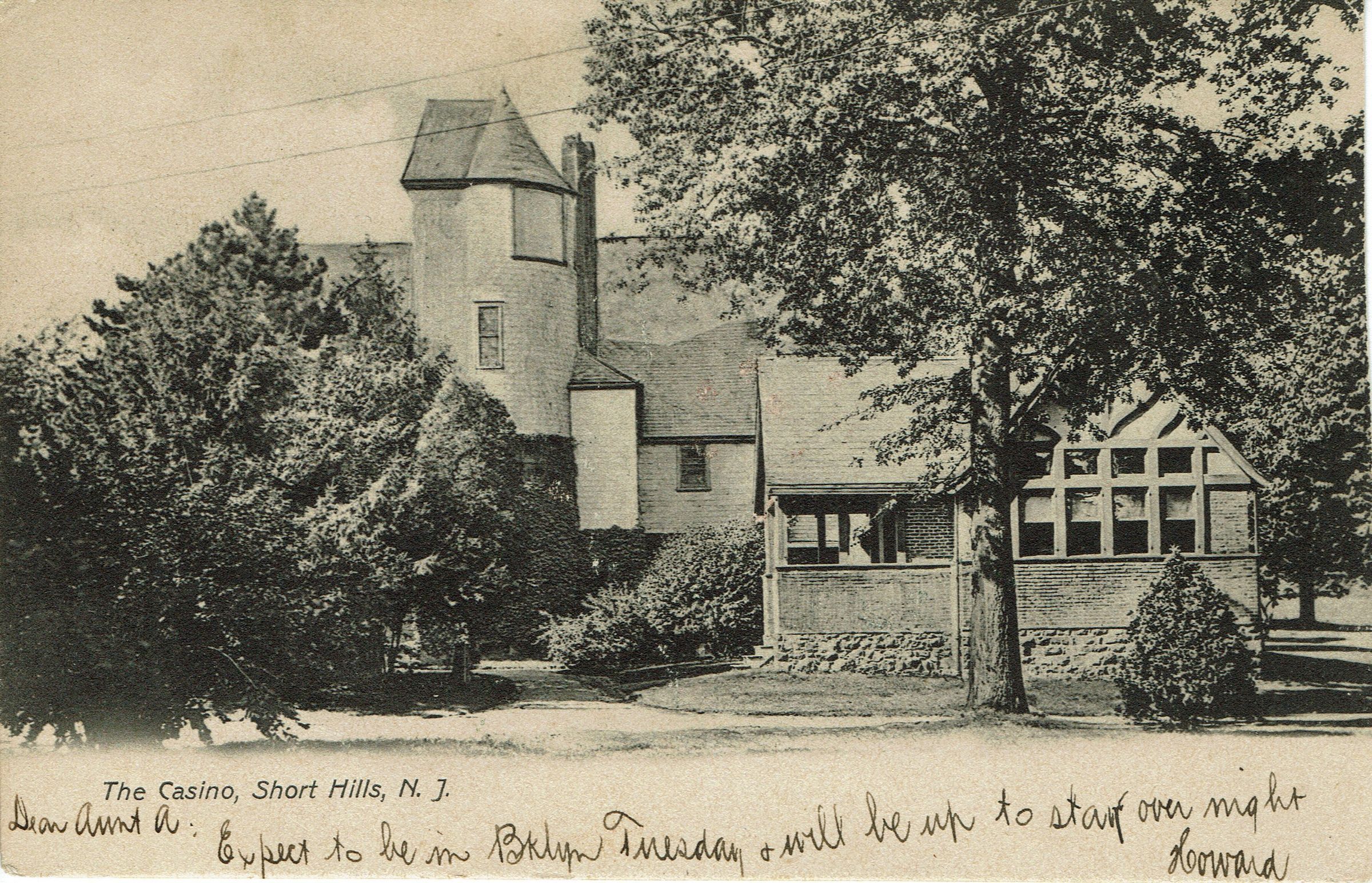 Postally used photographic postcard of The Casino, Short Hills. Postmarked Summit, NJ, February 9, 1909, 11:30 am and addressed to Miss A.M. Howard, 115 STuyvesant Av., Brooklyn, NY.