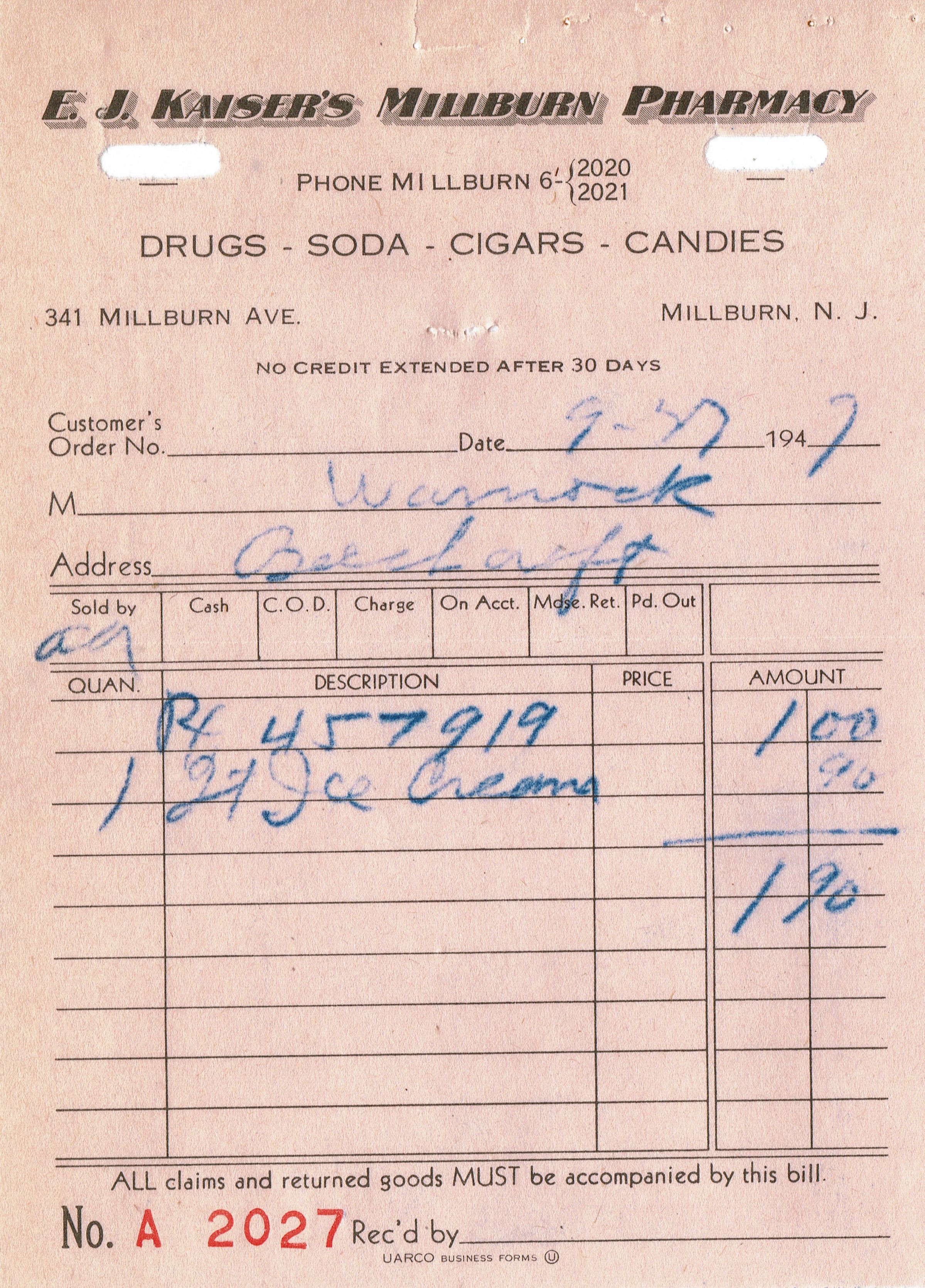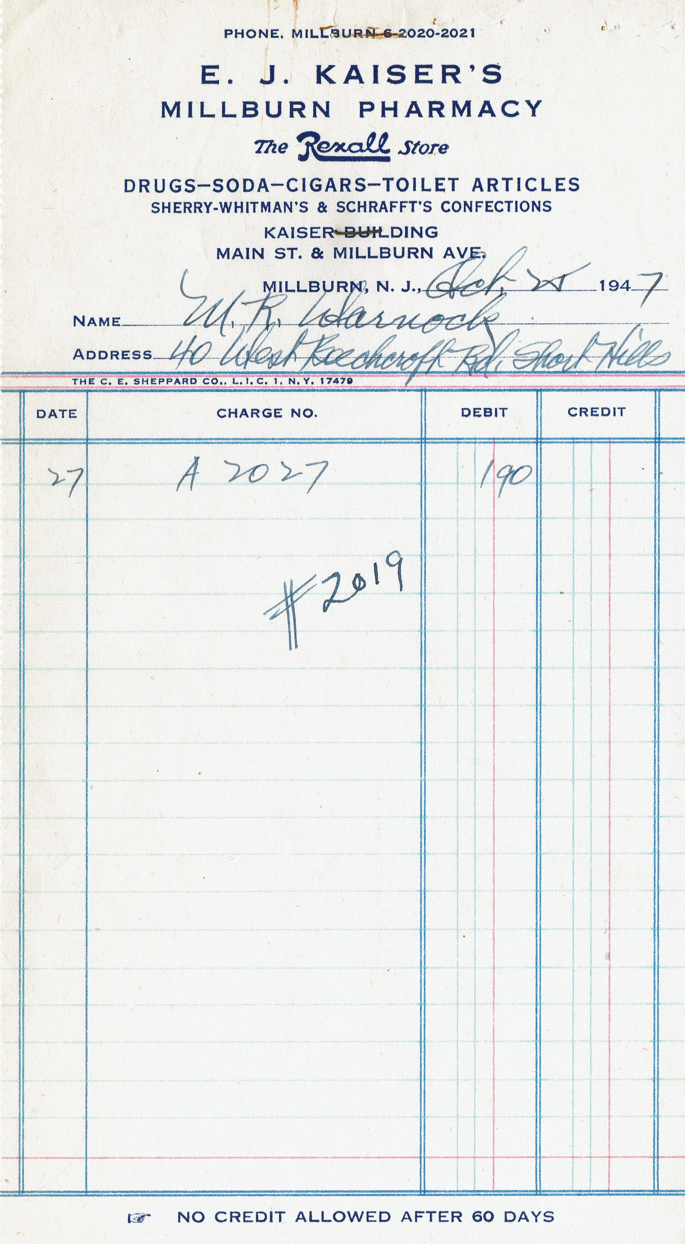 Kaiser's Millburn Pharmacy: Receipts, 1947