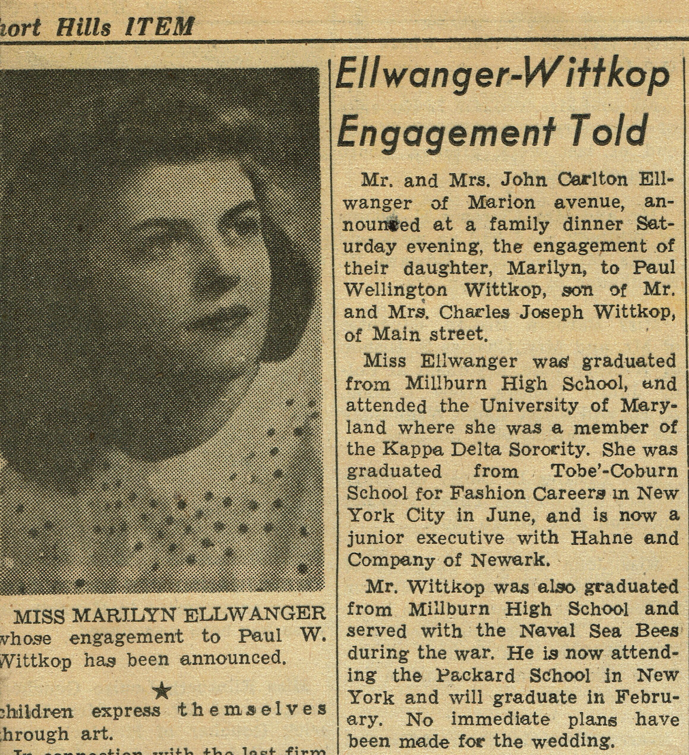 Archive Entry Archive Entry Go back Prev Item Next Item Ellwanger: Marilyn-Wittkop Engagement Notice & School Award Publication Entry/Object ID2021.354.004CollectionMarilyn Ellwanger-WittkopAcquisitionAccession2021.354