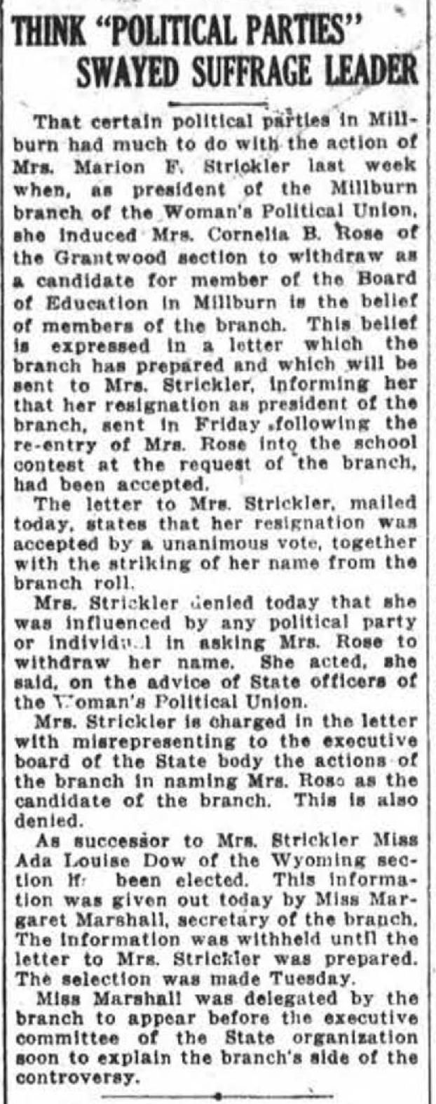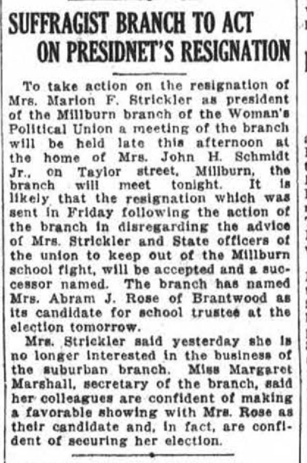 Millburn Women's Political Union: Marion Strickler Resignation, 1915