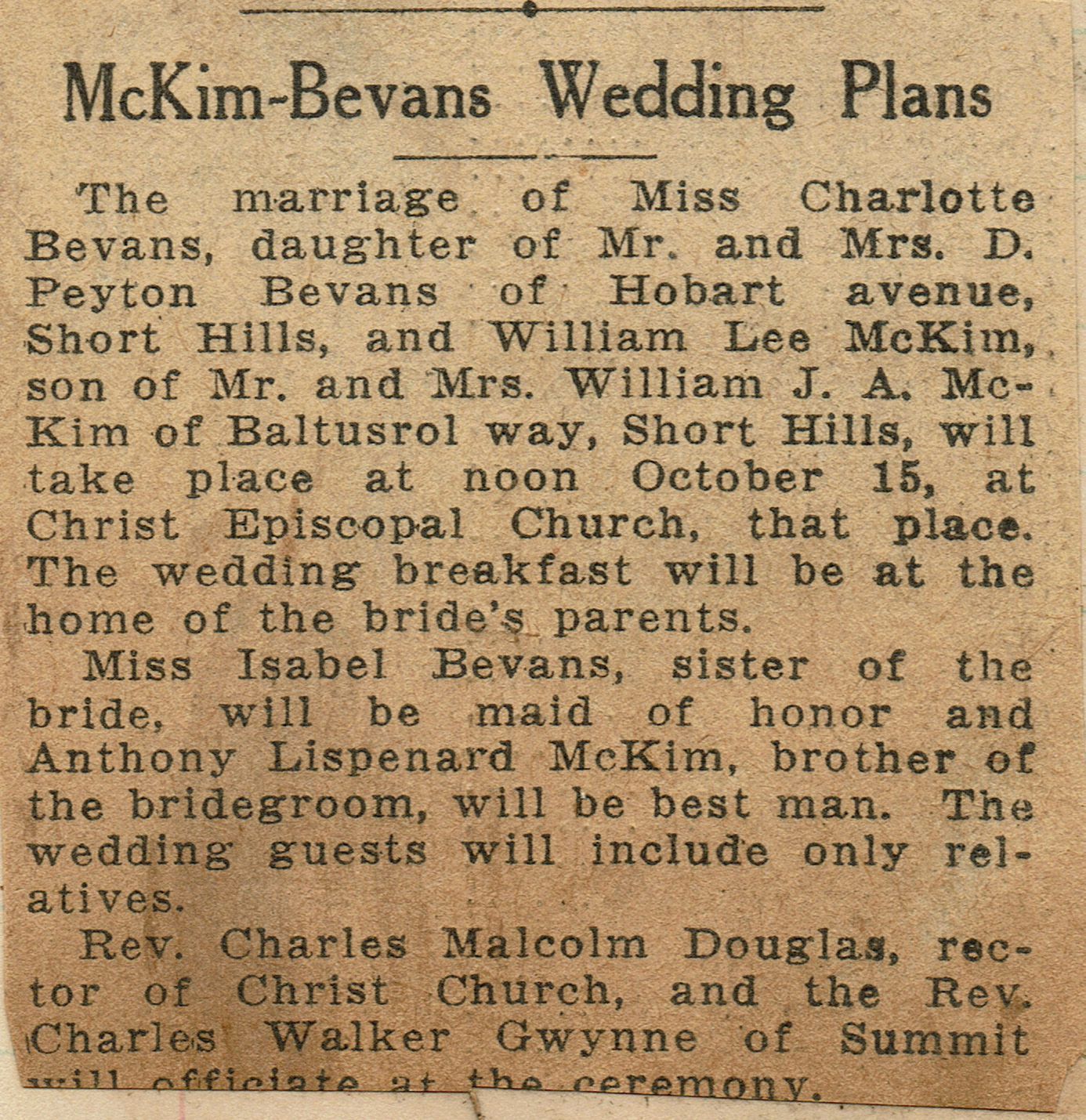 Empty envelope postmarked "Philadelphia, PA" and "April 4" but the year is difficult to read. It may be 194?. The envelope is addressed to Mr. Robert McKim; Baltusrol Way; Short Hills; New Jersey and was sent special delivery. The back of the envelope is printed with the logo of the Hotel Pennsylvania. Robert V. McKim doesn't seem to have been in Short Hills in the 1940s, although his brother William was living on Overlook Terrace then. Robert V(anderburgh) McKim was born in Short Hills in 1900 and died in New York City in 1960. He was the father of fashion designer Lilly Pulitzer. The envelope shows considerable overall soiling, bumped corners, yellowing, and edgewear.