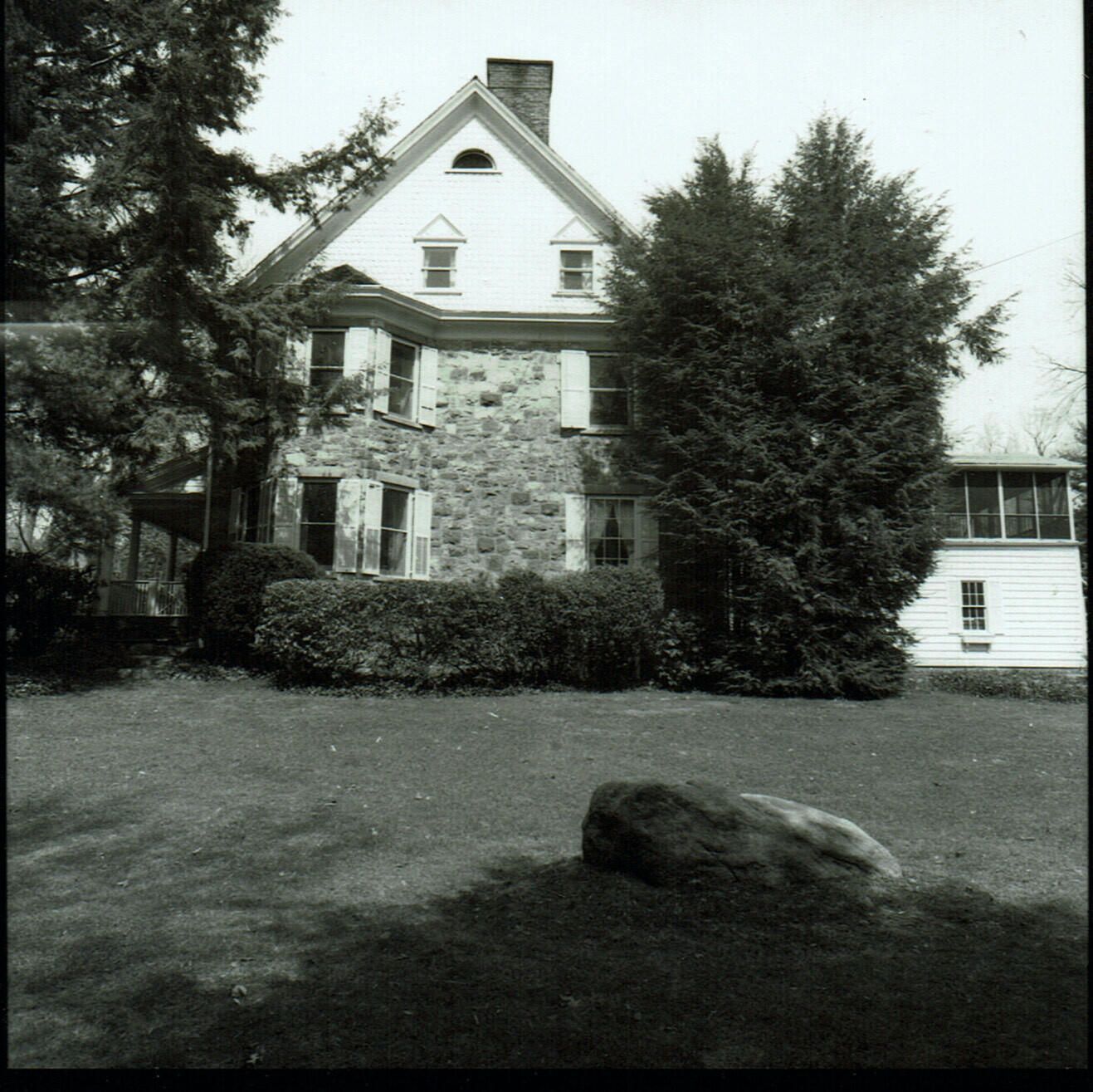 Photograph of 118 Forest Drive. Hartshorn house (unnumbered). Built in ca. 1890. Vernacular style with gable roof; exterior finish in stone and fish-scale wood shingles. Note the porch, octagonal tower, decoration in dormer gables and the ornamental chimneys.