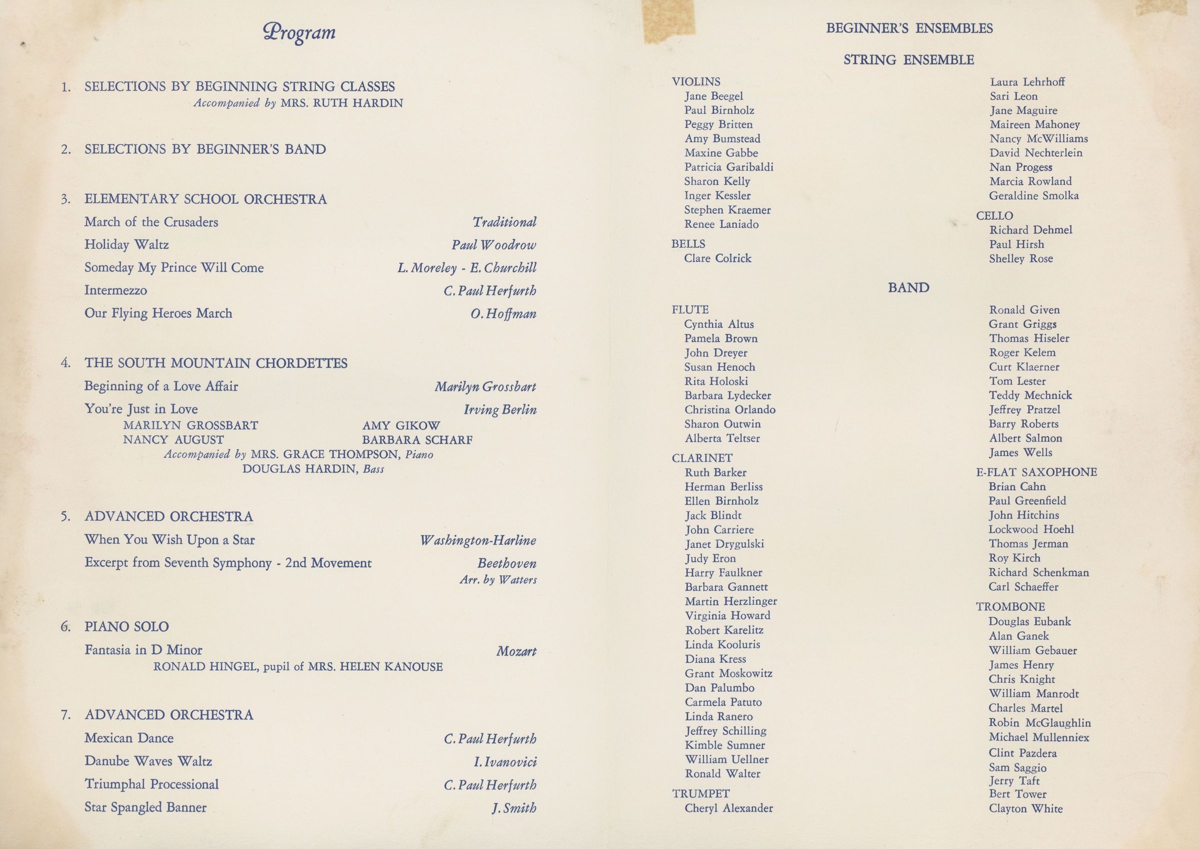 Program for the combined elementary school spring concert at Millburn High School on Wednesday, May 28, 1958 at 7:30 pm. 6 pp. folded program. The concert was directed by Peter Arella and Lee Bosshart and featured selections by the beginning string classes, accompanied by Ruth Hardin, selections by the beginner's band, the elementary school orchestra, the South Mountain Chordettes, and the advanced orchestra. Ronald Hingel also played a piano solo.