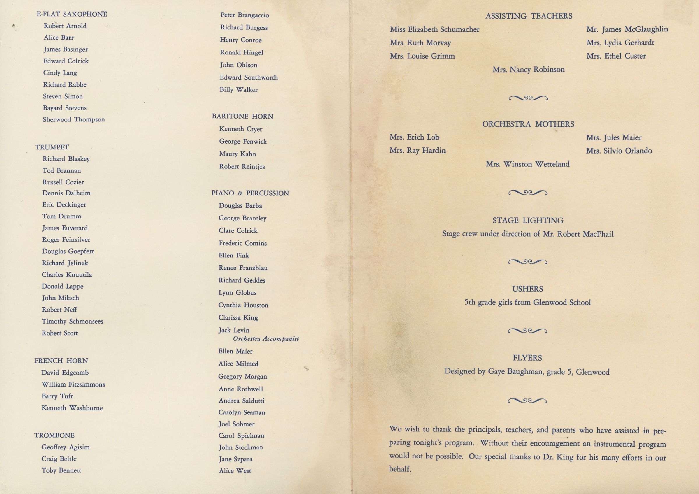 The program contains the full list of student participants, teachers, and orchestra mothers.