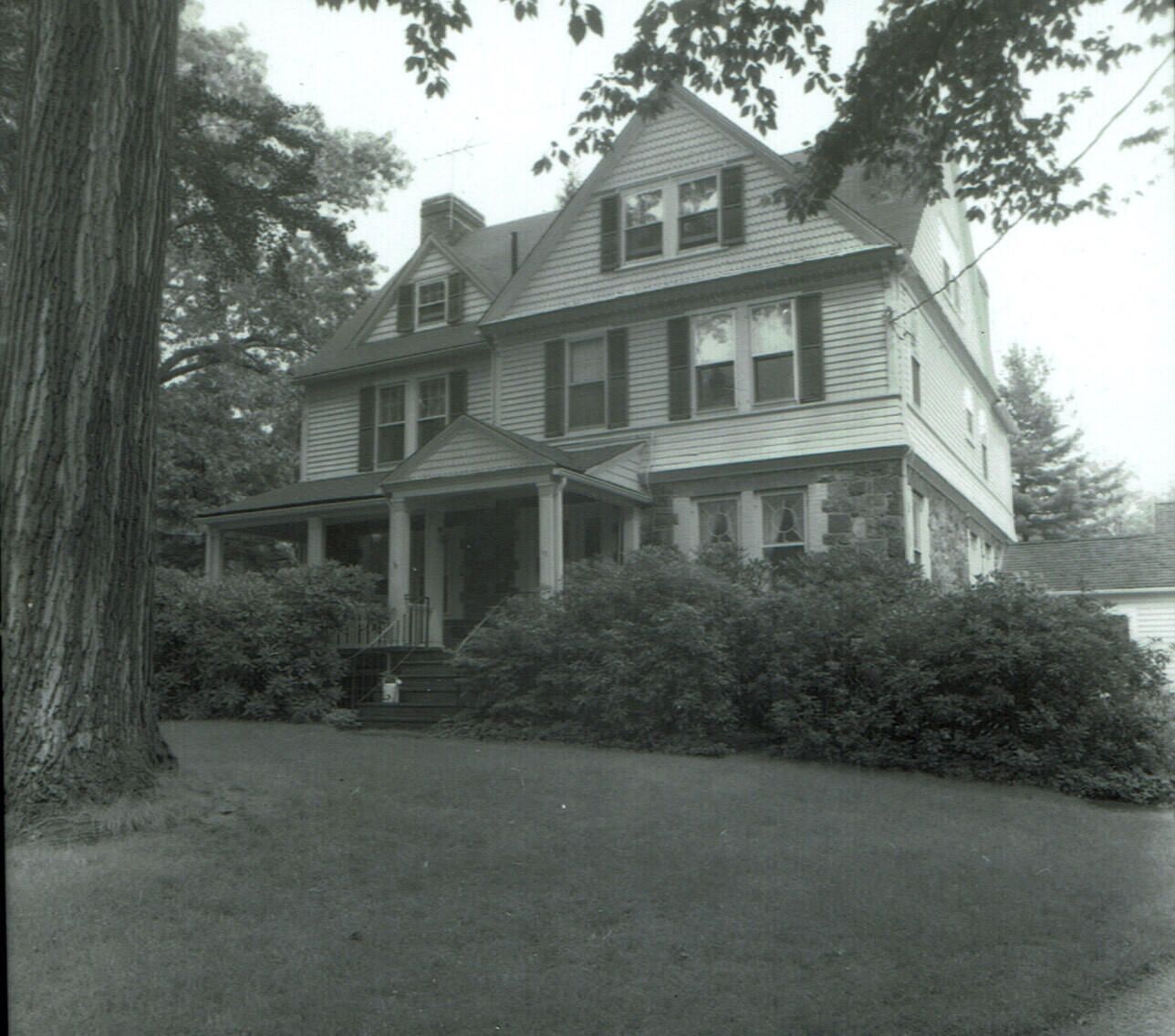 Photograph of 11 Western Drive. Built ca. 1890. Vernacular style with gable roof. Exterior finish in stone, clapboard and fish-scale shingles. Note the window pane pattern in the first floor windows on thee right-hand side of entrance door. Note porch, angular.
