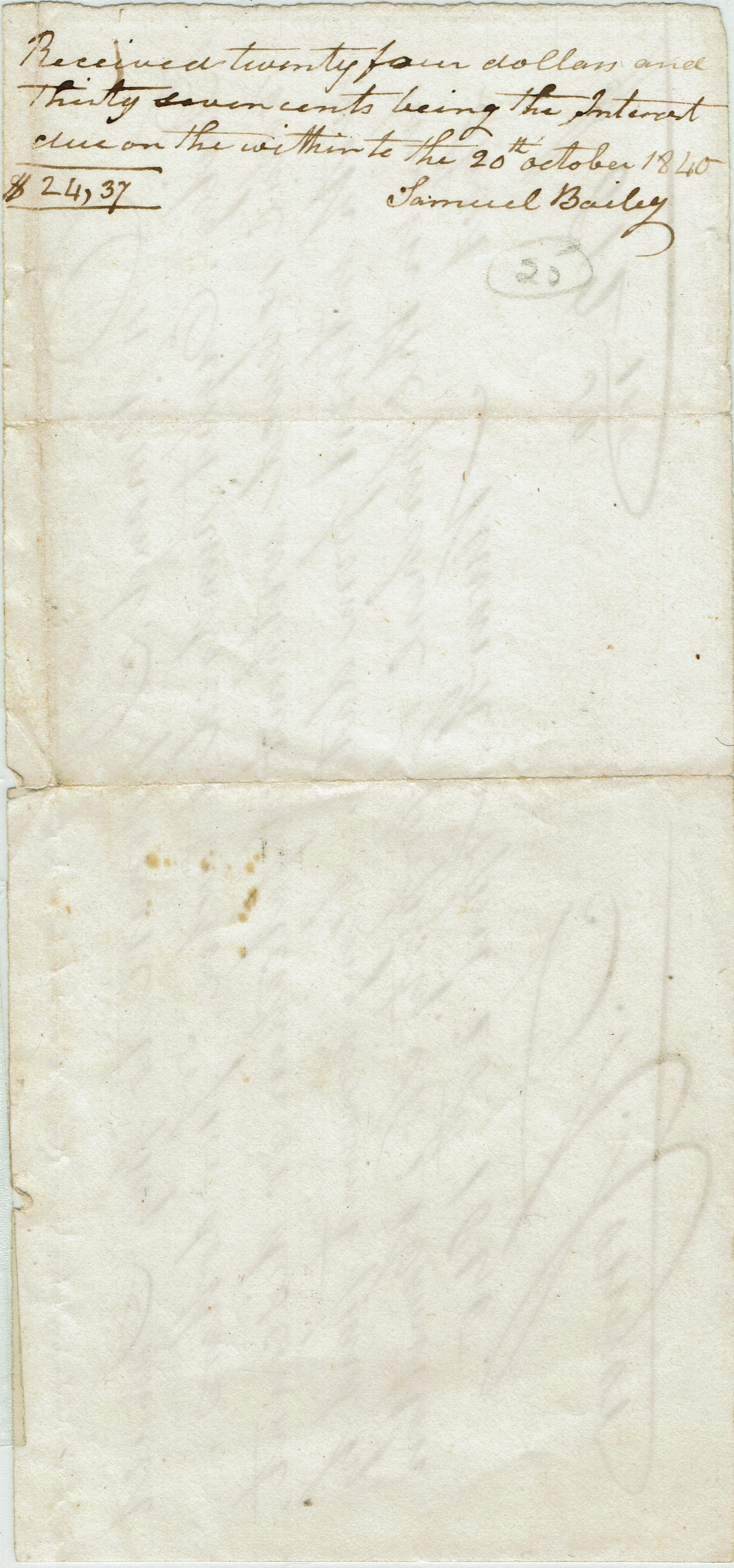 Verso reads: Received twenty-four dollars and thirty seven cents being the interest due on the within to the 20th October 1845. Samuel Bailey.