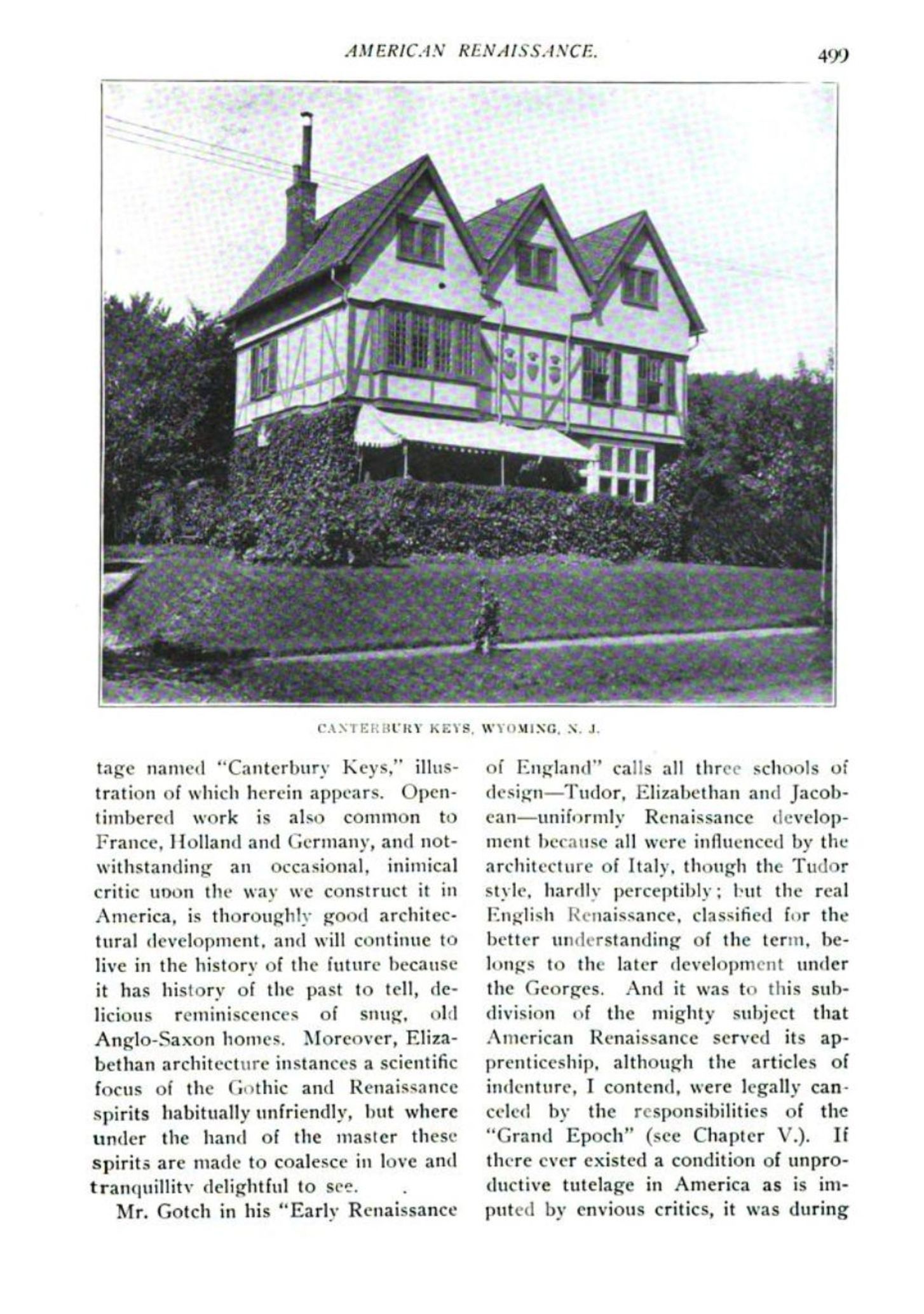 Architect Joy Wheeler Dow's Elizabethan Revival style house from 1894 known as "Canterbury Keys." In 1921, the house was owned by Ethel Constantine of the Wyoming Fire Engine Company and then passed to the Dearing family.