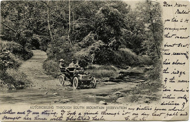 1905 b/w postcard titled "Automobiling Through South Mountain Reservation," sent to Mr. Harry G. Barnes, 38 Prospect Place, Bristol CT. The sender (C.L.K.?) wrote on the front of the card: "Dear Harry, Wouldn't you like to be occupying that vacant front seat! This reservation lies along the ridge of the mountain and is within walking distance of my sister's house where Mother and I are staying. I took a friend through it one day last fall and brought her home with blistered heels." The postcard is yellowed and the corners are bumped. The front lower right corner is creased and there is a crease along the right (from the front) side of the card, 1/2" in the the edge, and ca. 2" long. There are two cancellation marks on the address side of the card; one if from New York and one from Bristol CT.