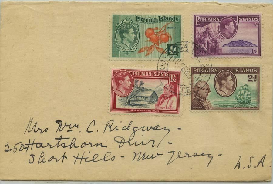 Postally used 1954(?) cancelled envelope, with letter inside, sent from the Pitcairn Islands (or a ship that was stopped there) to Mrs. Wm. C. Ridgway (Emily) at 250 Hartshorn Drive in Short Hills. The handwritten letter inside is on blue paper and says: "Feb. 9, 1954(?); Dear Emily, They tell me these stamps have more value when cancelled -- that is if they ever arrive!! Enjoyed your letter and puzzles. Many thanks. The natives are aboard (only 200 on the isle) selling their wares. Mostly baskets, chains, & beads & carved canes & flying fish. Each has the carvers own signature. The natives are a much higher class than those of the Easter Isles. We are seeing plenty of sea! 8 days from here to Figi. It will be 15 days since we have put a foot on terra firma! Pops is fine, his cold totally gone. Tonight a C.T. party given by Allen Sca??s. In fact a C.T. party every d_____night. A Mr. & Mrs. Miller aboard; she was Flora Whitney, Rod Tower's 1st. Guess you (sic) rather told you our 1st 18 hr. out was a horror. Waves black & tall as Mt. Everest. Hate not getting any home news. Also miss the daily papers. Best to Bill & the young(?). Affec. Helen"