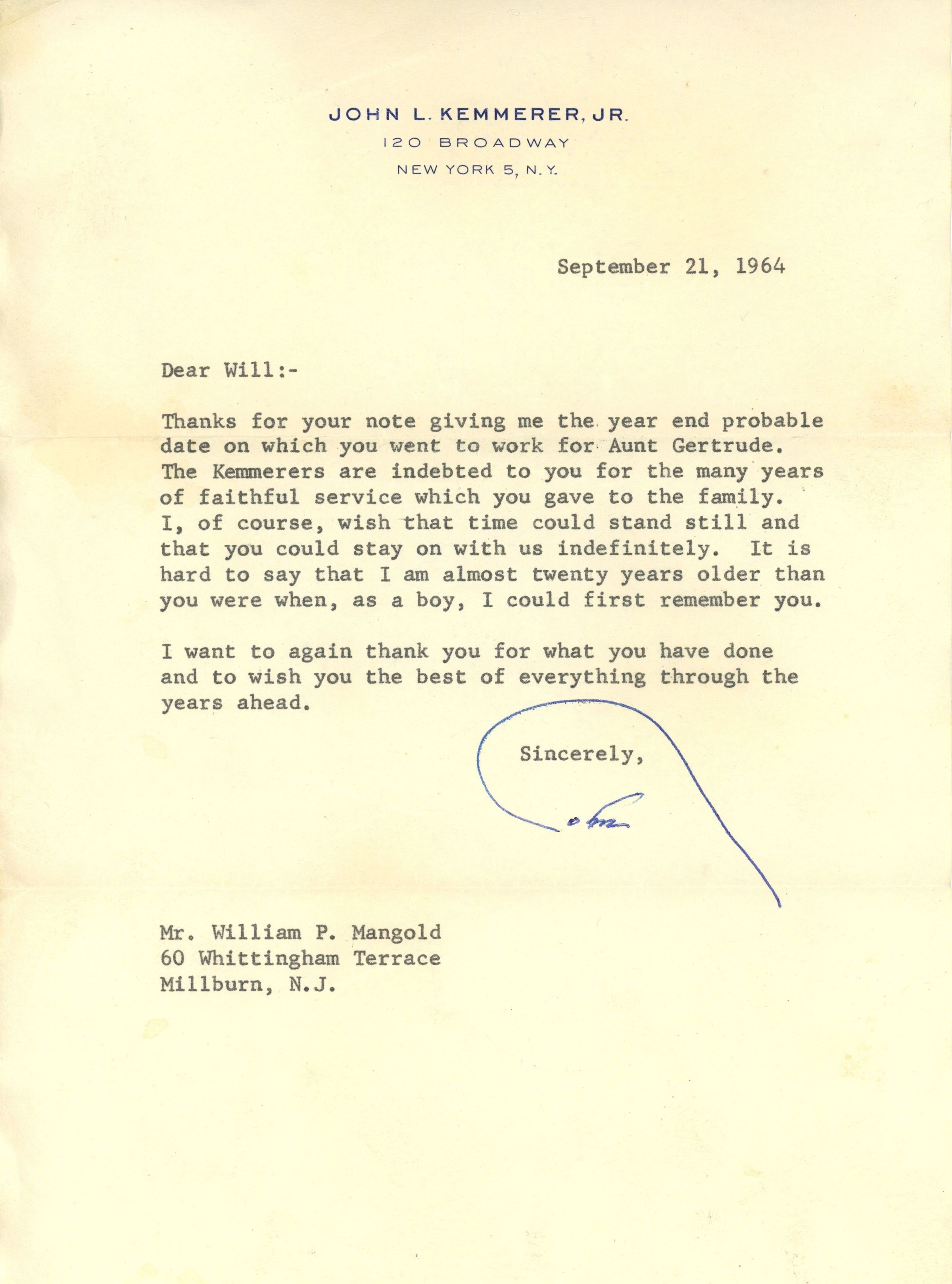 Kemmerer: John L. Kemmerer, Jr. Correspondence to Mangold family, 1960s