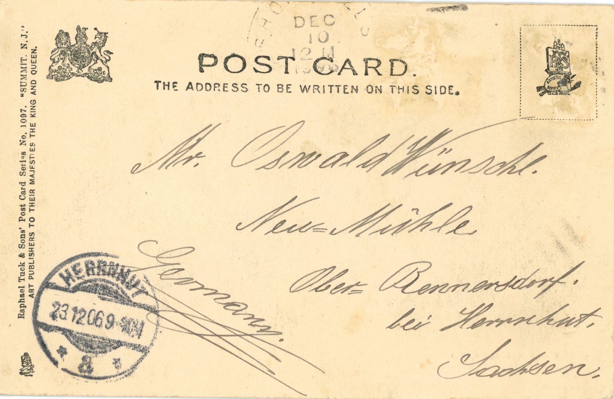 Postally used photographic postcard of the Short Hills Casino (Music Hall, Racquet's Club) postmarked Short Hills, December 10, 1906 12 M and addressed to Mr. Oswald Wünsche, Neu Mühle, Ober-Bennersdorf bei Herrnhut, Germany. Message is in German.