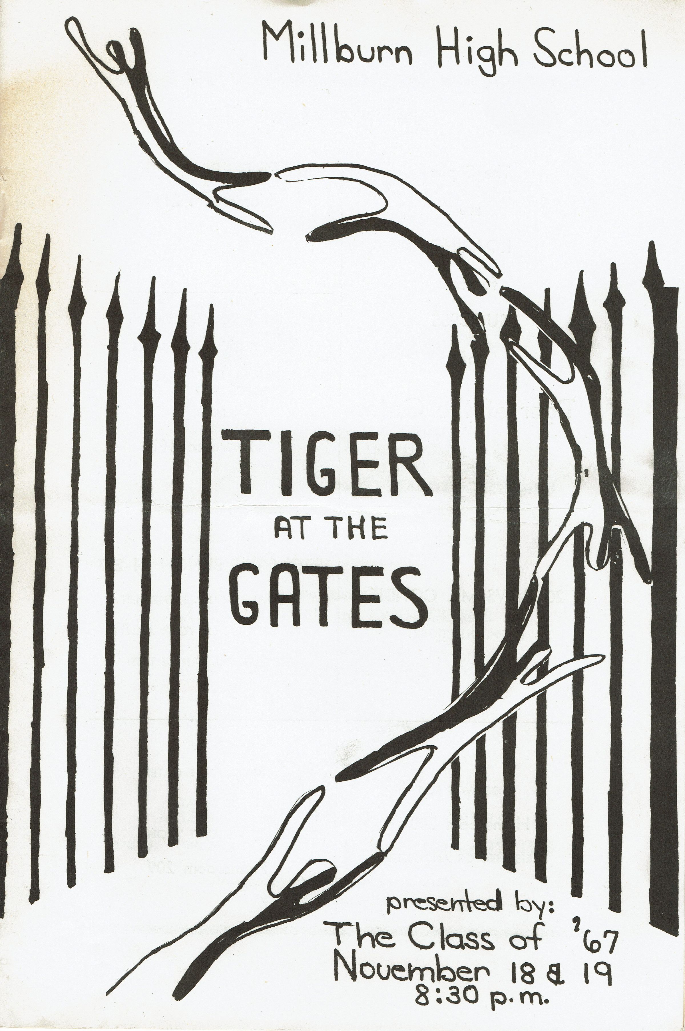 Millburn High School Theater Programs (3): Tiger at the Gates (November 18-19, 1966), The Madwoman of Chaillot (November 17-18, 1967), Good-Bye My Fancy (March 31 and April 1, 1967). Illustrated covers, contains advertisements for local businesses.