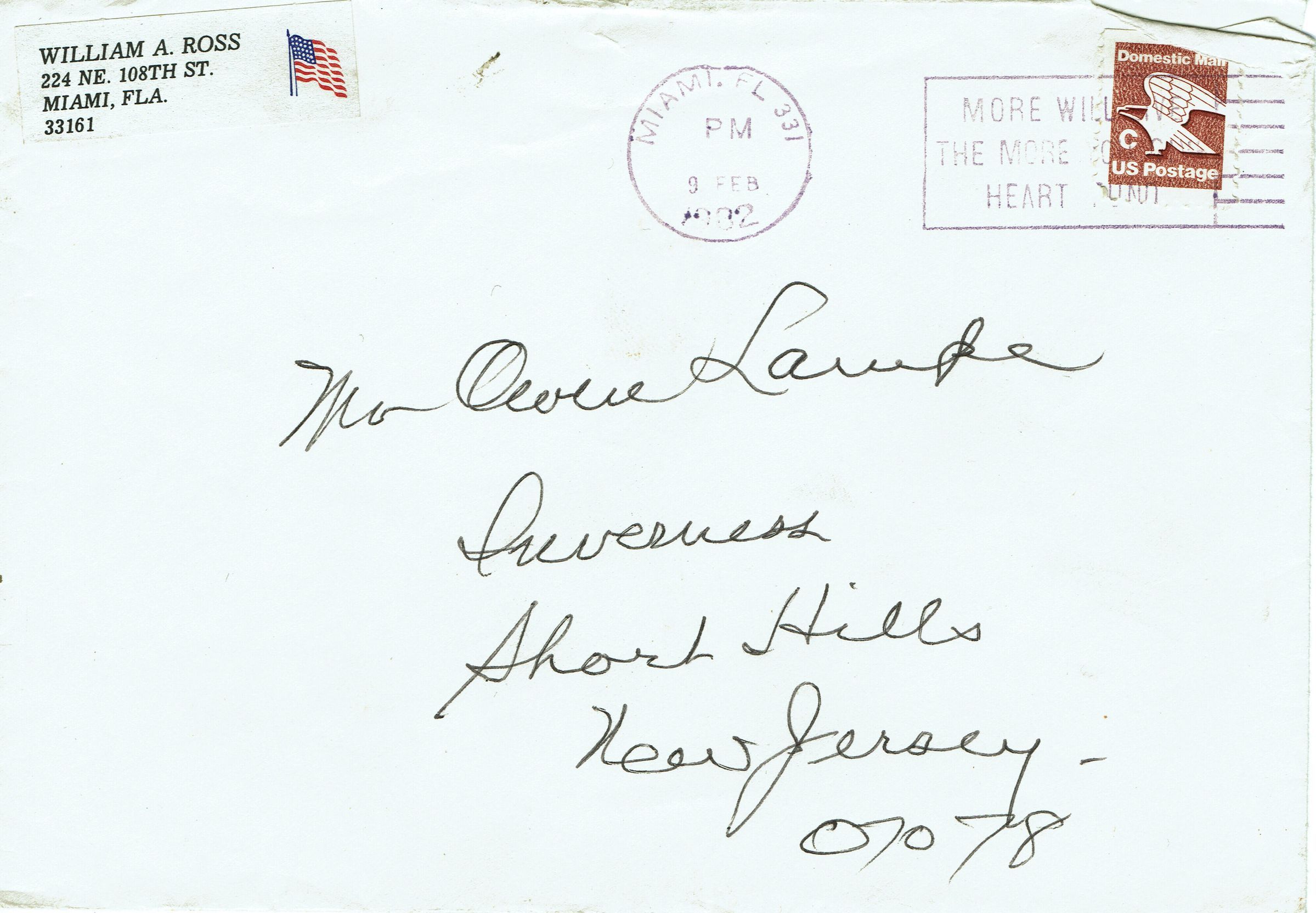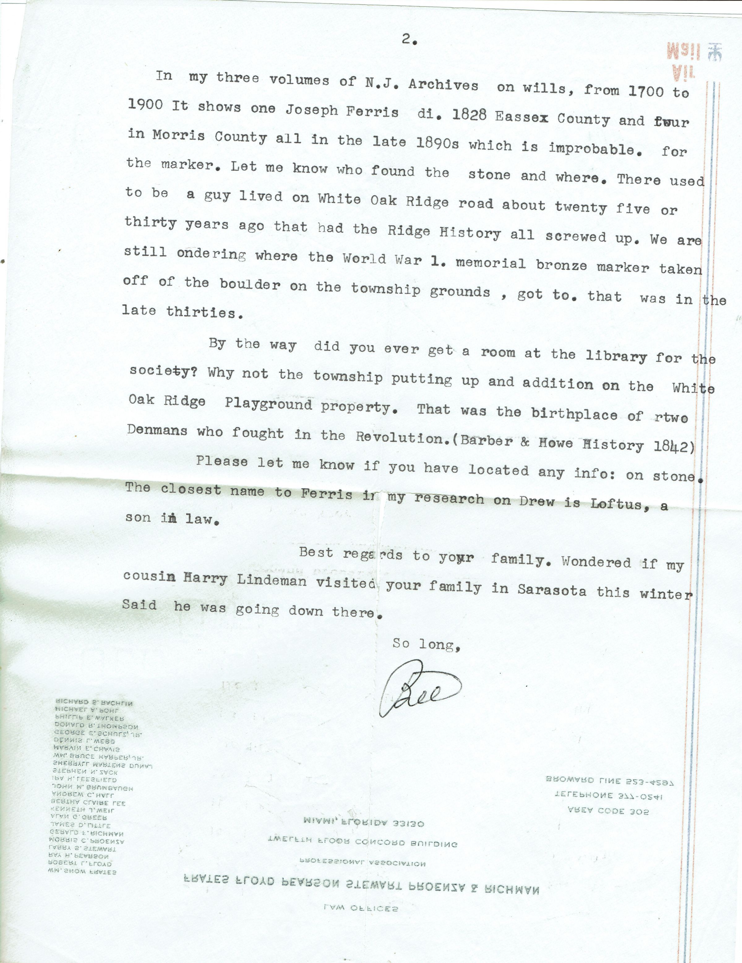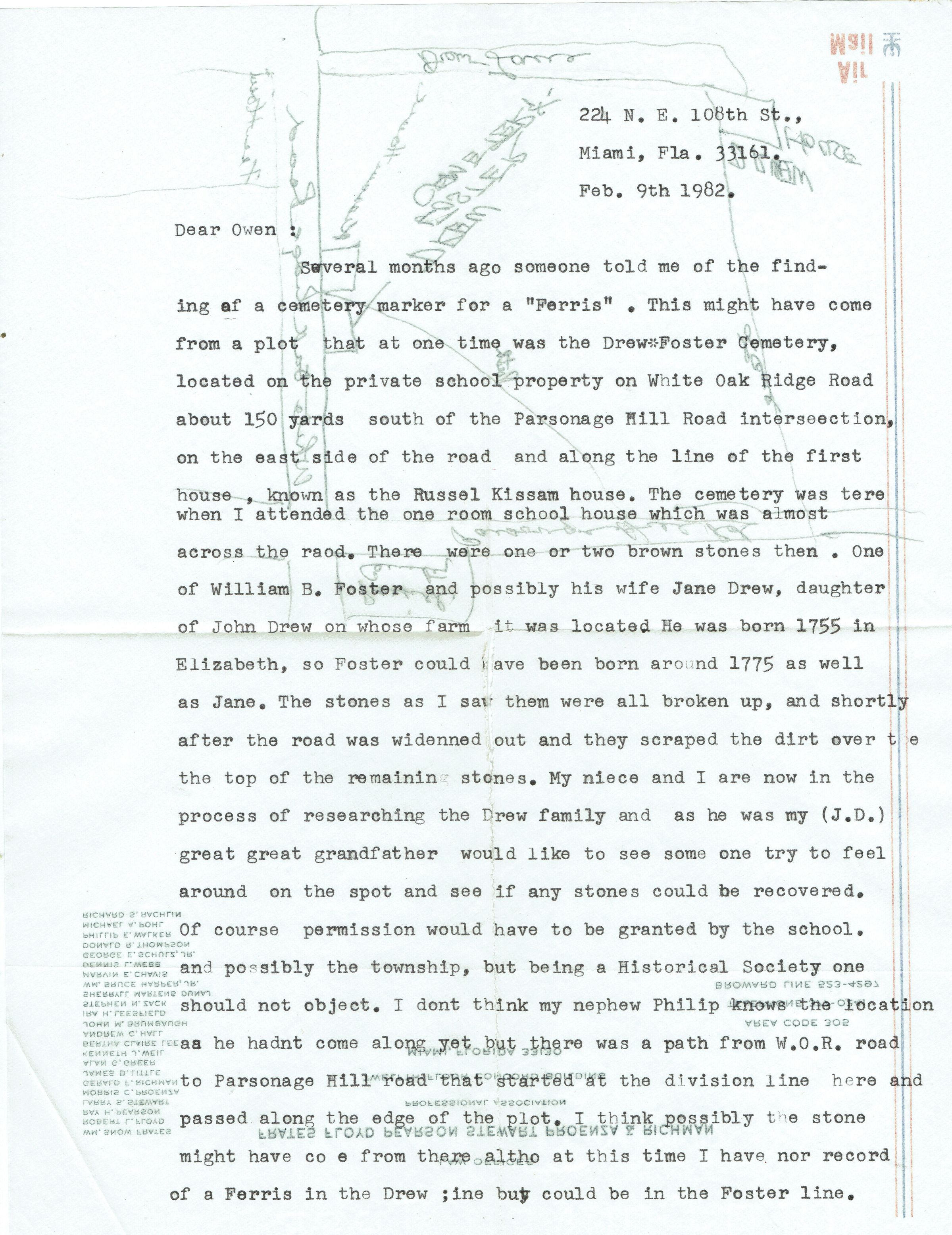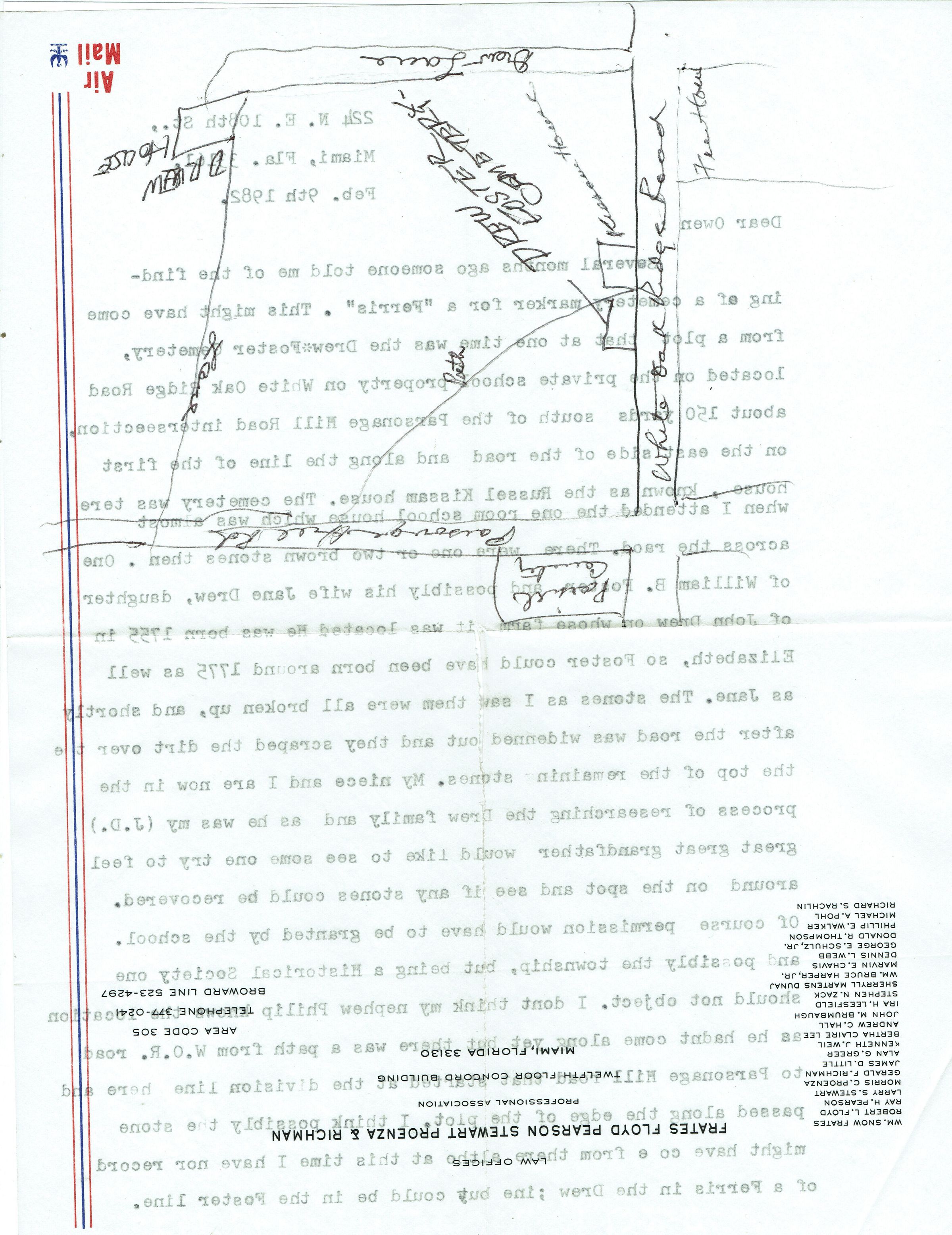 2 page letter dated February 9, 1982, from William A. Ross to Owen Lampe discussing historical research on the Drew Family, the Drew Foster Cemetery and the White Oak Ridge Road property that became the Poor Farm. Letter includes a hand-drawn map of the property.