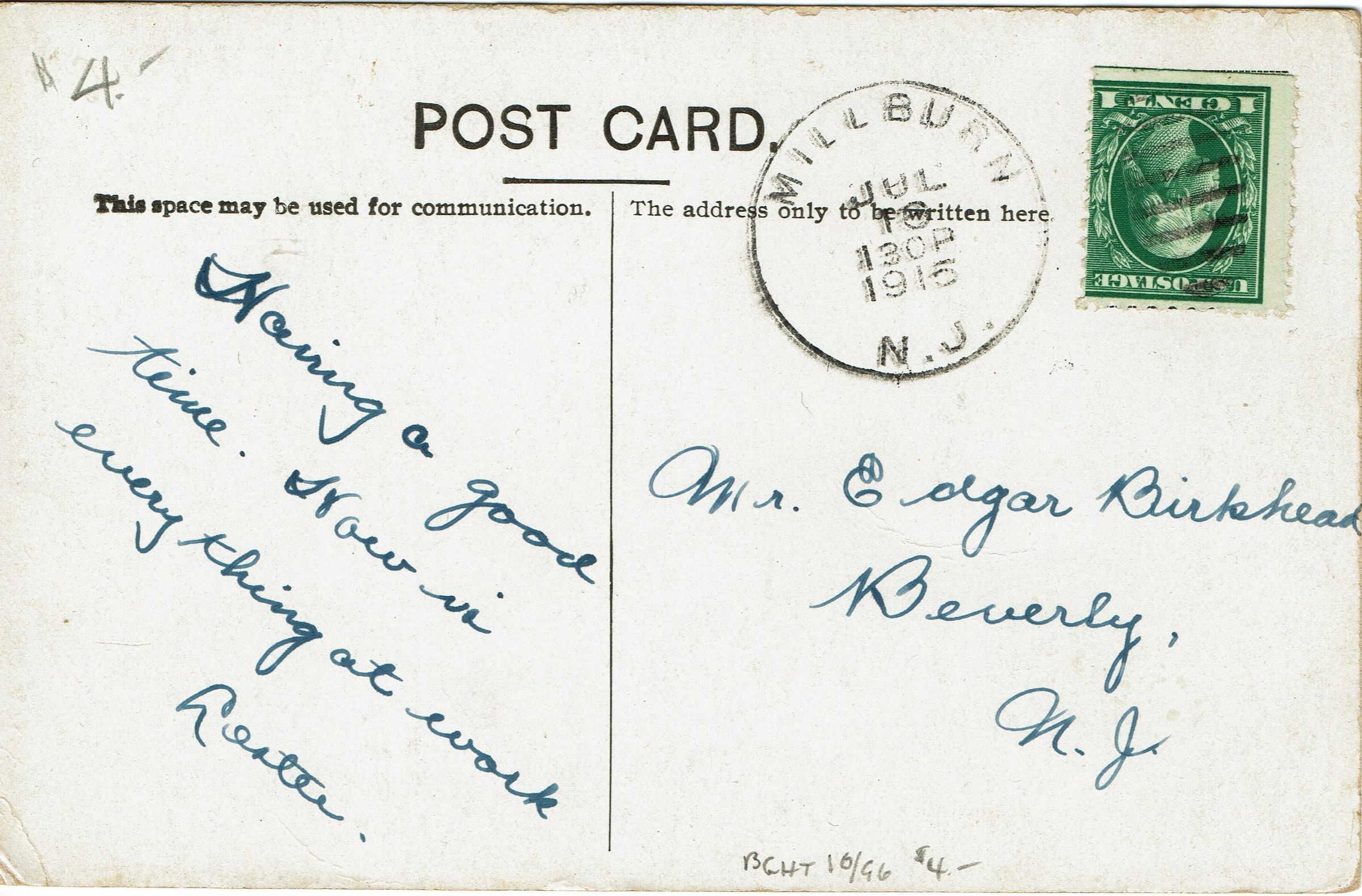 Photographic postcard of the First Baptist Church, 132 Spring Street, Millburn. Postally used, postmarked Millburn, July 18, 1915, 1:30 pm. Addressed to Mr. Edgar Birkhead, Beverly, NJ.