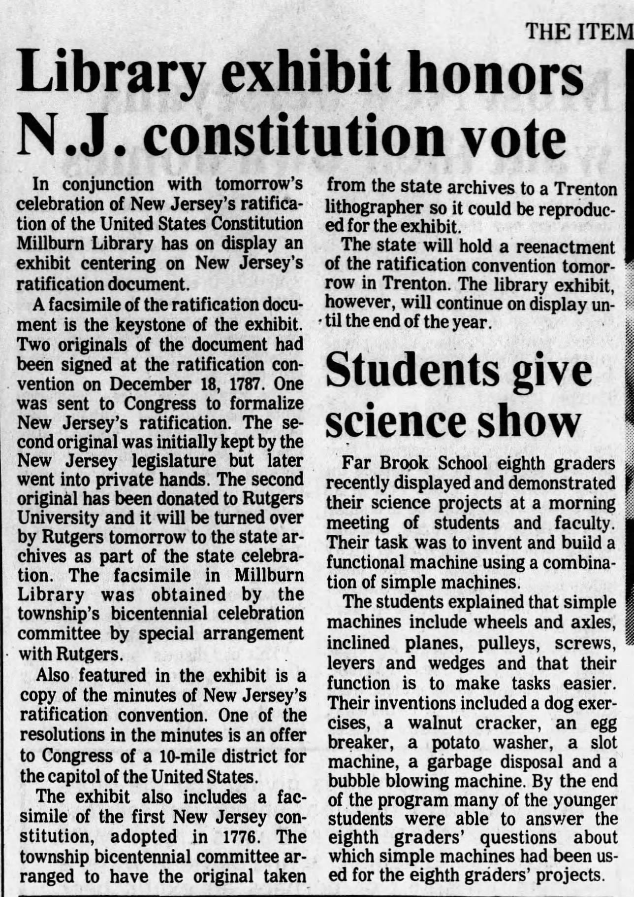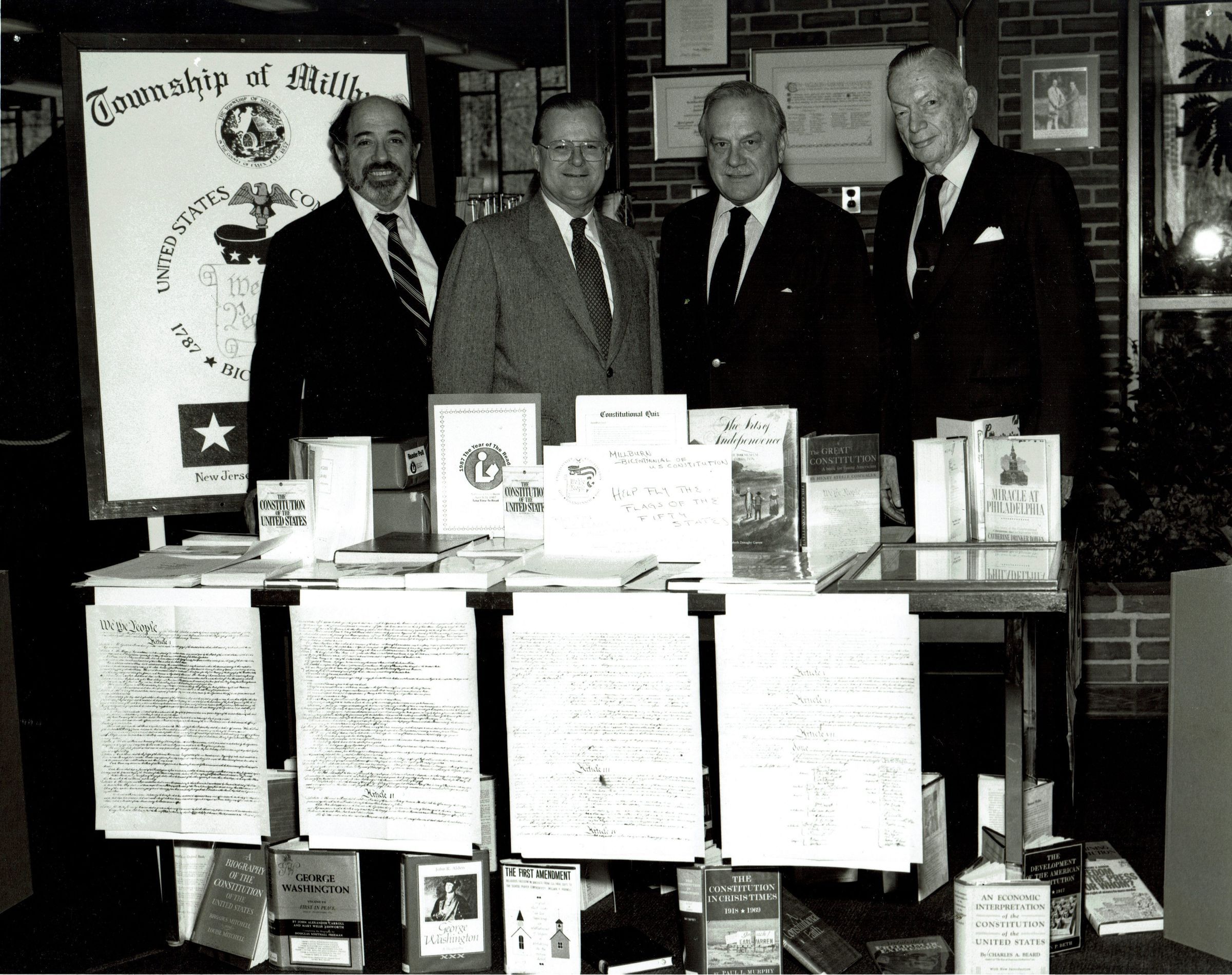 Photograph of the Bi-Centennial Celebration of the United States Constitution and NJ's ratification of the Constitution at the Millburn Free Public Library, December 18, 1987. Pictured at the far left is library director Seymour Kruger.