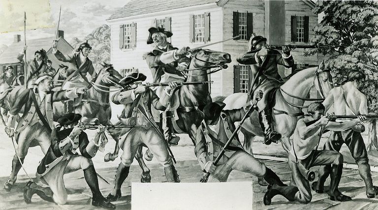 Mural painting, "Troops of Major Lee posted at Little's Bridge," from the Millburn Post Office by Gerald Foster. Gerald Foster was a WPA artist, originally from Montclair, NJ, who painted many murals in public buildings and post offices. When the Millburn post office was remodeled and the many postboxes on the east side removed, the mural was taken to Washington, D.C. Whereabouts unknown at this time (2021). Photograph of the mural was acquired by Owen Lampe from Gerald Foster, 980 Broughton N.E., Orangebury, South Carolina in 1957.