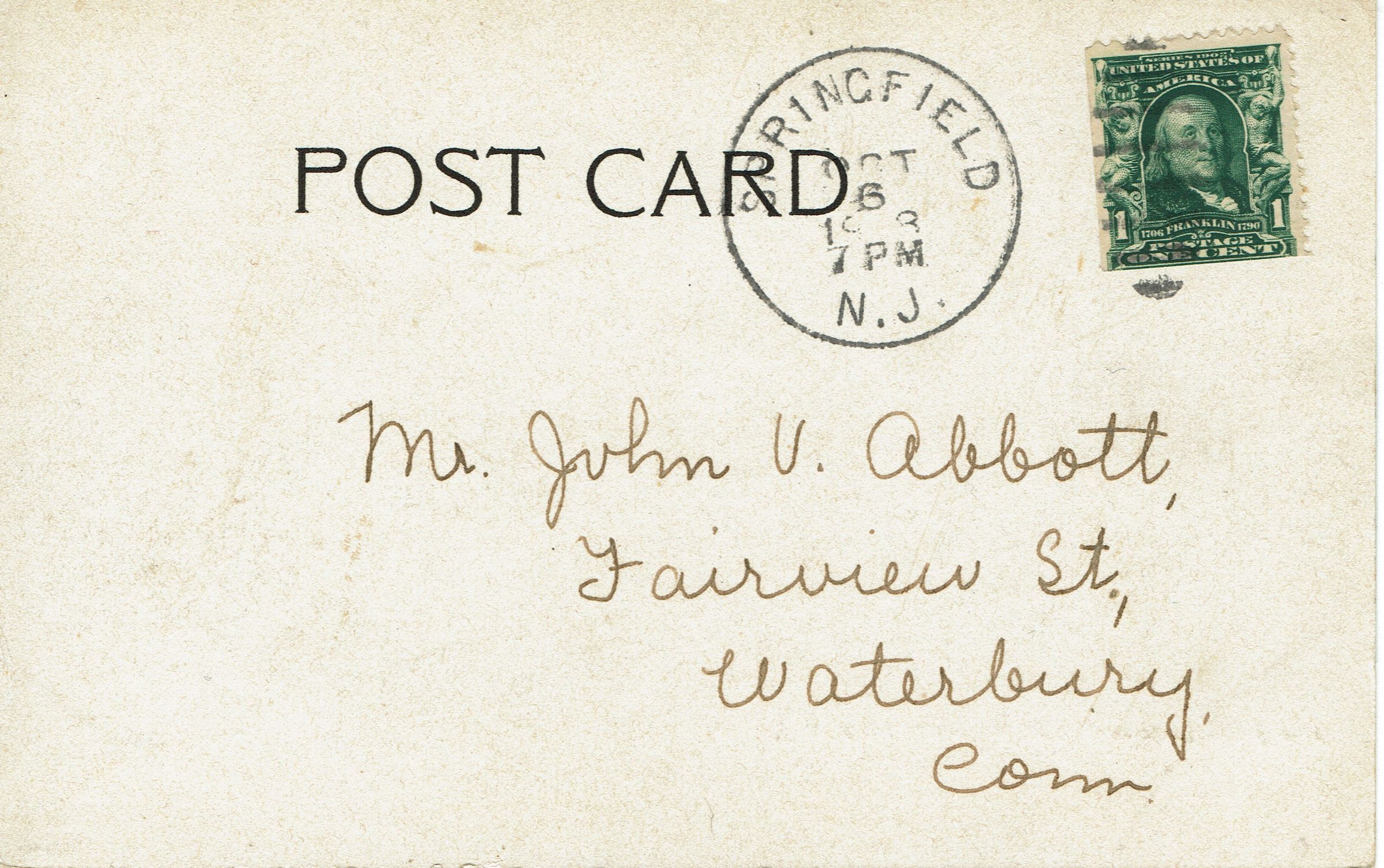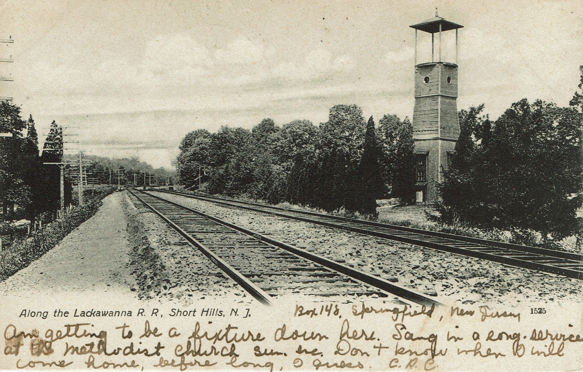 Postally used B&W photographic postcard, "Along the Lackawanna" depicting the windmill constructed for Stewart Hartshorn to pump water for Short Hills. The windmill was located between Great Oak Drive and the railroad at Pine Terrace East. Postmarked Springfield, October 6, 1908 and addressed to Mr. John V. Abbott, Fairview Street, Waterbury , Connecticut. Message on front reads: "Am getting to be a fixture down here. Sang in a long-service at the Methodist Church Sun., etc. Don't know when I will come home. Before long, I guess. C.R.C."