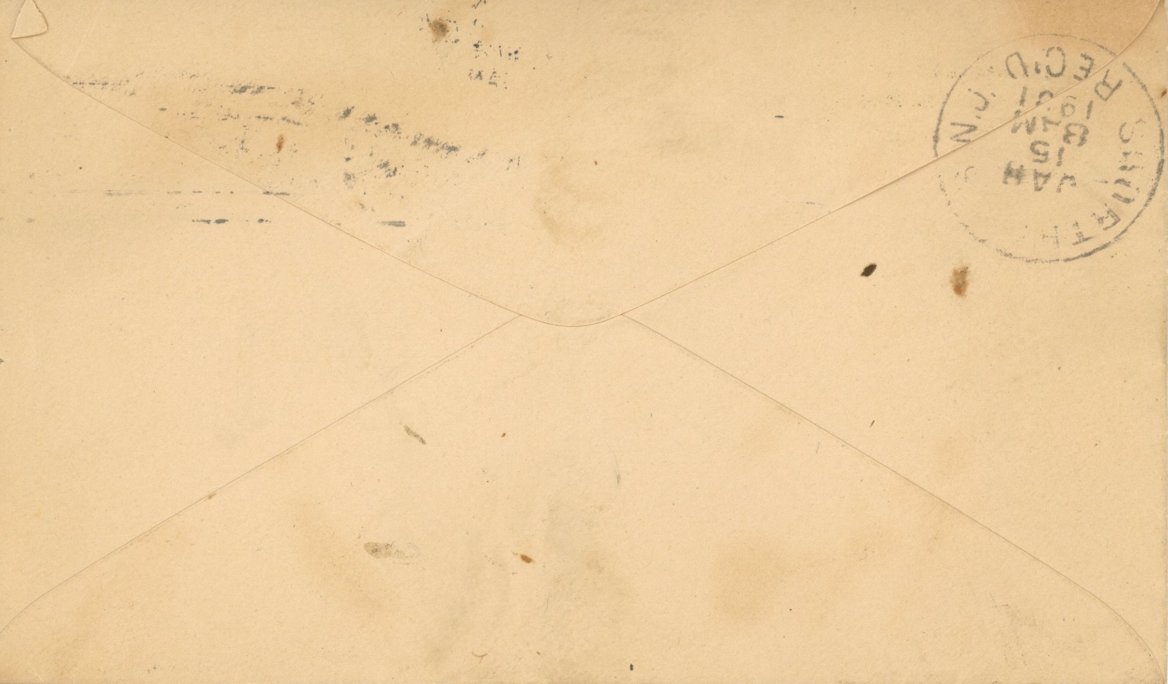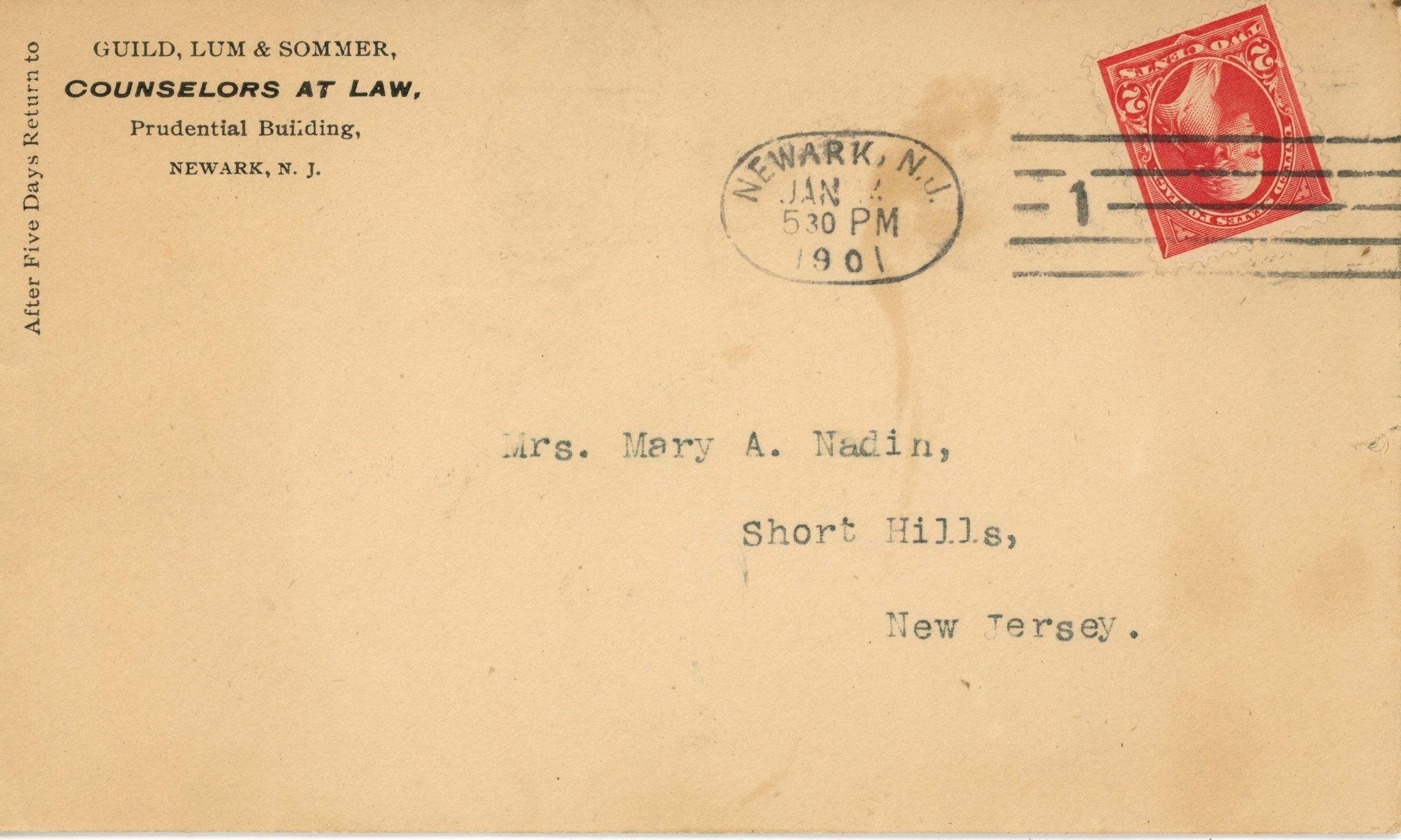 Postally used enveloped addressed to Mar. Mary A. Nadin, Short Hills New Jersey from Guild, Lum & Sommer, Counselors at Law, Prudential Buildings, Newark, N.J. postmarked Newark, N.J. January 14, 1901 at 5:30 pm and received Short Hills, N.J. January 15, 1901 at 8:00 am.
