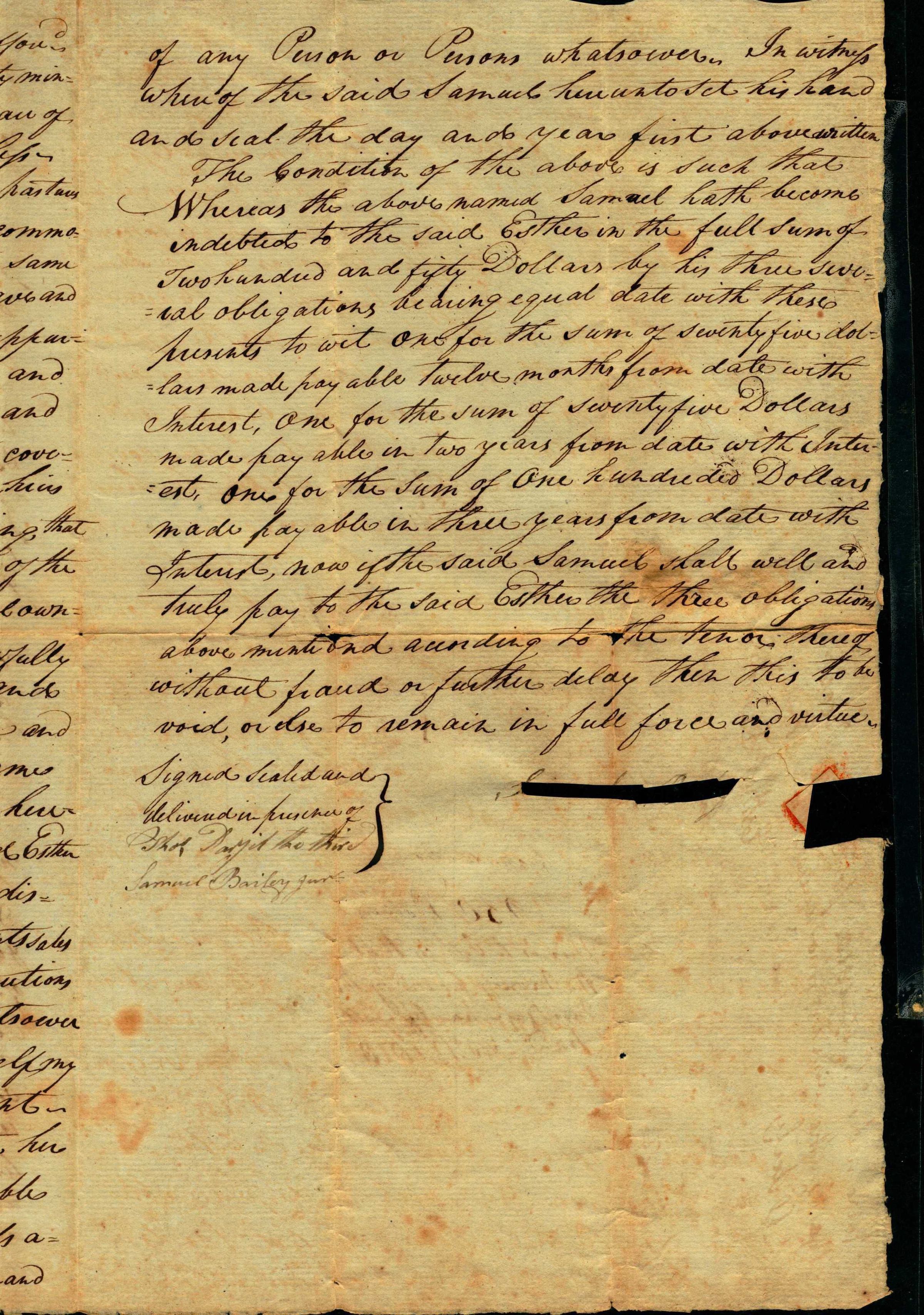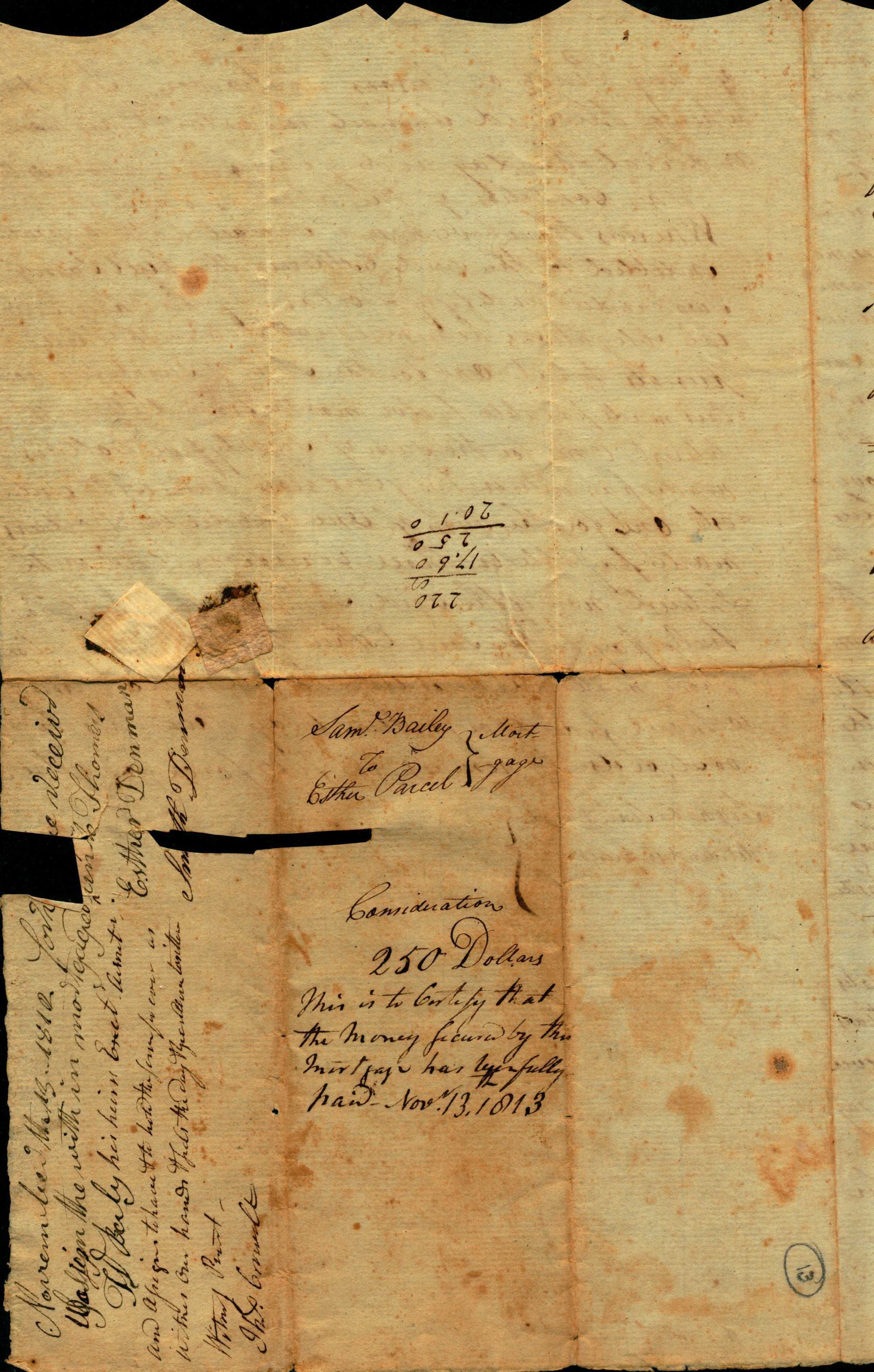 This indenture made this Eighteenth day of May Eighteen hundred and one by and between Samuel Bailey Serv. of the township of Springfield County of Essex and State of New Jersey of the one part and Esther Parcel of the same place of the other part Witnesseth. That the said Samuel for and in Consideration of the sum of Two hundred and fifty Dollars current money of the United States to me in hand paid by her the said Esther at or before the delivery here of the receipt of which I do hereby acknowledge and am therewith fully satisfied contracted and paid. Have given in granted bargain'd and Sold and by these presents Do give grant bargain sell (alien enfe off ) convey confirm unto the said Esther her heirs and assigns forever all the two following Tracts or lots of Land at Canoebrook place (aff) One Lot beginning in the line of Thomas Parcel Dec.d on the north edges of Canoebrook, thence along (?) line south seventy degrees East, eight chain forty two links, there north sixty degrees twenty five minutes east seven chains twelve links, to the line of the hairs of Martha Edwards Dec.d thence along said line north thirty nine degrees forty minutes west twelve chain to the north bank of Canoebrook again, thence down s. (degrees) Brook to the Place of beginning containing nine acres one quarter and thirty two rods strict meansures. Also an other Lot beginning in the middle of the Ridge road in the line of Thomas Parcel Dec.d thence along that line and s. (degrees) Bailey south fifty three degrees forty five minutes east, twelve chain twenty six links to the line of Brain-and-Dickinson, thence along his line north forty six degrees fifty minutes east three chain thirty one links to the line of Thomas Gildersleeve thence along his line north forty seven degrees twenty nine minutes west, eleven chain twelve links to the road....