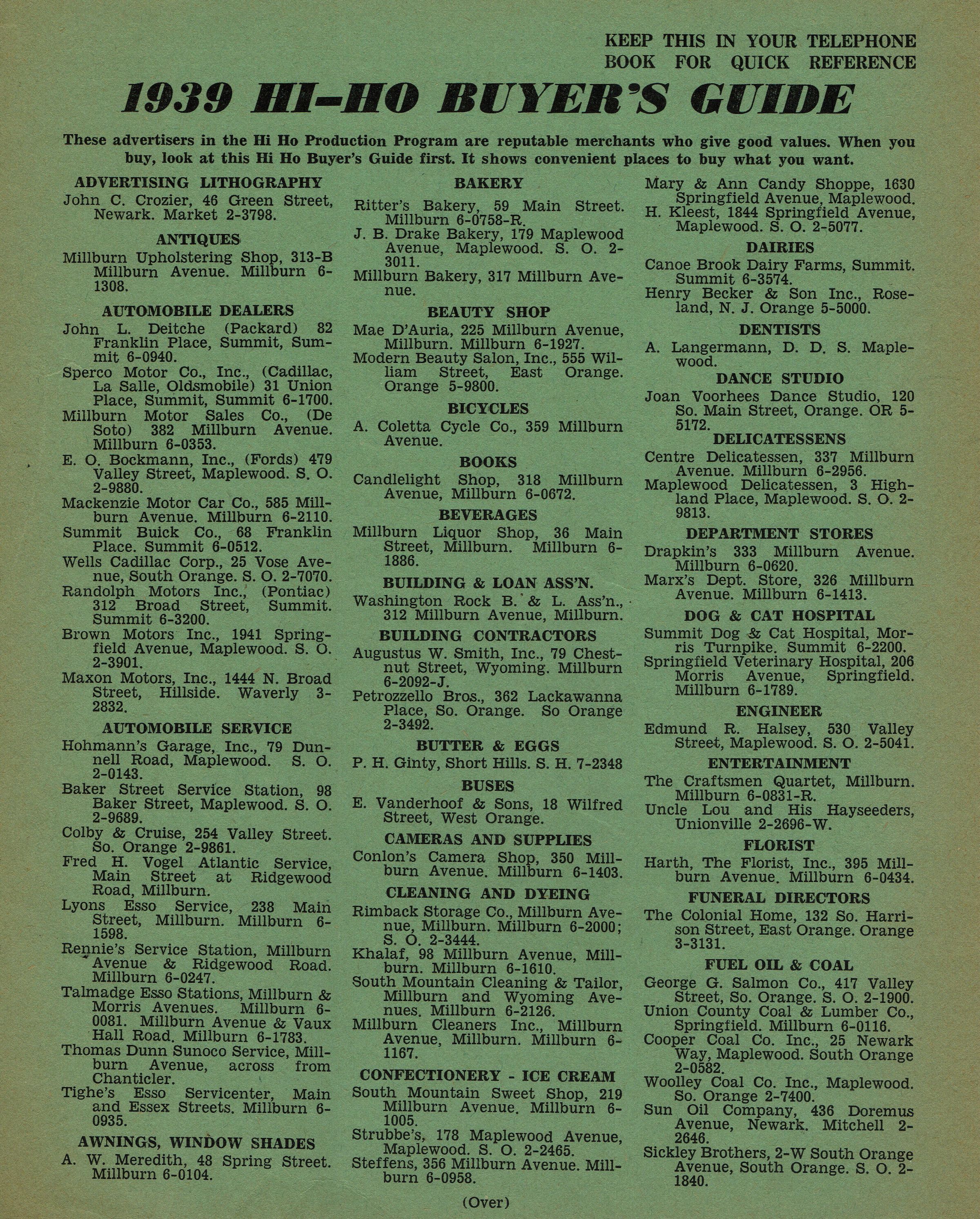 Contains 2 page 1939 Hi-Ho Buyers Guide, list of advertisers and local businesses.