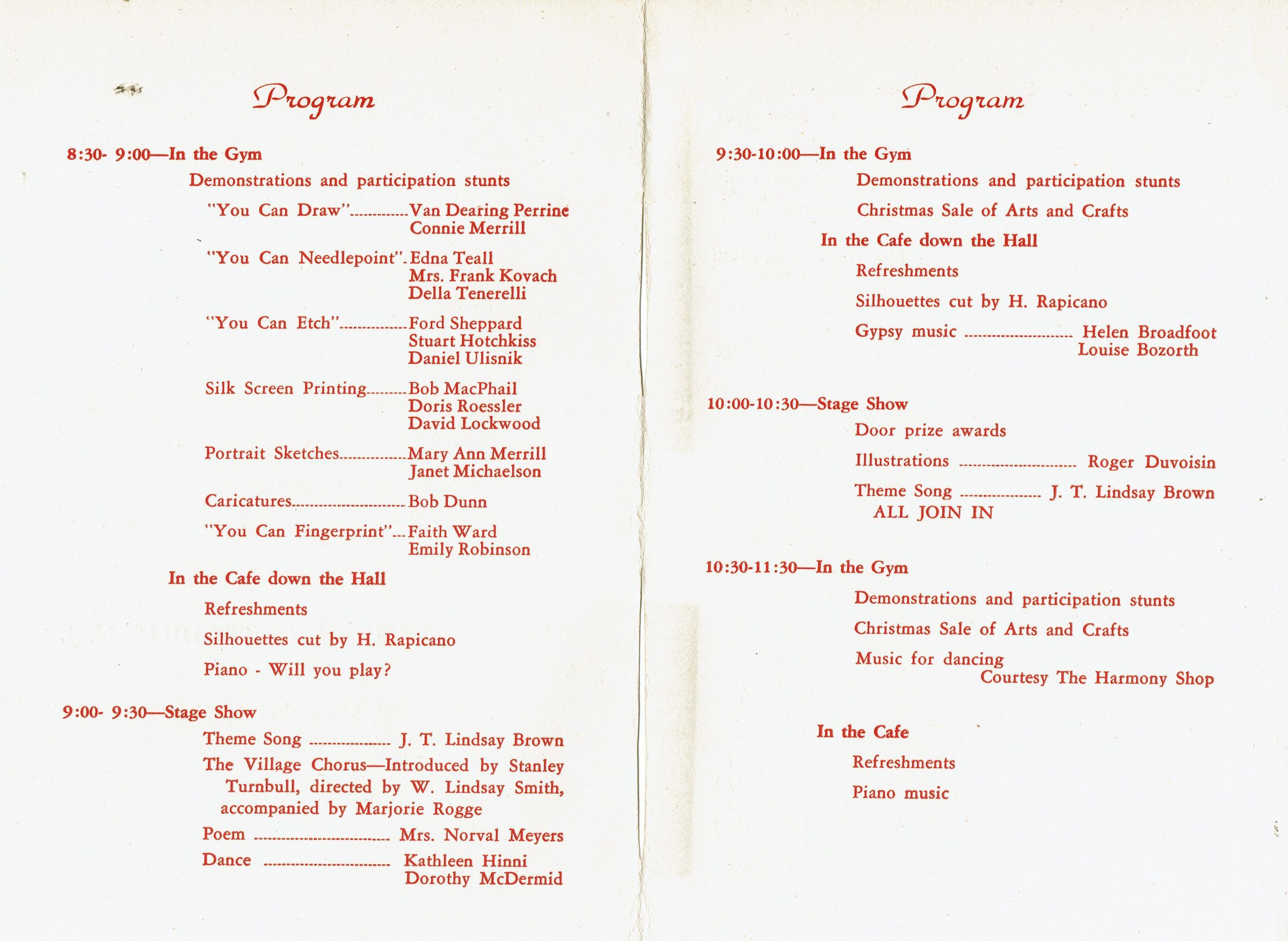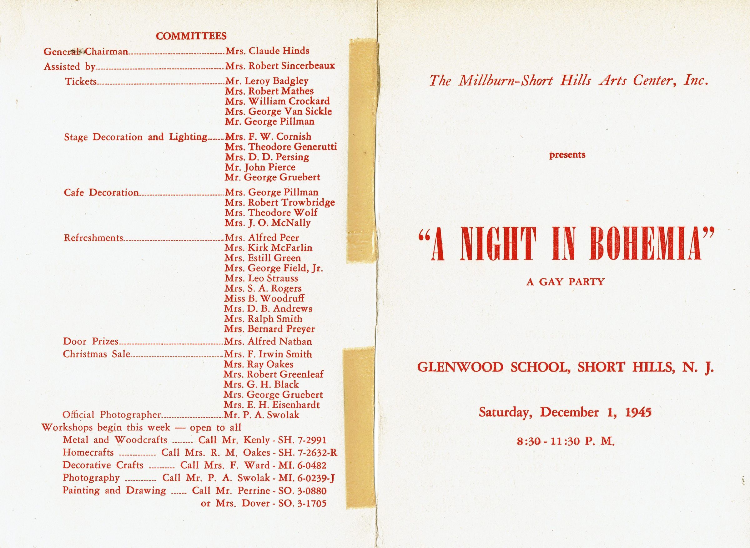 Archive Entry Archive Entry Go back Prev Item Next Item Millburn Art Center: Night in Bohemia Program, 1945 Publication Entry/Object ID2023.214.056CollectionMillburn Art CenterAcquisitionAccession2023.214DimensionsDimension DescriptionFoldedHeight6-1/4 inWidth4-1/4 in