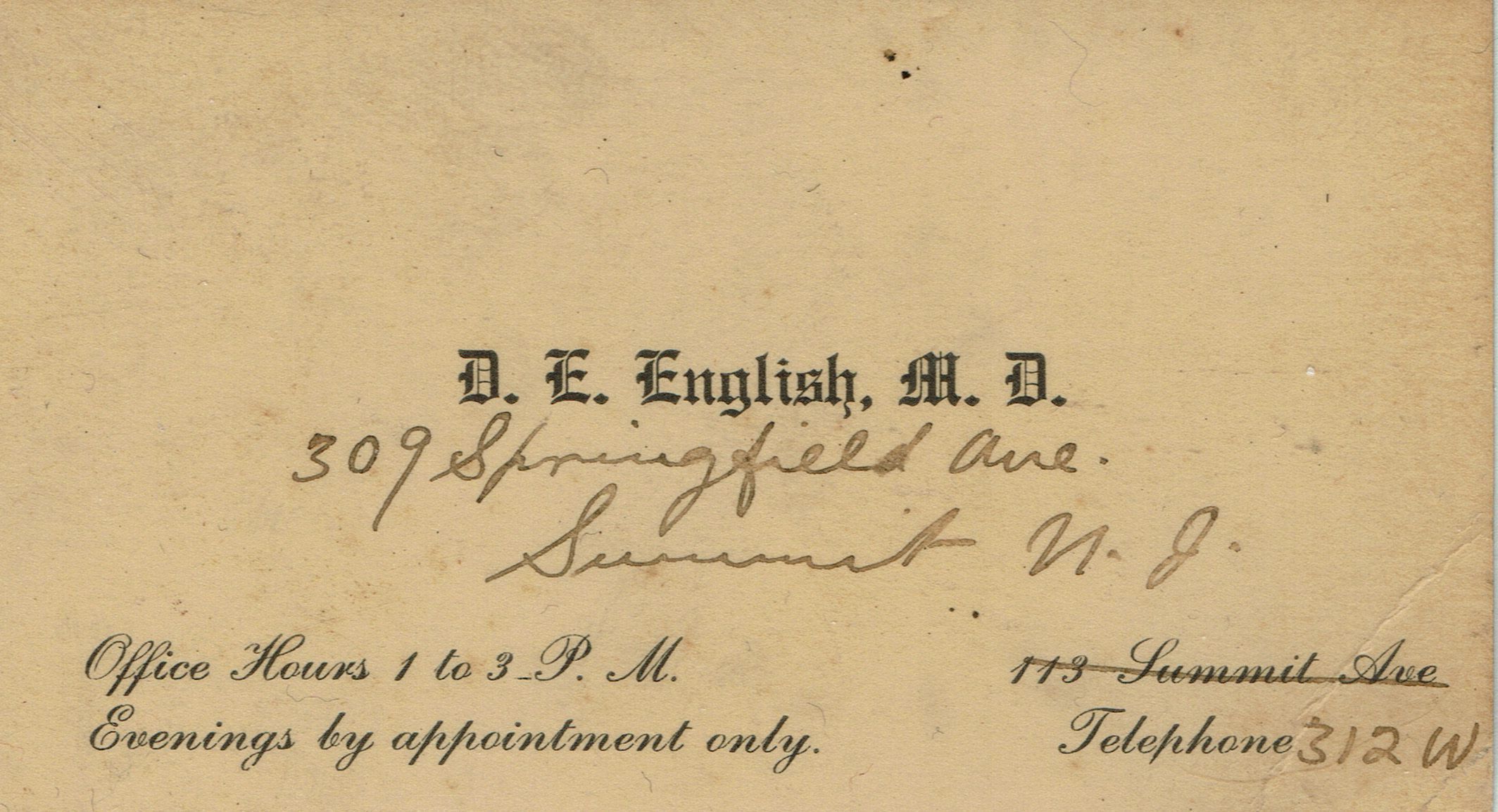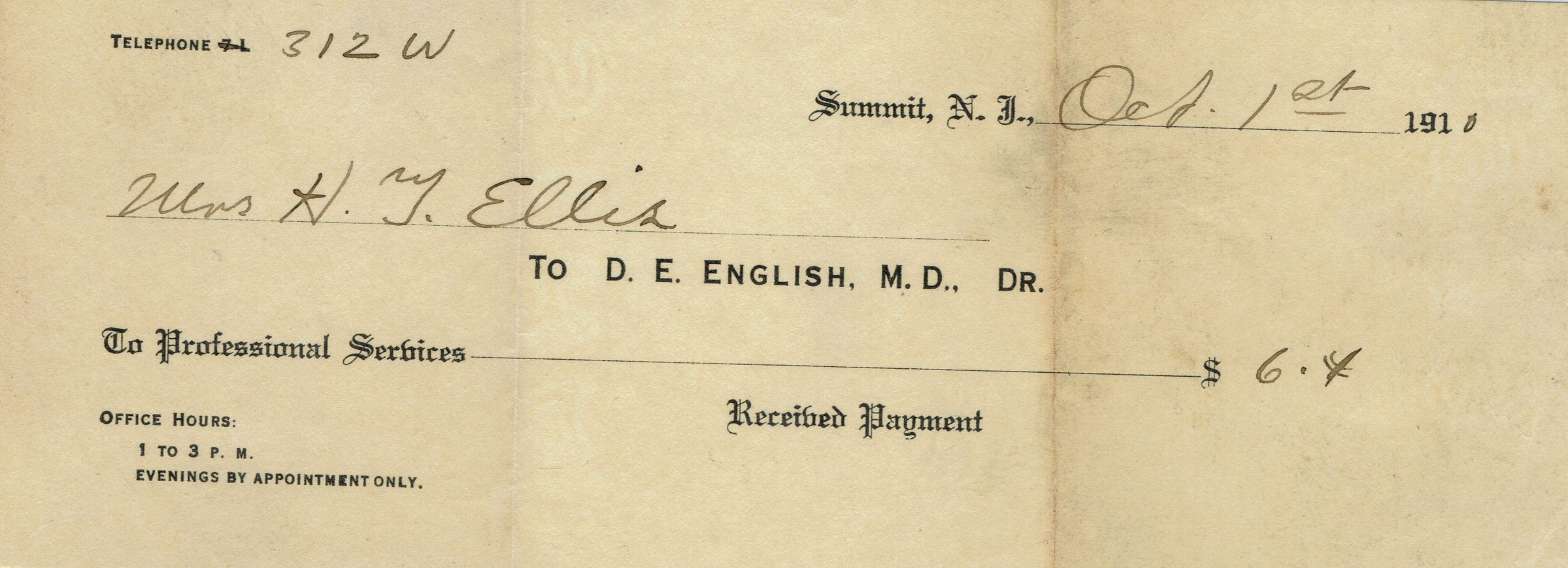Receipt for Professional Services from D.E. English M.D. to Mrs. H. J. Ellis, dated October 1, 1910 and business card from D.E. English, M.D. 309 Springfield Avenue, Summit, NJ.