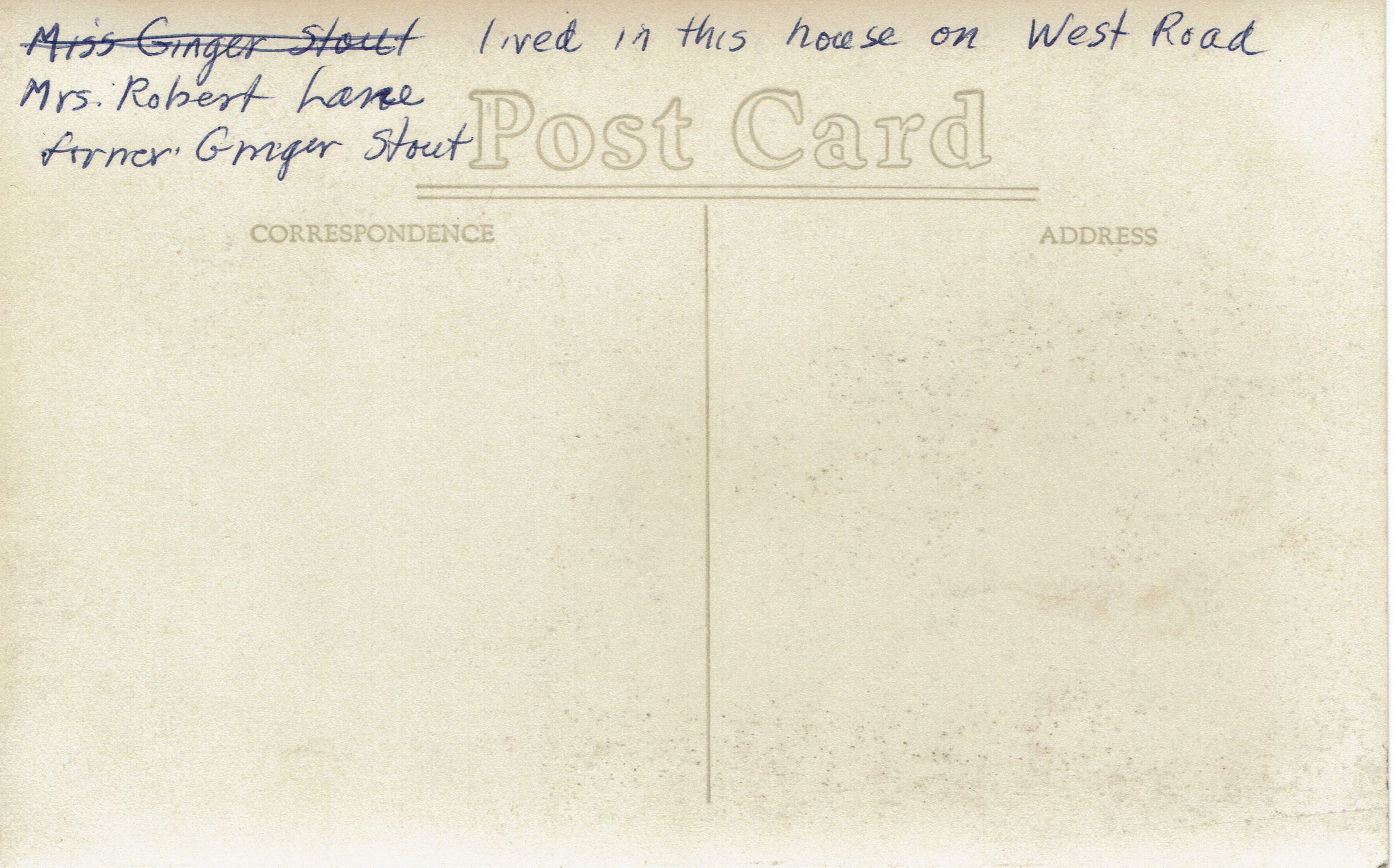 Photographic postcard identified by inscription on verso: "Mrs. Robert Lane, former Ginger Stout, lived in this house on West Road."