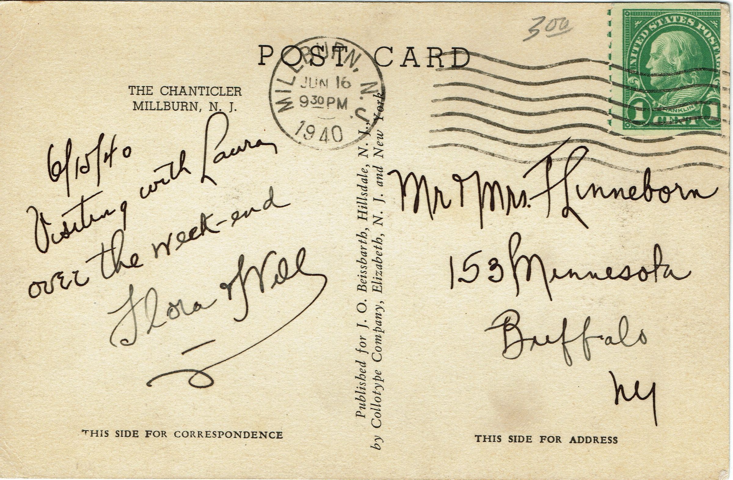 B&W Postcard of The Chanticler Restaurant, Millburn. Message dated June 15, 1940, "Visiting with Laura over the week-end." Signed Flora (?) and addresed to Mr. and Mrs. F. Linneborn, 153 Minnesota, Buffalo, NY. Postmarked Millburn, NJ June 16, 1940, 9:30 pm.